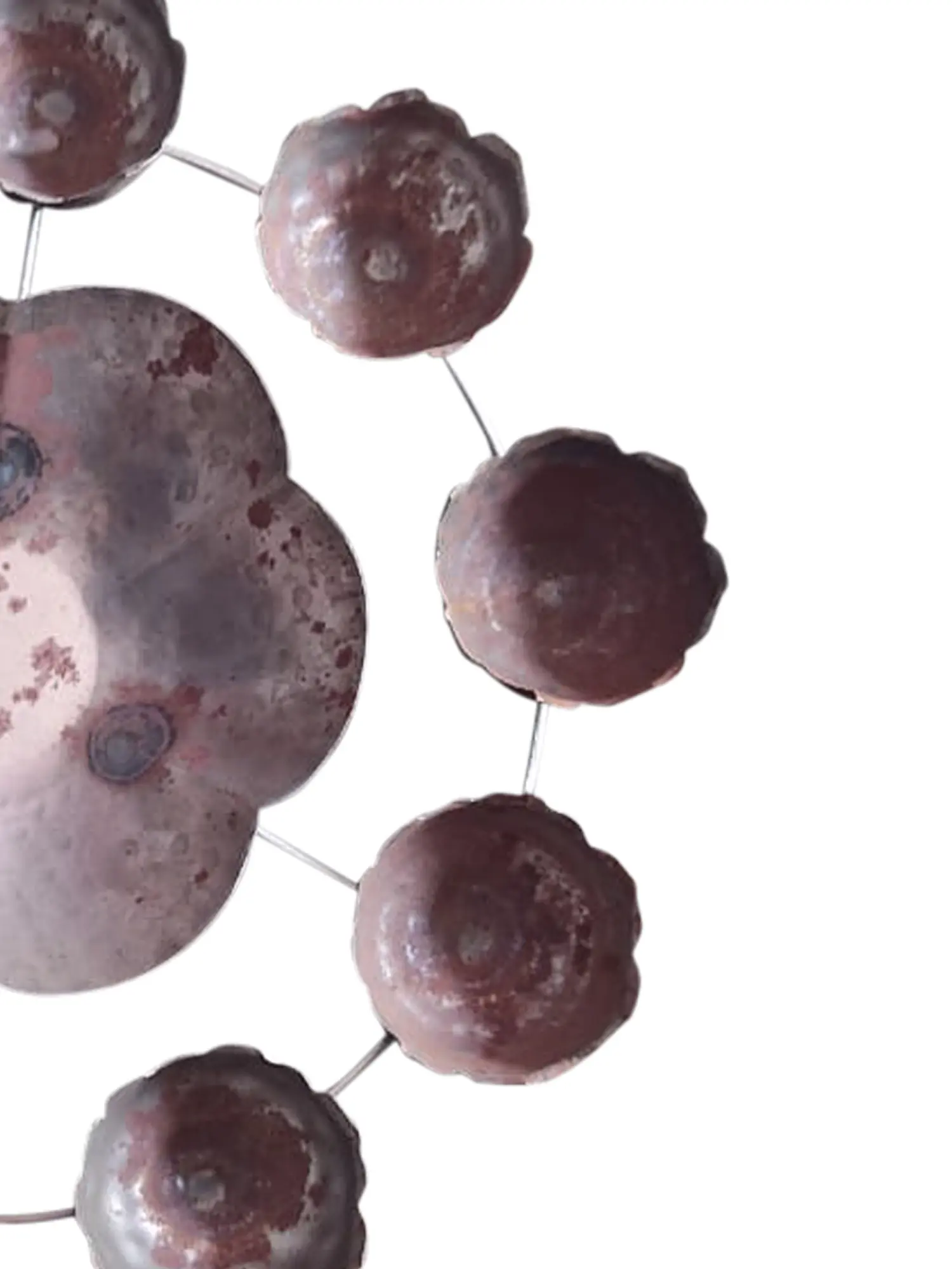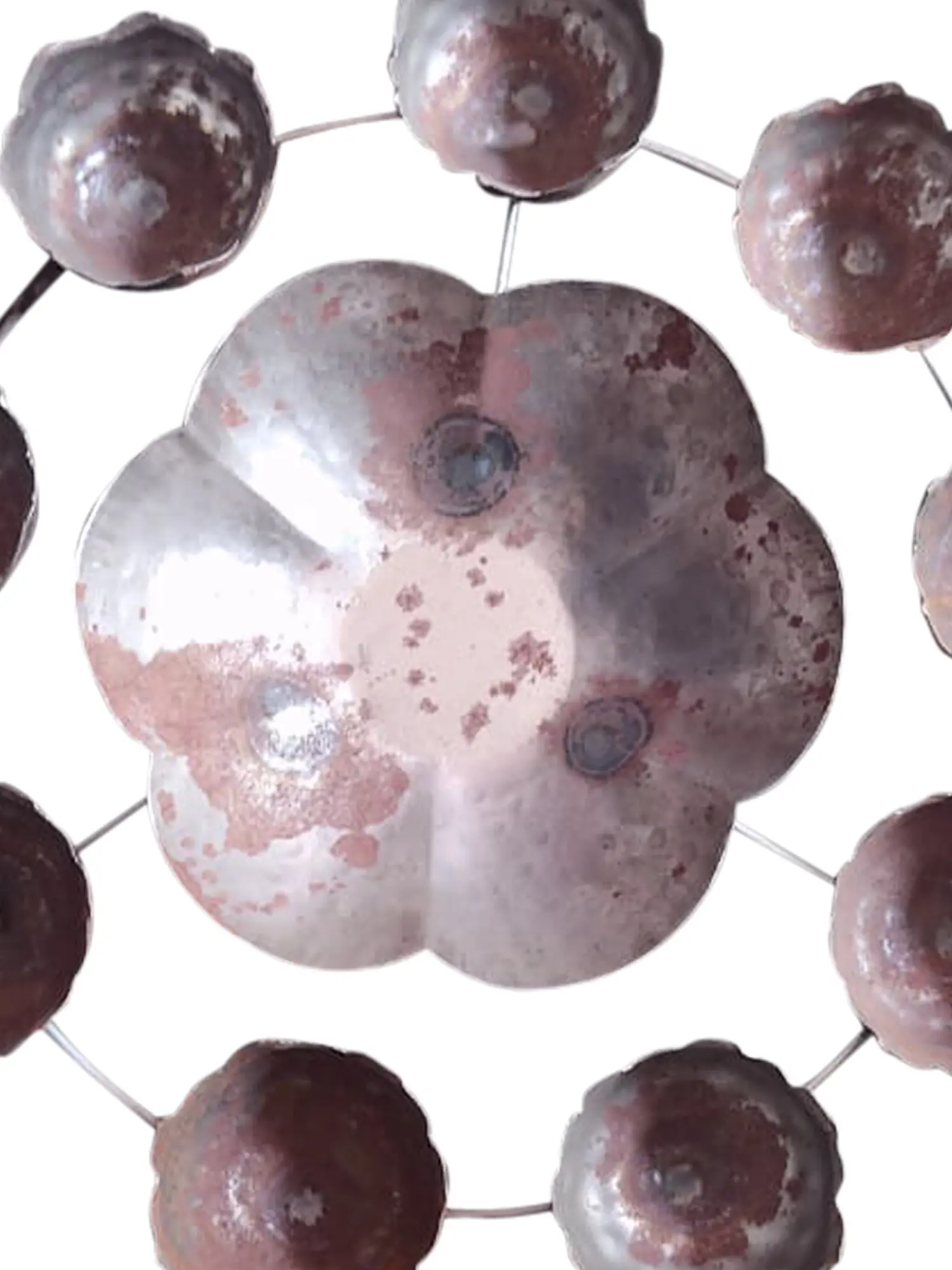 The Iron Urli with Small Flowers Candle Stand exhibits ingenious design, blending rustic charm with cosmic symbolism. The central arrangement cleverly resembles the sun, surrounded by smaller flowers symbolizing the nine planets in orbit. This smart incorporation of celestial elements infuses the piece with a unique and profound narrative. The rustic feel of iron adds authenticity, enhancing the overall aesthetic.