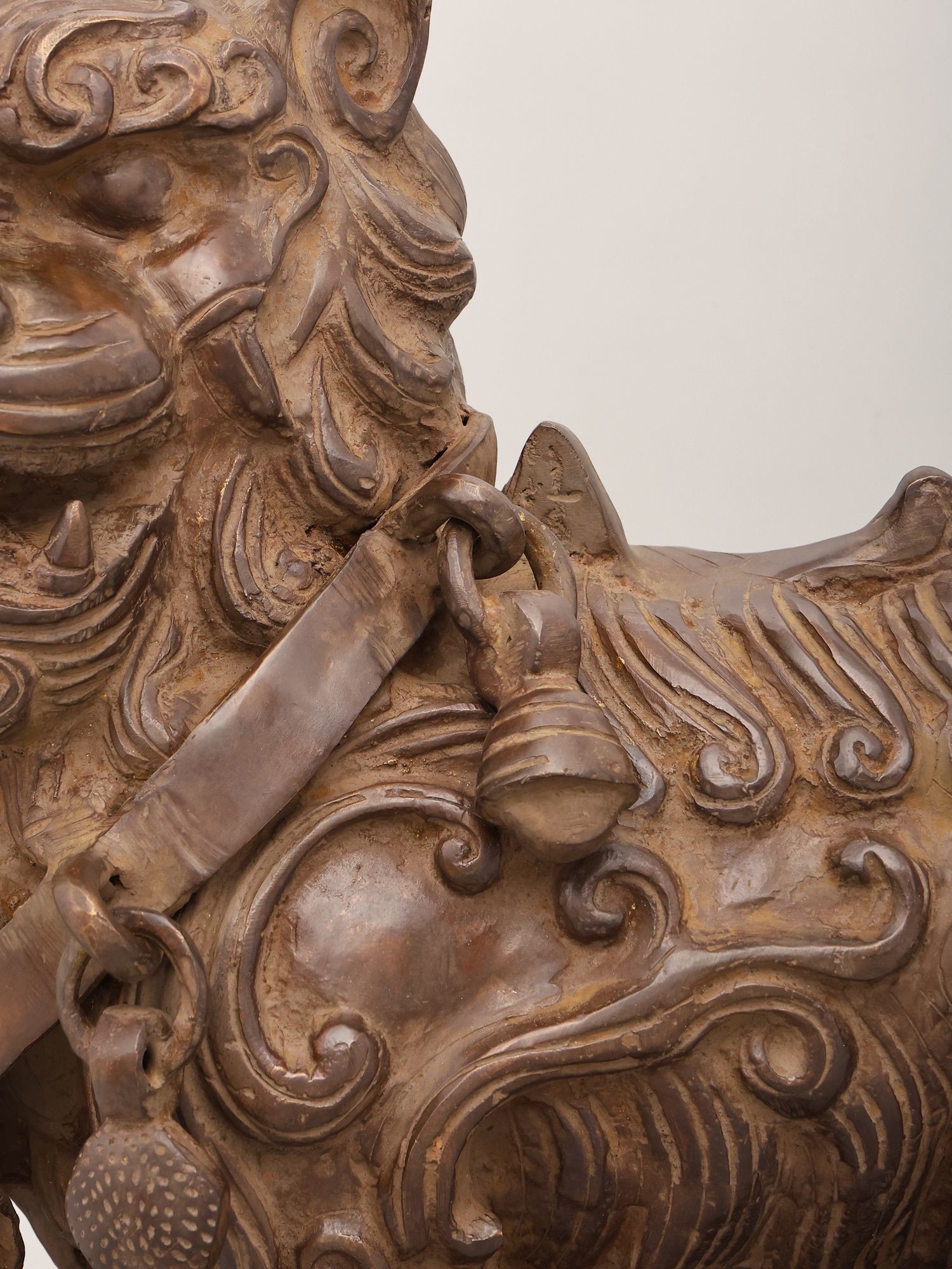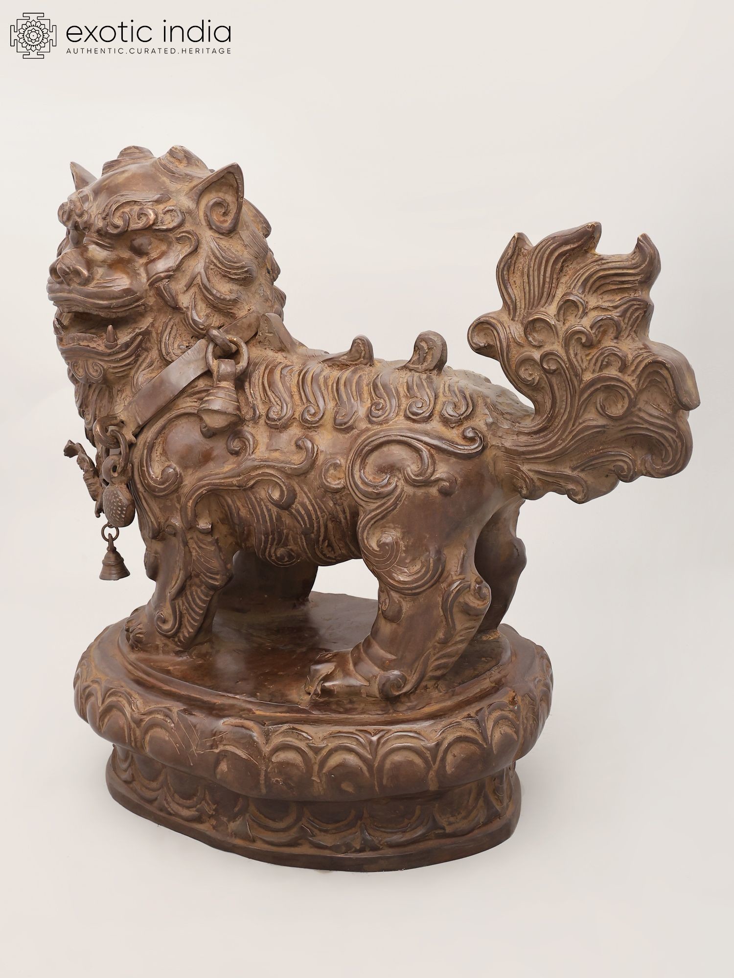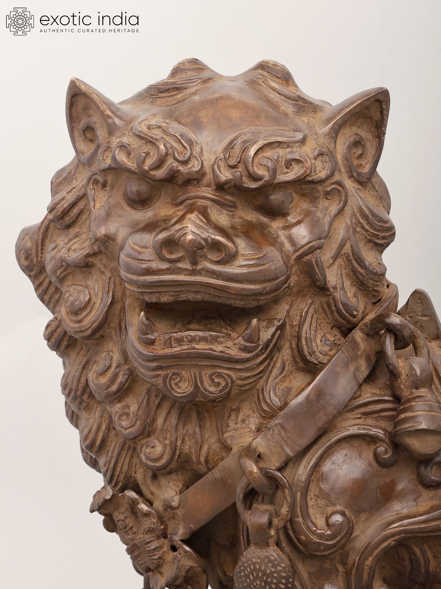 Imposing 24-inch tall brass statue depicting a Chinese Guardian Lion, also known as a Foo Dog.