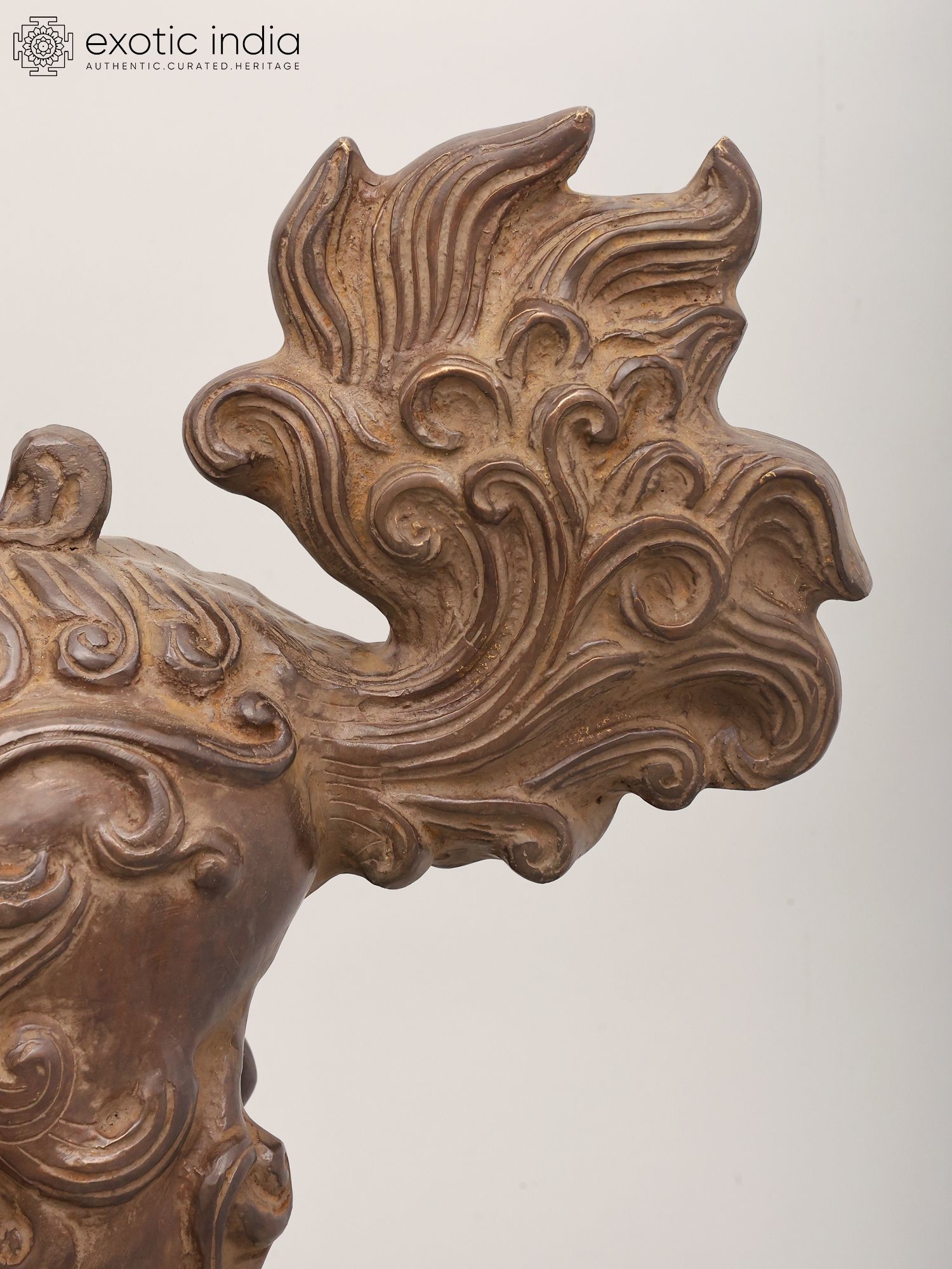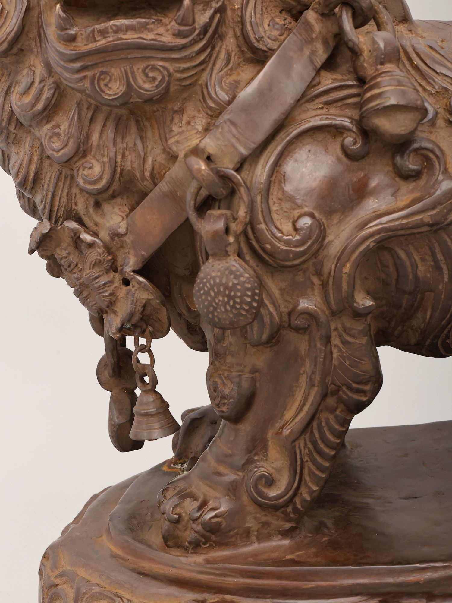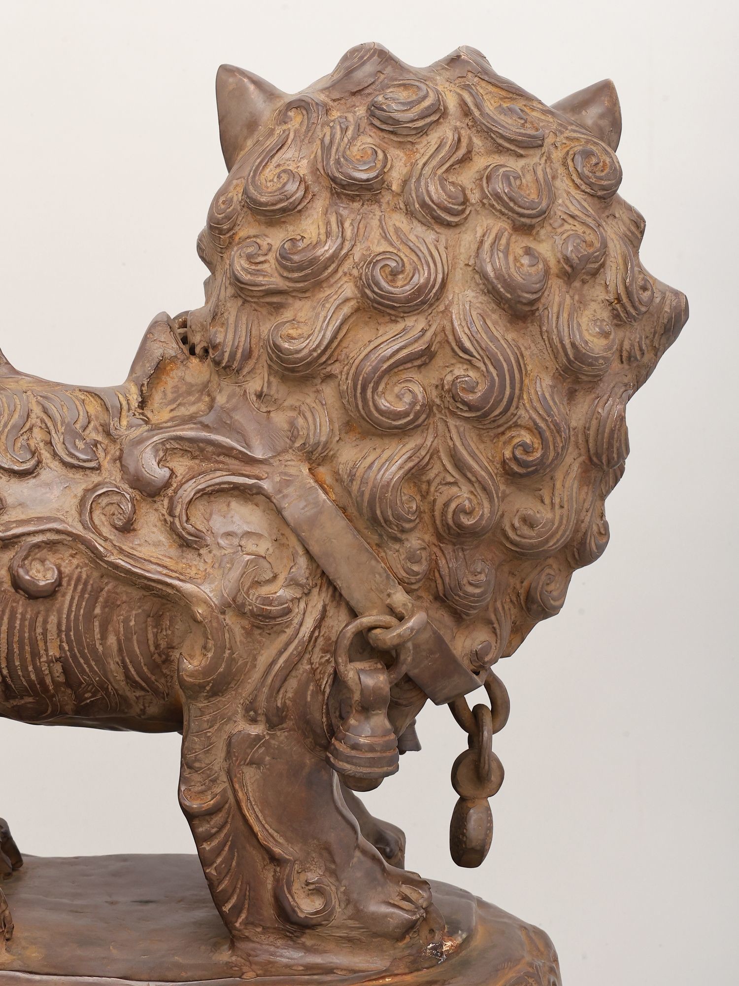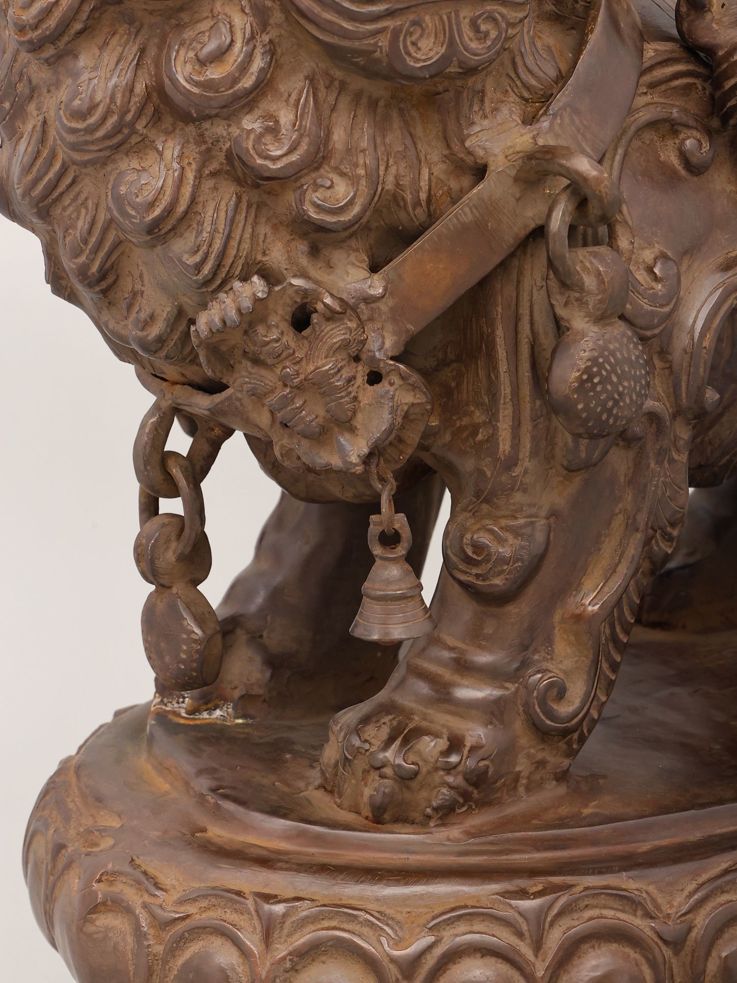 Imposing 24-inch tall brass statue depicting a Chinese Guardian Lion, also known as a Foo Dog.
