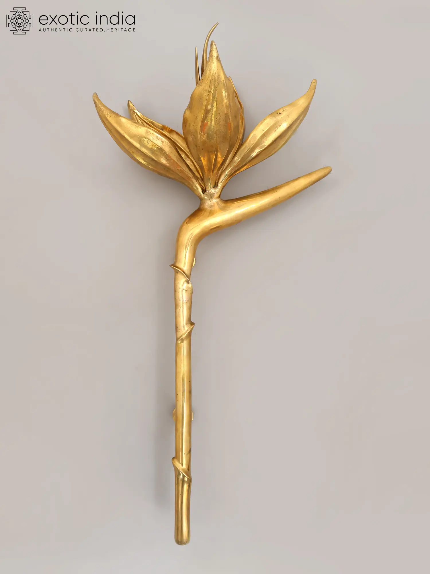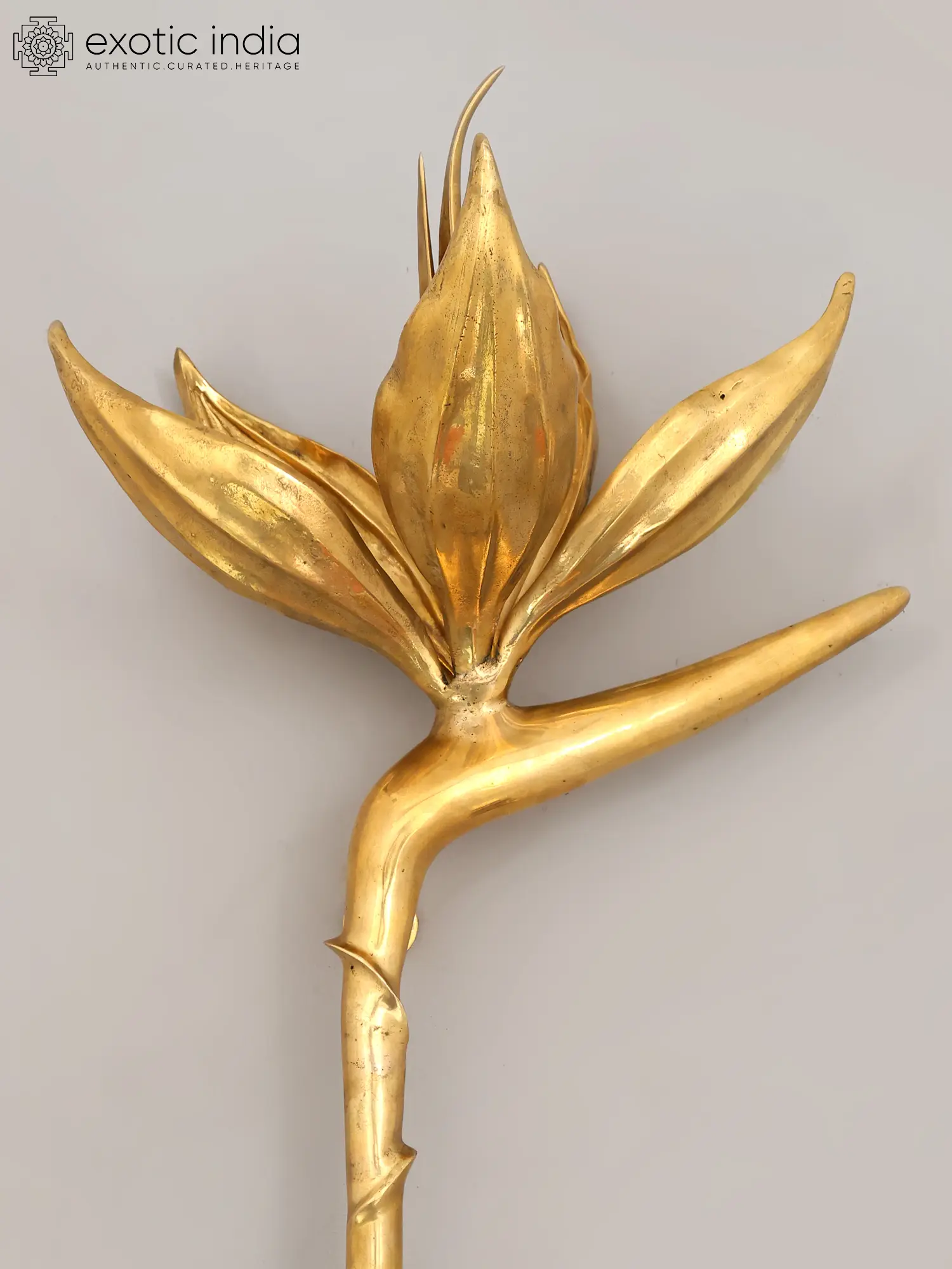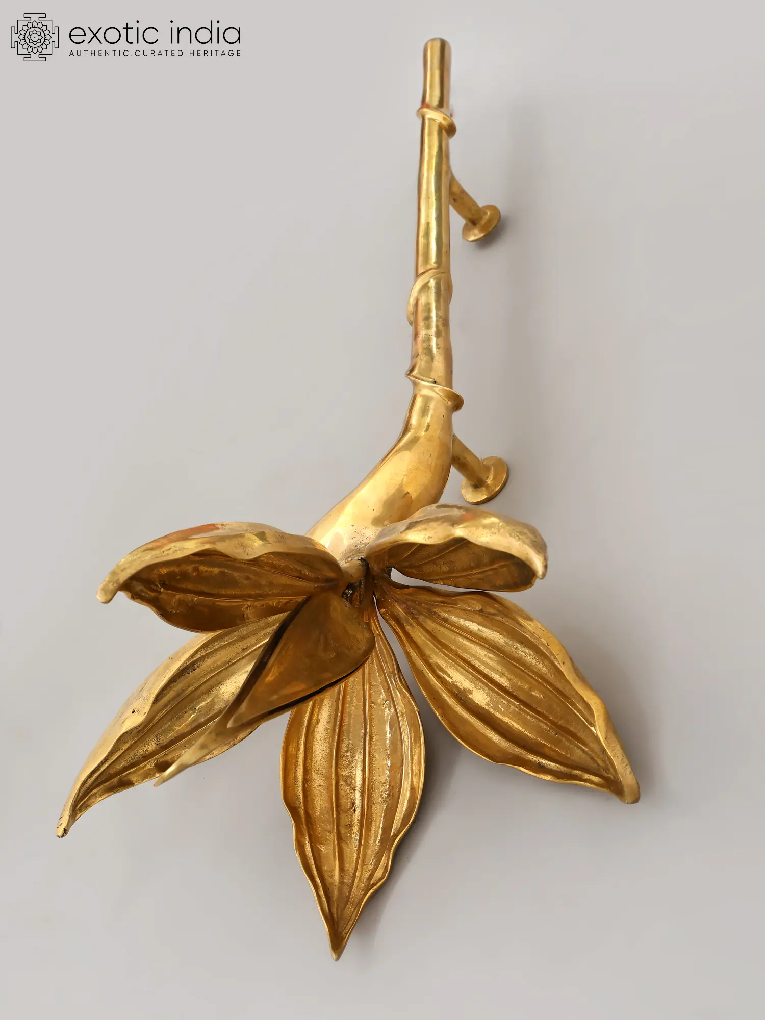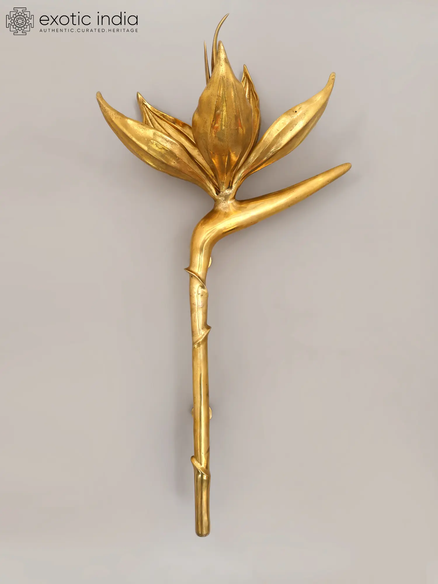 The design unfurls like a blooming lotus, its petals gracefully reaching outwards, while the supporting stem exhibits a natural, vine-like twist. This impressive form stands at a commanding 32 inches in height, with a width of 15 inches and a projection of 10 inches, ensuring it makes a significant visual impact. The lustrous brass finish catches the light, highlighting its intricate details and adding a radiant glow to any surface it adorns.