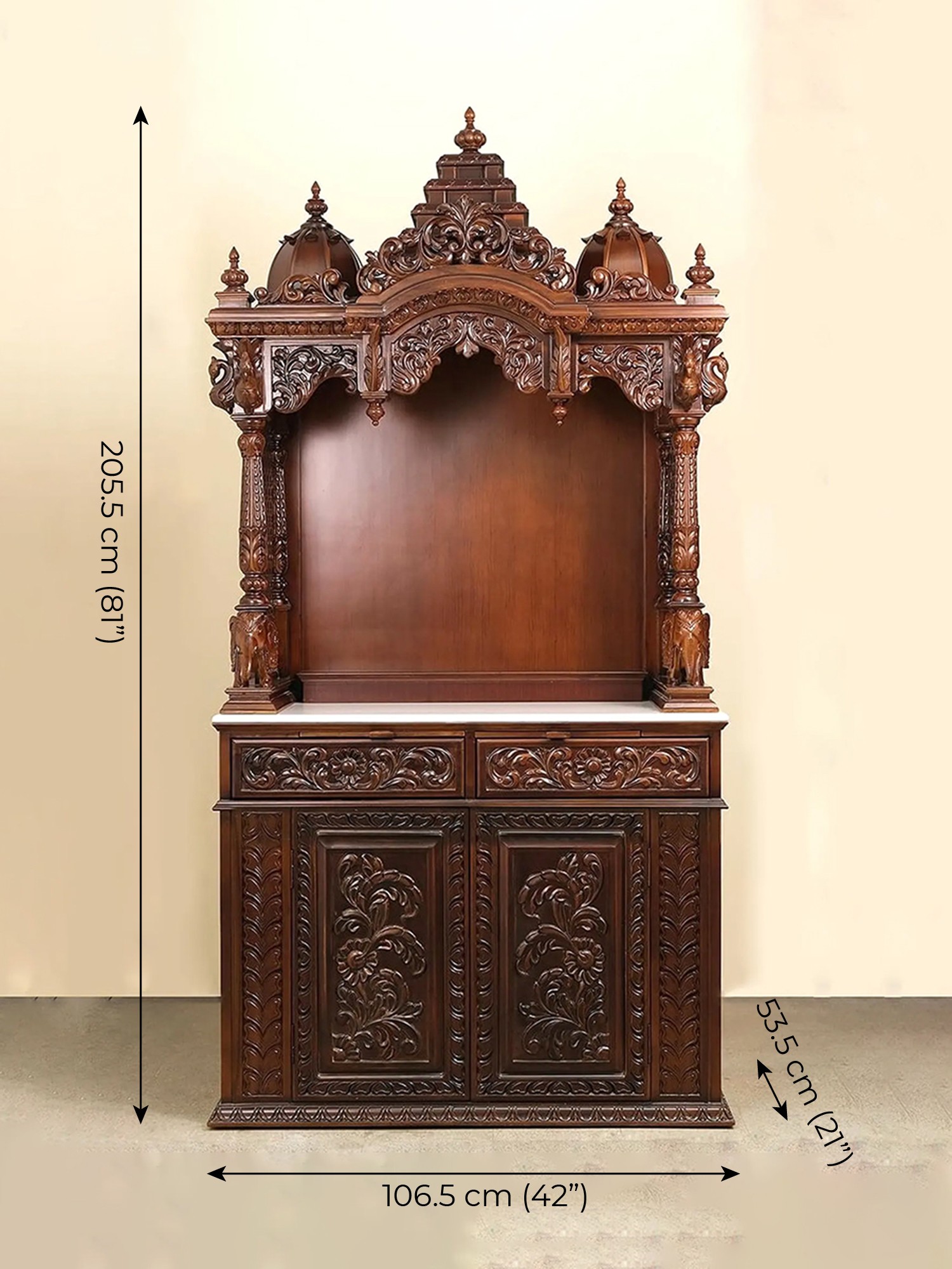 The base of the wooden Mandir contains enriching foliage on the drawers and storage space, giving an artistic touch. The lacquered wood is complemented by white marble on the platform, which you can decorate for your daily rituals and experience the presence of the divine with this masterpiece from Exotic India.