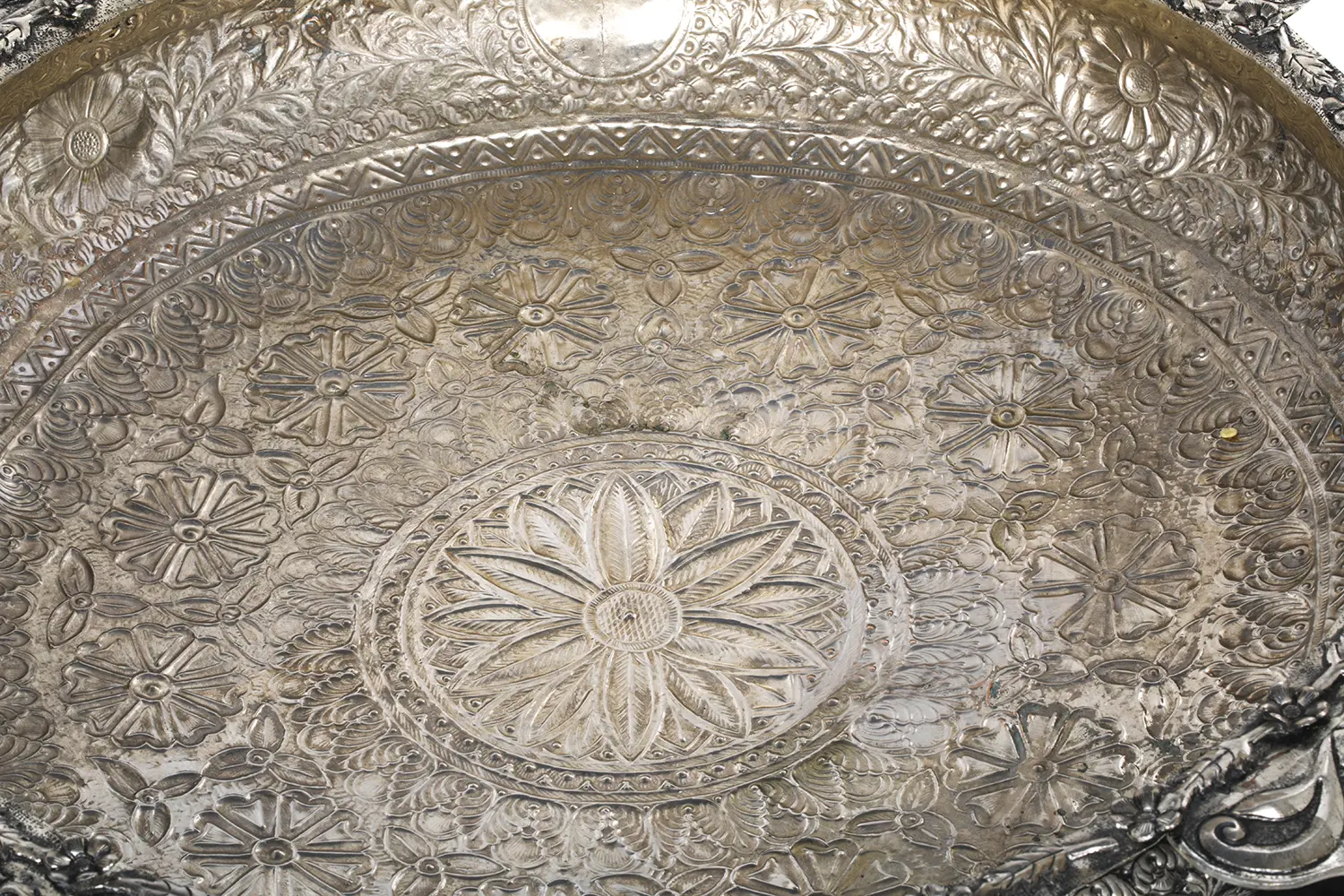 The large sized urli shown here is filled with intricate floral patterns all over the circumference and a stylized flower band at the brim enhances the minutest beauty of this statue. Apart from being an ornamentation, this urli is also considered to be auspicious because of the presence of four elephant heads in all four directions, as elephants are considered to bring good luck, happiness and prosperity. You won’t be able to stop your yourself from praising the rich and elegant engravings on these elephant heads along with the four handles complementing its inclined four legs, fashioned beautifully.