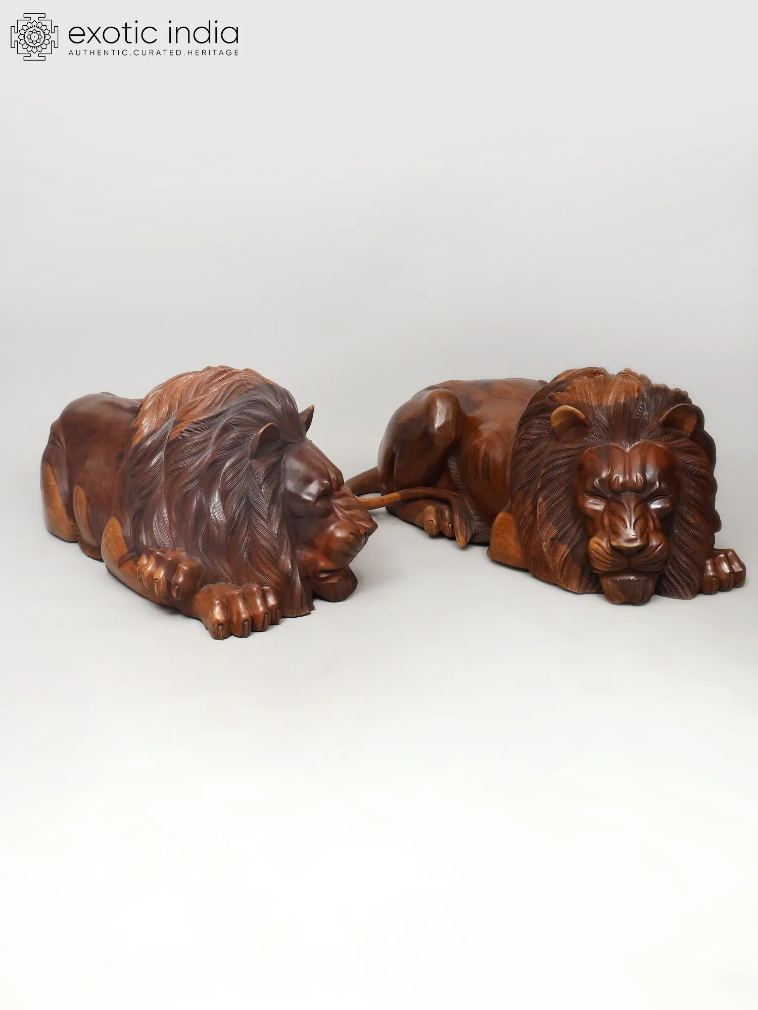 Large Wood Carved Lion Pair | Majestic Animal Sculptures
