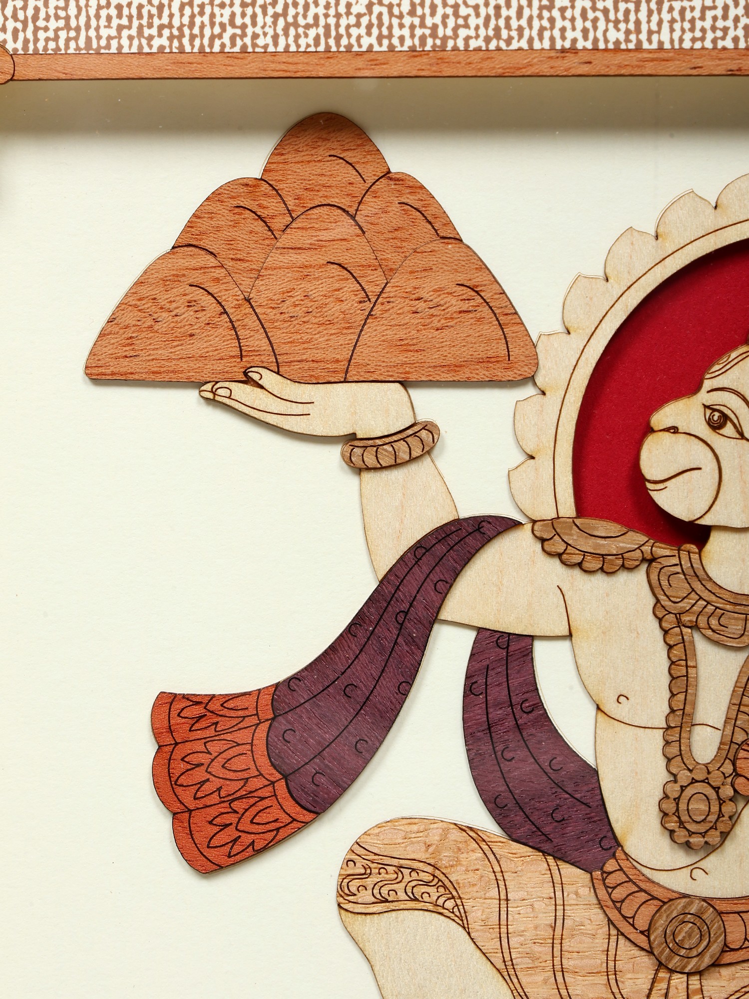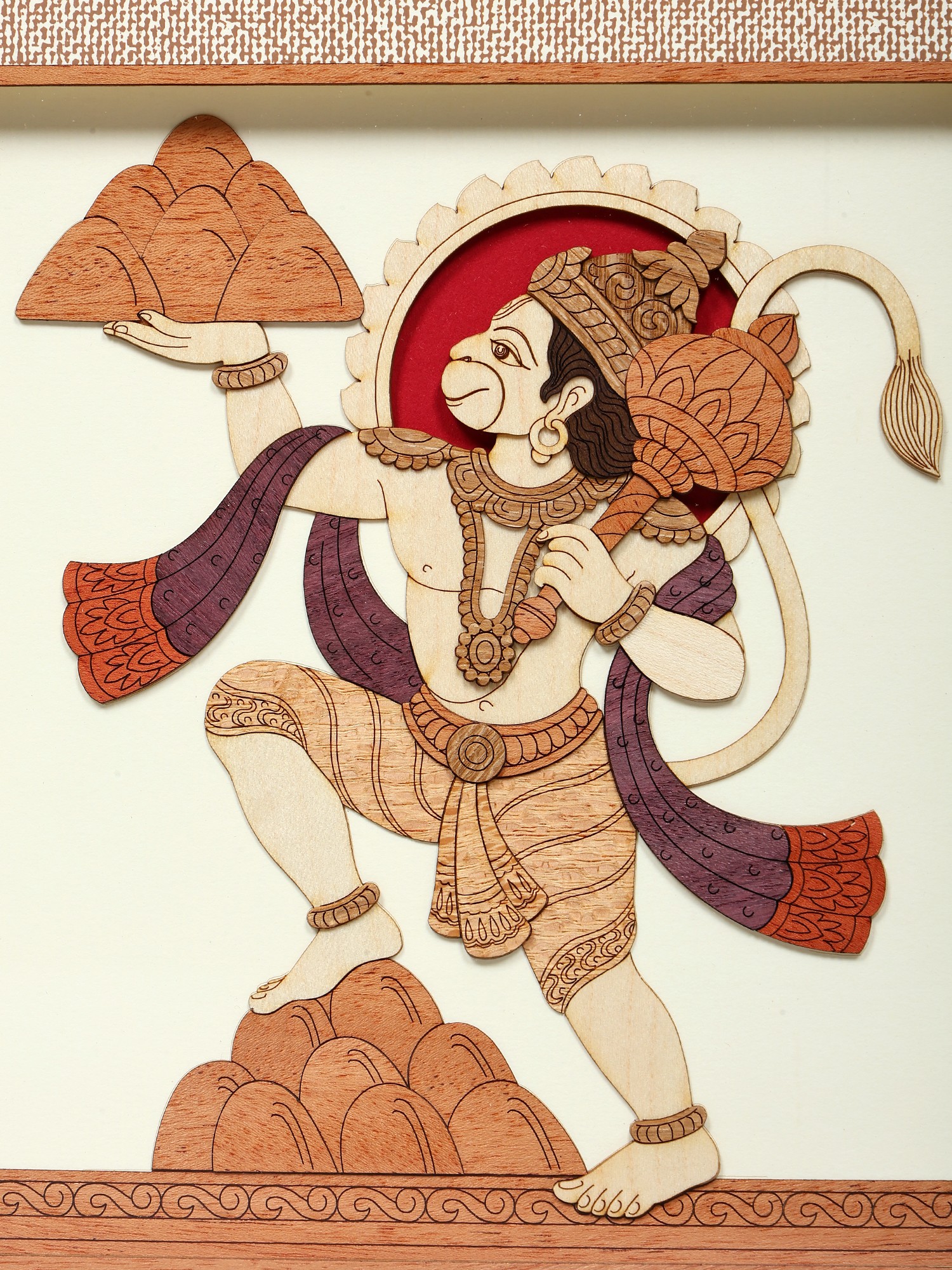 The smart use of marquetry not only captures the essence of the epic tale but also elevates the piece's aesthetic appeal. This wall hanging becomes a symbolic and artful rendition, showcasing Lord Hanuman's devotion and strength with a harmonious blend of traditional technique and contemporary elegance.
