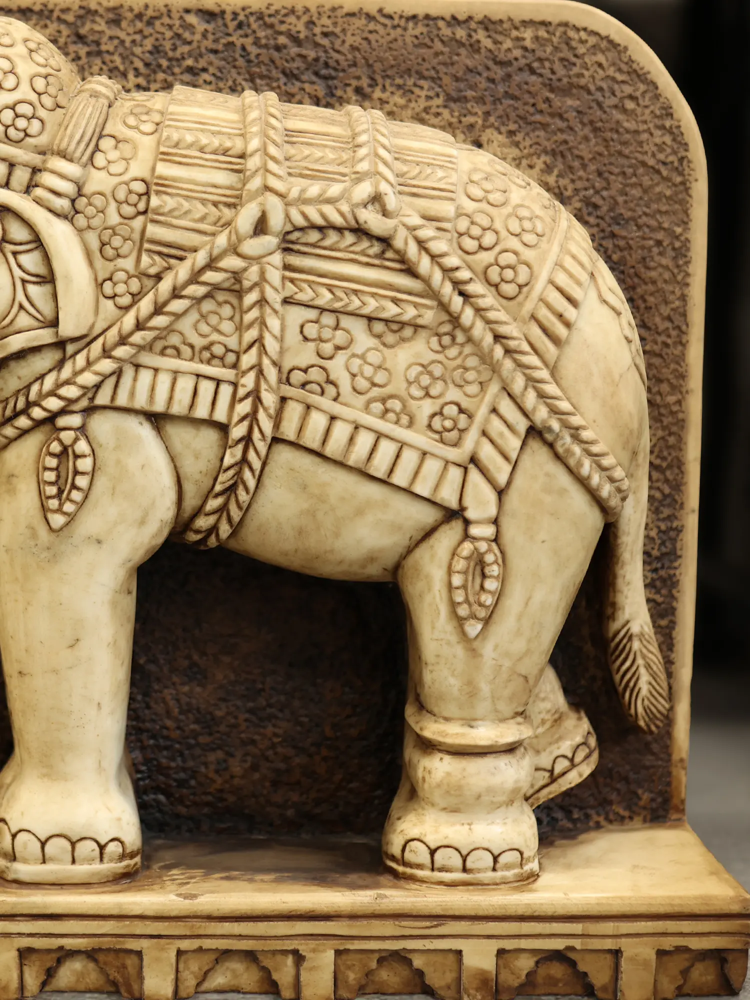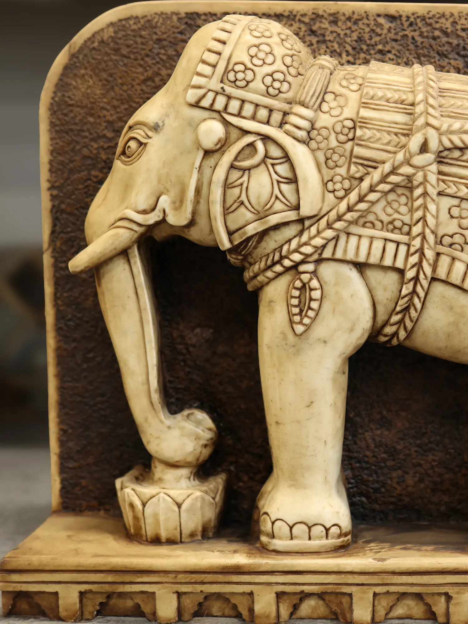 Observe the finely rendered ornamentation adorning each elephant, from the elaborate coverings and chains to the delicate floral patterns. The expressive eyes and powerful stances convey a sense of nobility and wisdom. These pieces stand as a testament to the rich tradition of Indian artistry, with their substantial yet elegant proportions designed to command attention without overwhelming your decor.