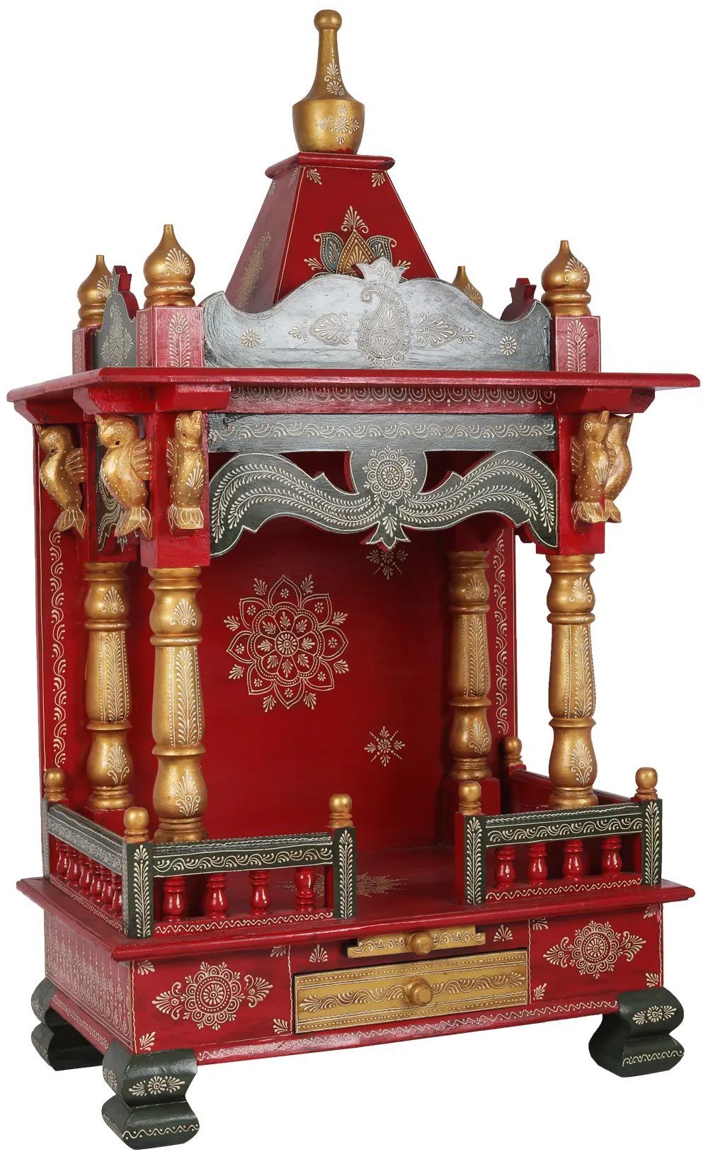 Rangoli-esque patterns grace the compact interior of the temple. Predominantly a vivid crimson, the patterns are finely done in a solid white colour. Four pillars dyed a lustrous gold would contain the presence of your deities within the temple. Across the top of the frontal pillars is a dramatically carved panel of green embossed with matching white patterns that are superbly pleasing to the eye. Winged creatures of mythical origin, their bodies the colour of gracious gold, protrude from the exterior faces of the tops of each of the pillars.