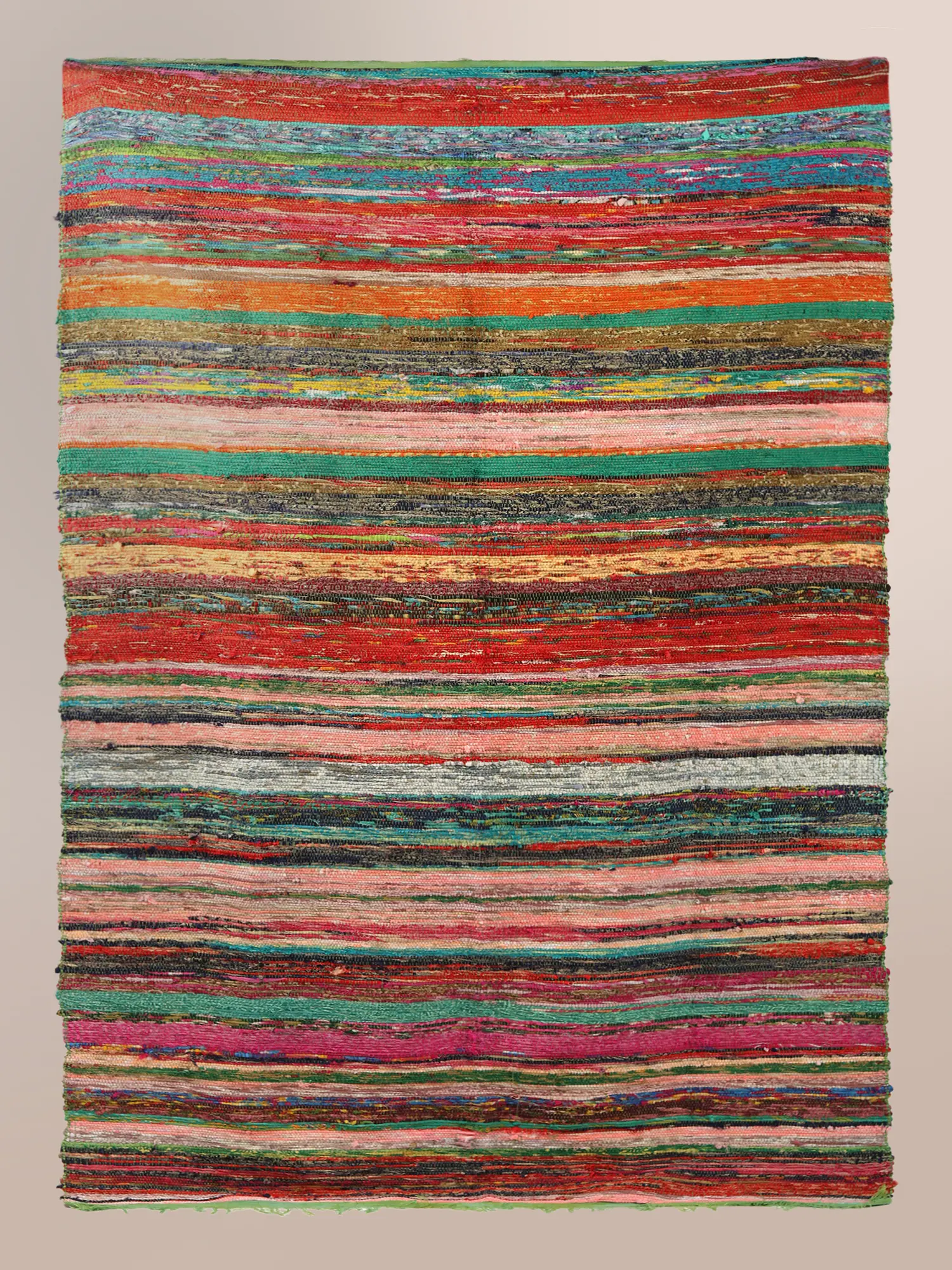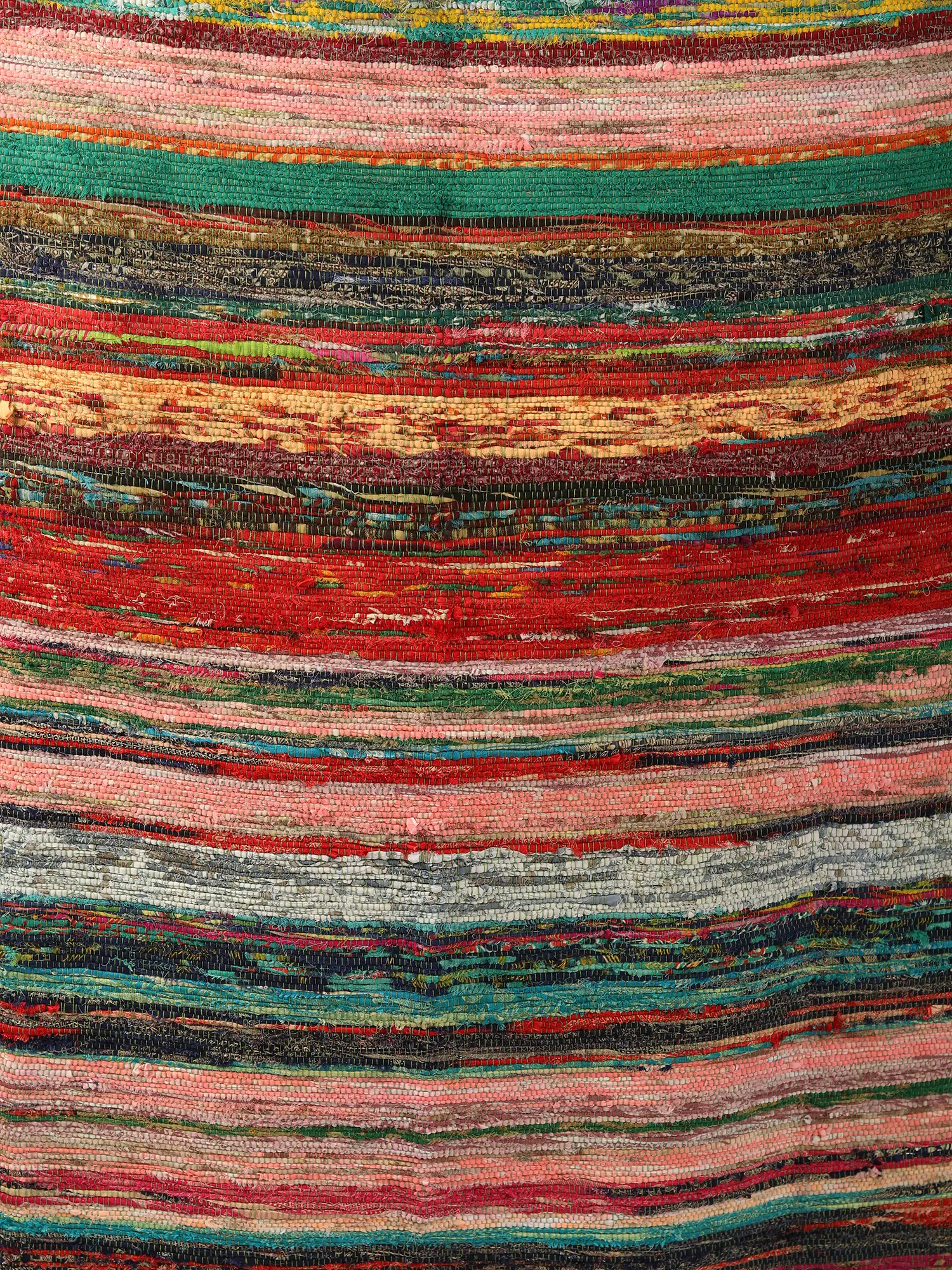 Sustainability is the new and only way to preserve the environment and this Multicolor Cotton Recycled Chindi Dhurrie, adorned in an all-over stripes pattern is the practical solution that enables people to practice sustainability. This eco-friendly masterpiece not only enhances your space with vibrant multicolor charm but also boasts numerous benefits. Crafted from recycled cotton, it champions environmental responsibility, making it an environment-conscious object for any home.