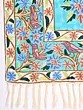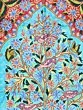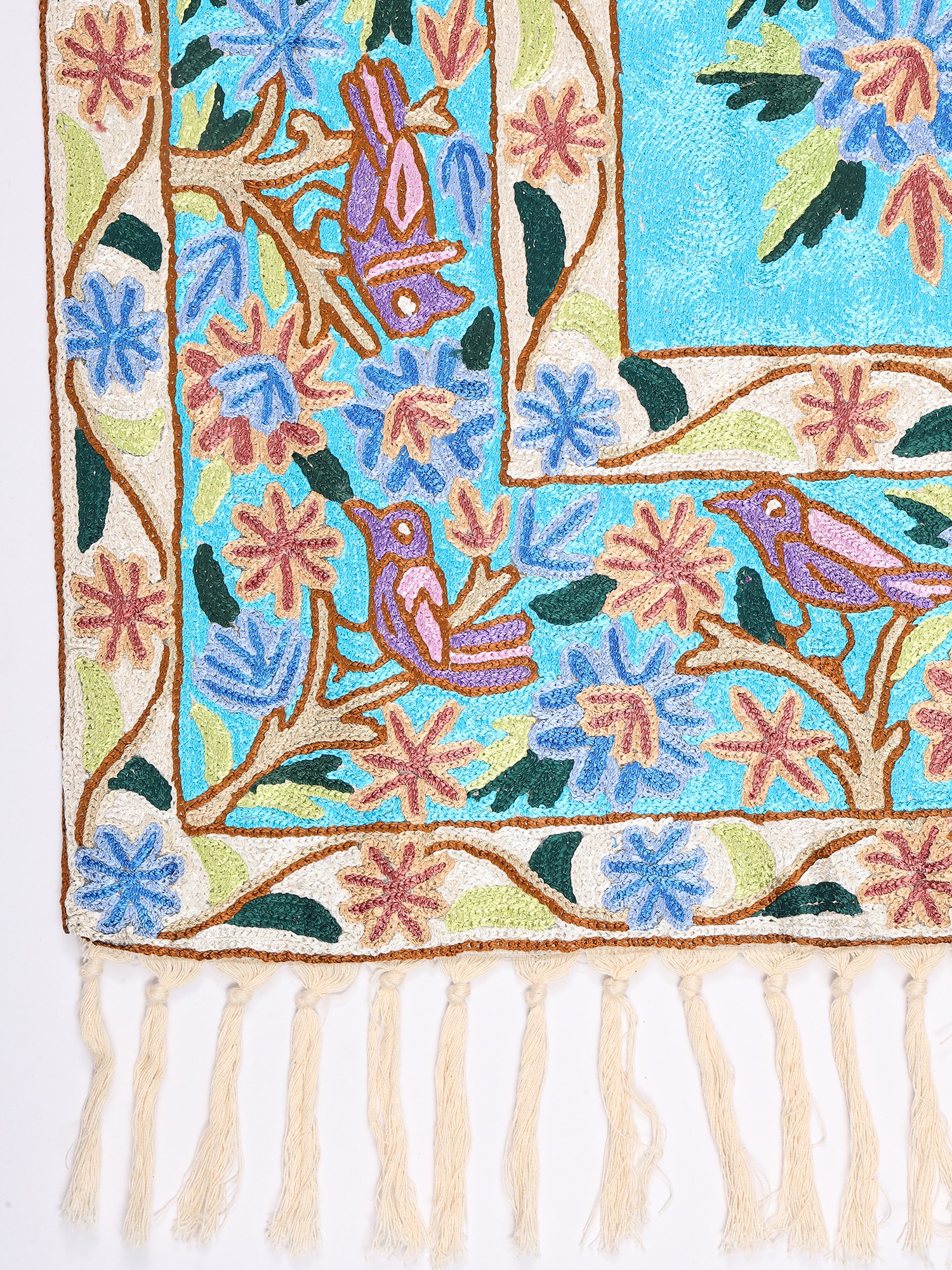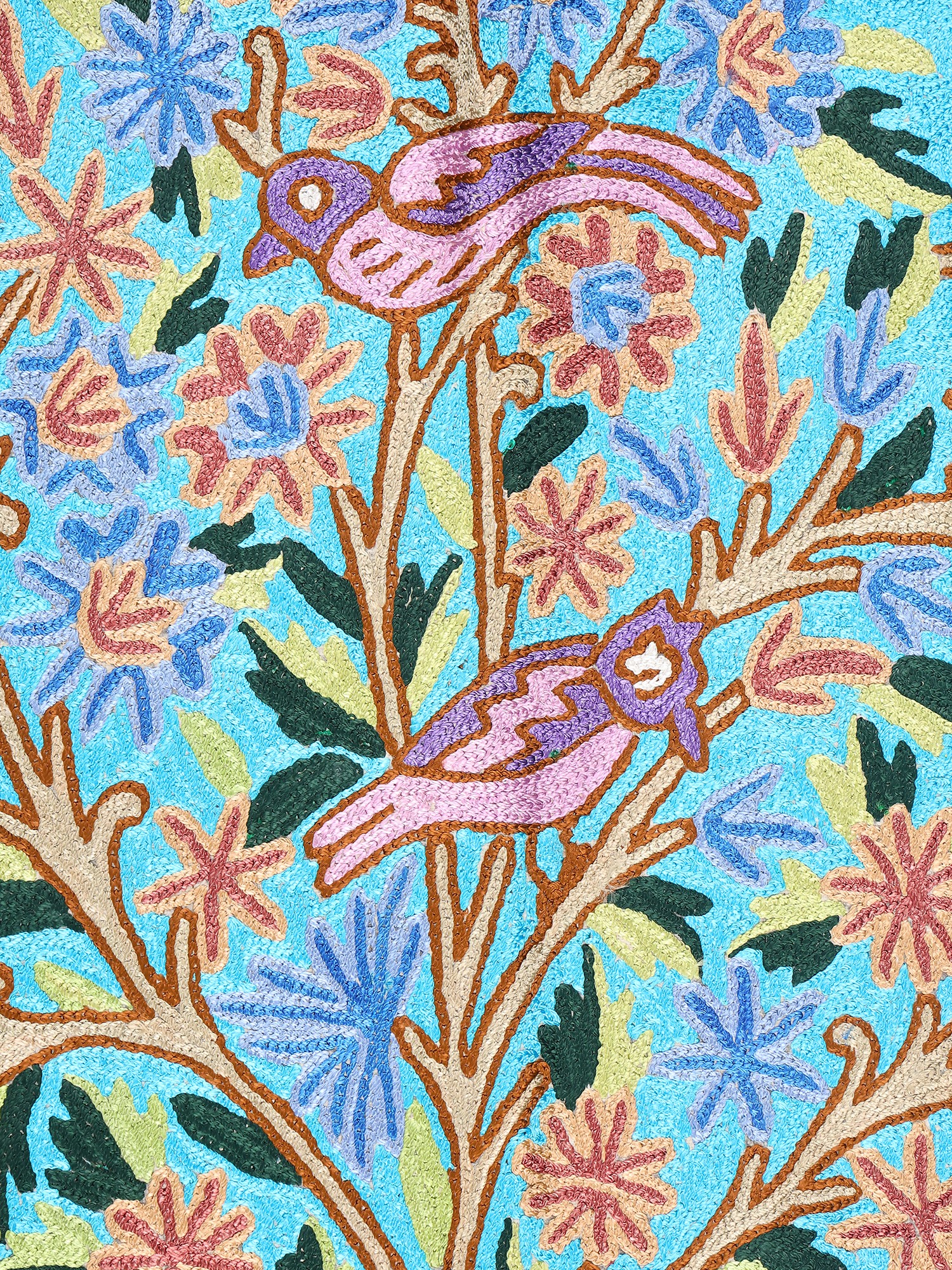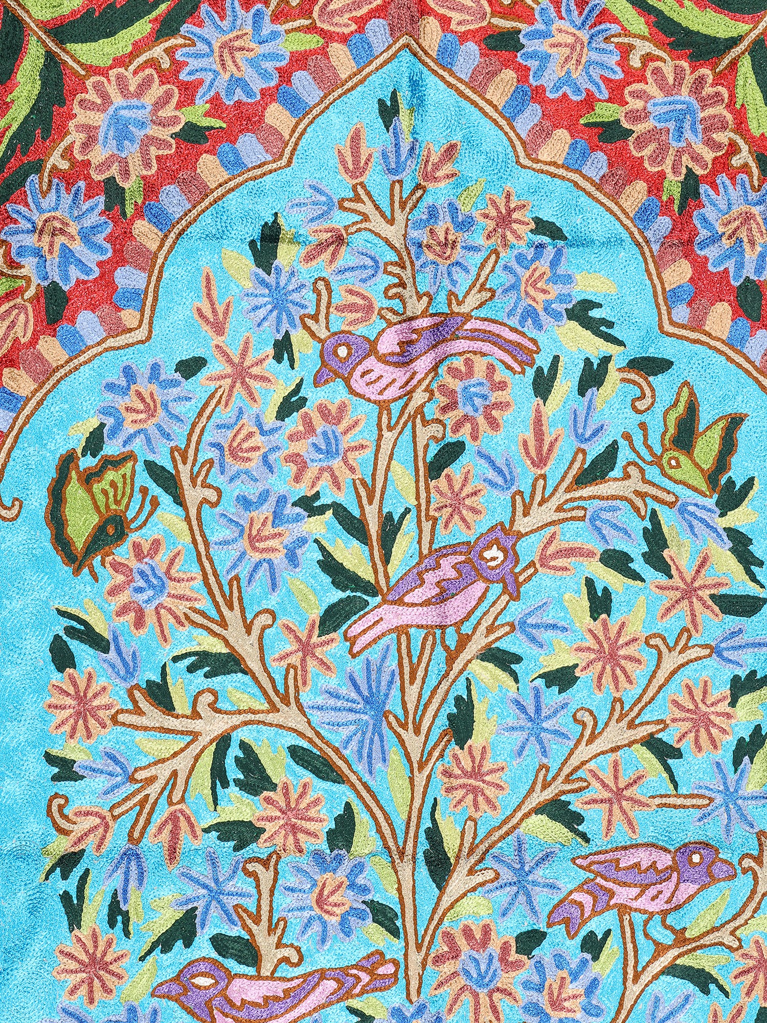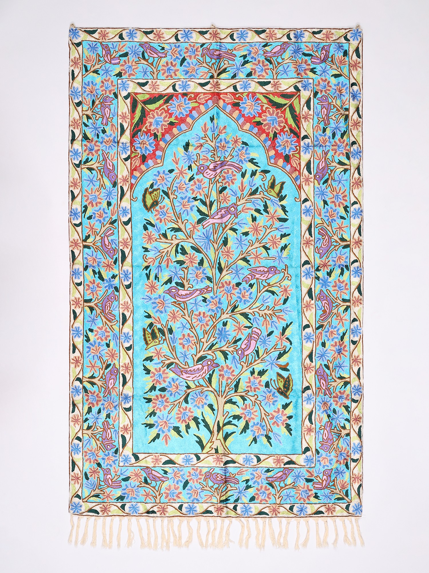 With lovely resham thread, the canvas fabric is densely embroidered with flowery foliage and feathered faunals around the proverbial tree of life done up in the most colourful of pastels. This exquisite asana sourced from select weavers in the Kashmir valley doubles as a great wall-hanging.