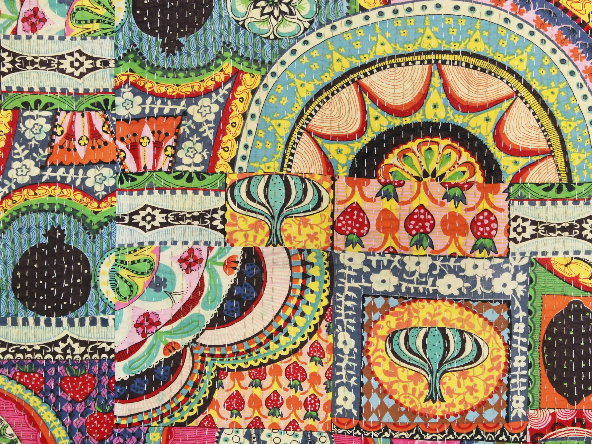 Infuse your bedroom with a burst of color and artistic flair with this stunning Kantha-style quilt. Inspired by the vibrant traditions of Jodhpur, this piece is a true celebration of intricate design and handcrafted beauty. Each square of this quilt tells a story through its captivating patchwork, featuring a medley of lively motifs. From stylized floral patterns and geometric mandala-like designs to whimsical depictions of fruits, the interplay of colors is nothing short of spectacular. Deep blues, fiery reds, sunny yellows, and lush greens dance together, creating a visual symphony that promises to awaken your senses.