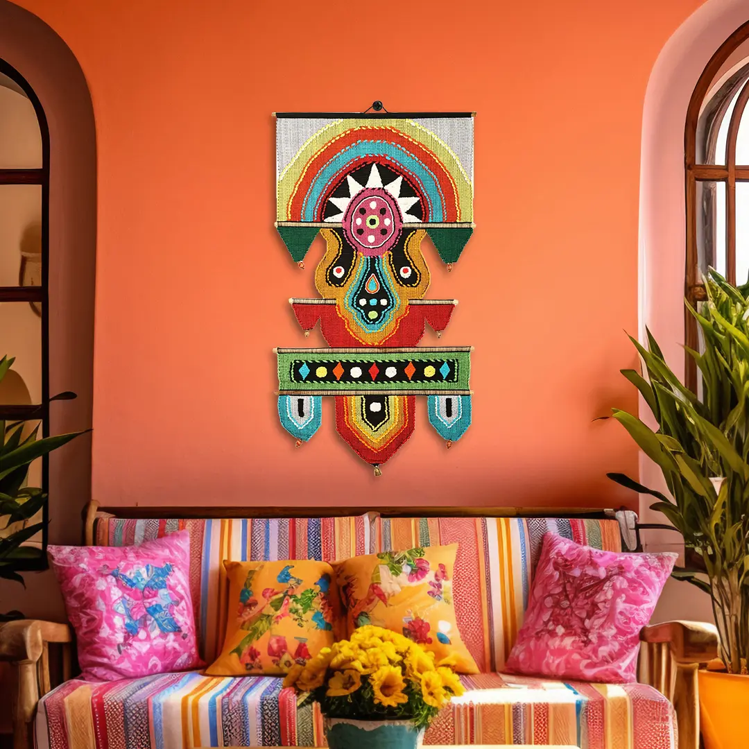 Each element of this wall-hanging has been thoughtfully designed and expertly woven from durable cotton. The intricate patterns showcase a rich tapestry of colors, from fiery reds and sunny yellows to oceanic blues and earthy greens, all harmoniously blended to create a visually stunning display. The design evokes a sense of ancient tribal motifs, possibly representing natural elements, spiritual symbols, or the bountiful landscapes of the region from which it originates. The central circular motif, with its radiating points, draws the eye, while the cascading layers of geometric shapes and symbolic forms create a dynamic and engaging composition.