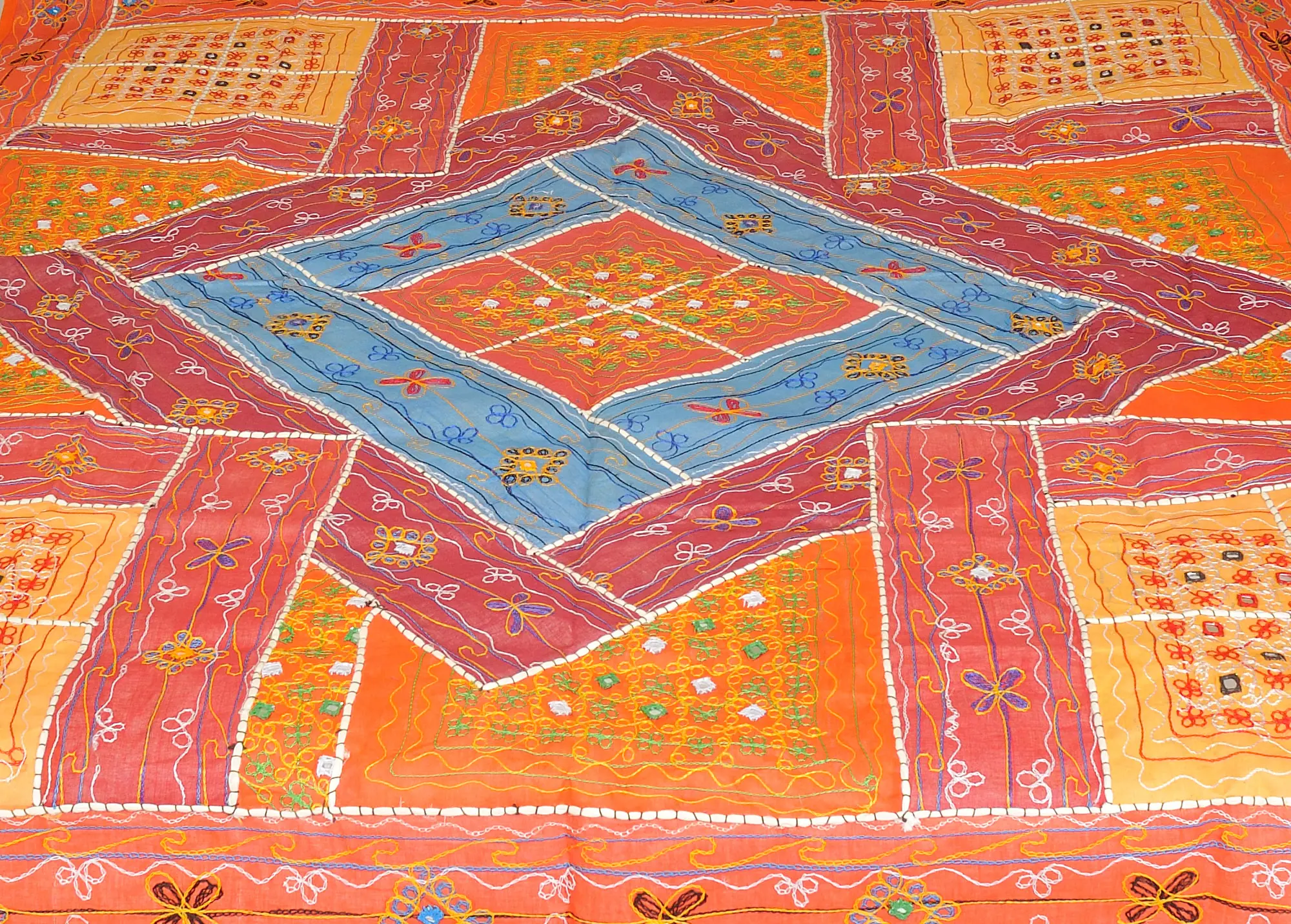 Infuse your space with the vibrant energy of Kutch with the Orange Bedspread adorned with embroidered mirrors and patchwork. Each mirror reflects the kaleidoscope of Kutchi culture, adding a touch of whimsy to the bedroom. The vibrant orange hue captures the essence of the desert landscape, evoking a sense of warmth and vitality.