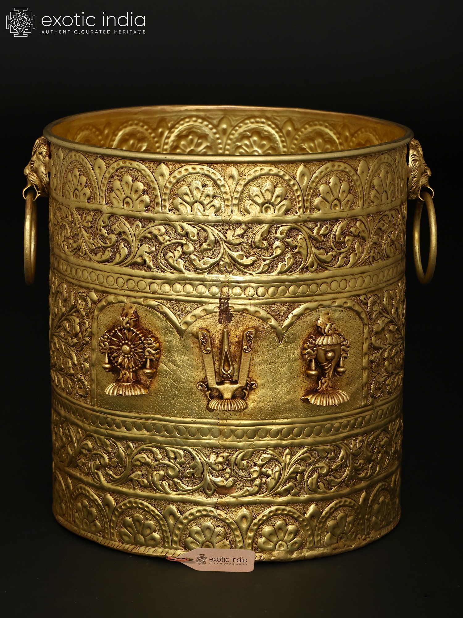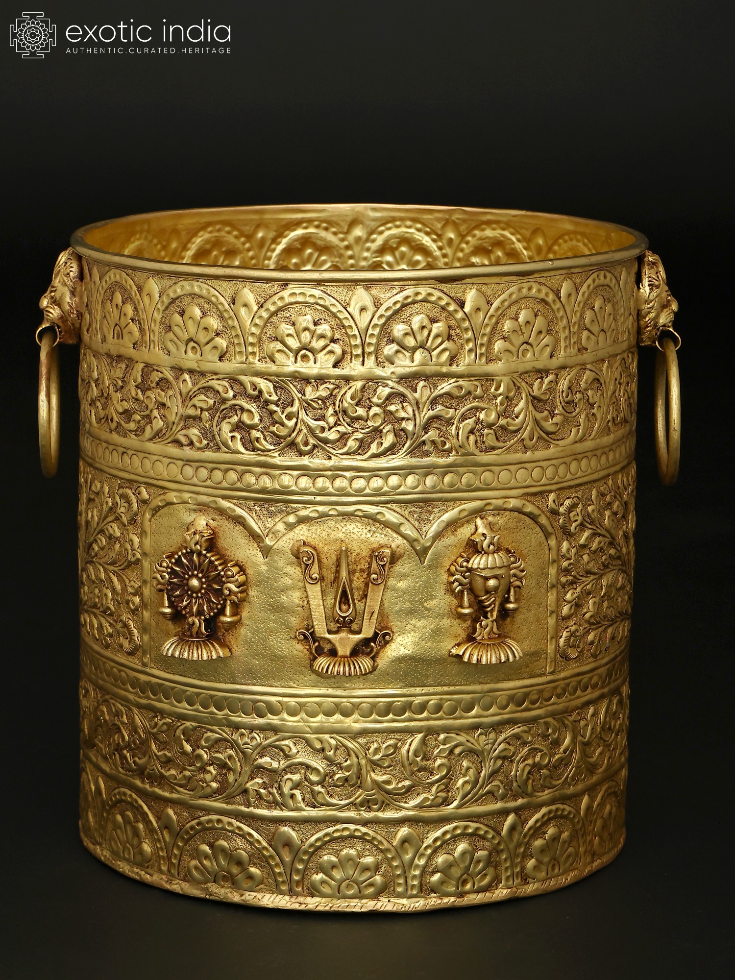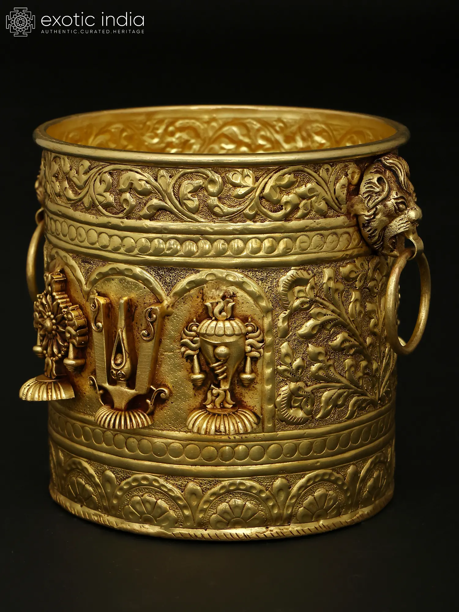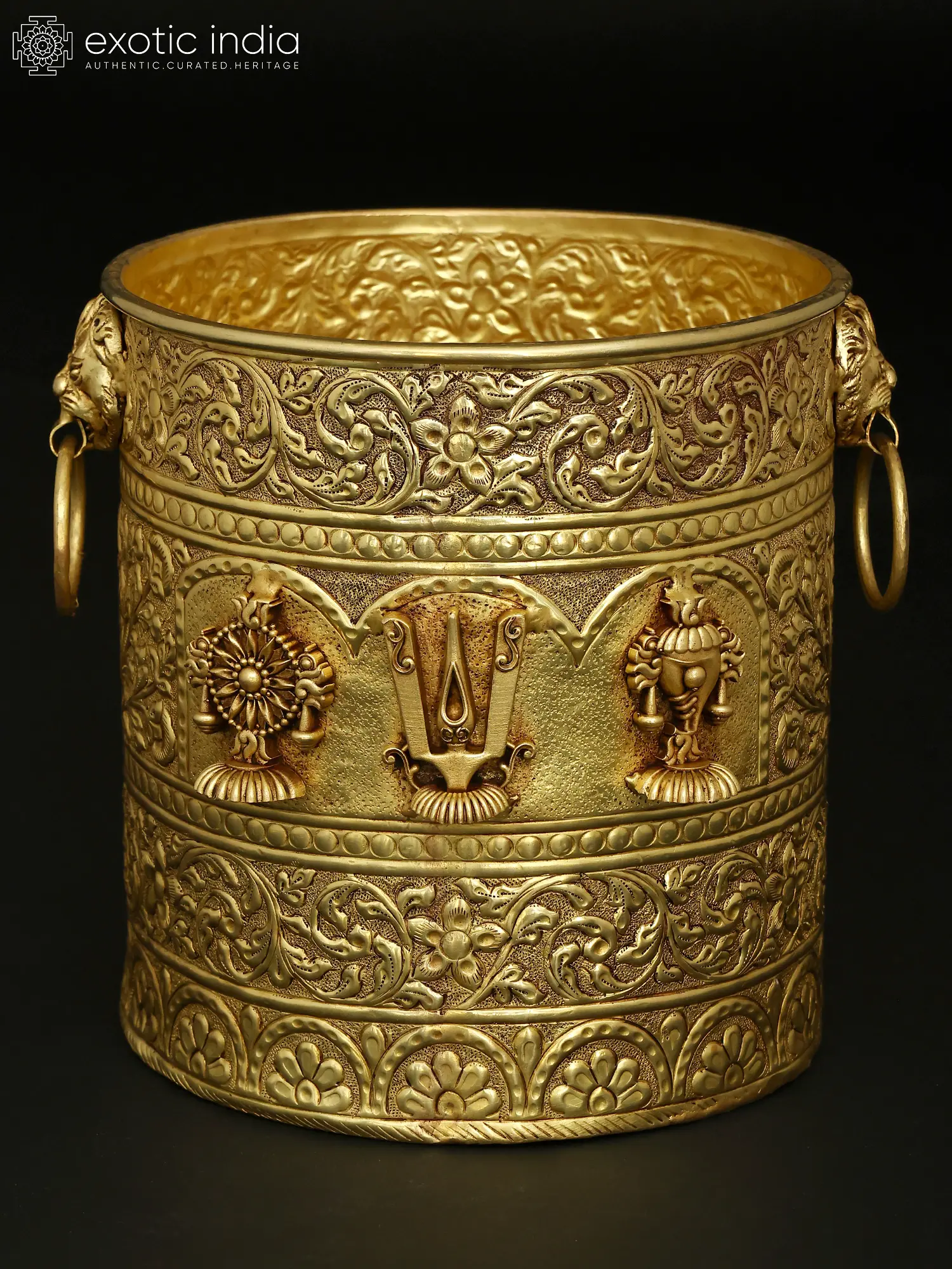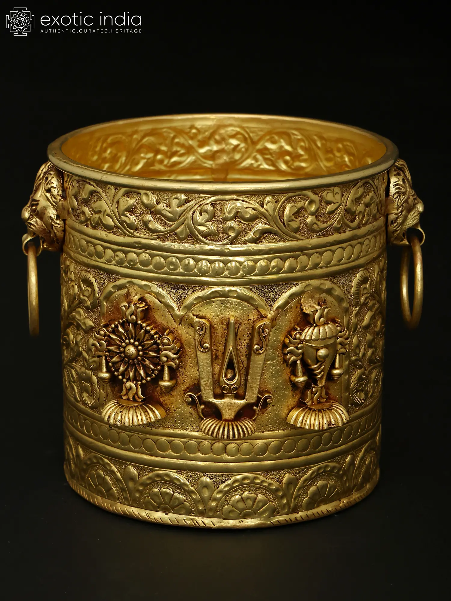 The surface is adorned with a symphony of deeply embossed motifs, creating a mesmerizing interplay of light and shadow that accentuates its sculptural form. The central panel prominently features the Vaishnav Tilak, flanked by the auspicious Shankh (conch shell) and Chakra (discus), symbols deeply revered in Hindu tradition. A decorative band of ornate floral scrollwork encircles the entire piece, with lion heads and rings adorning the upper rim, adding a regal touch. Measuring a commanding 10 inches in height and 10.5 inches in width and length, it offers a generous capacity for your botanical arrangements.