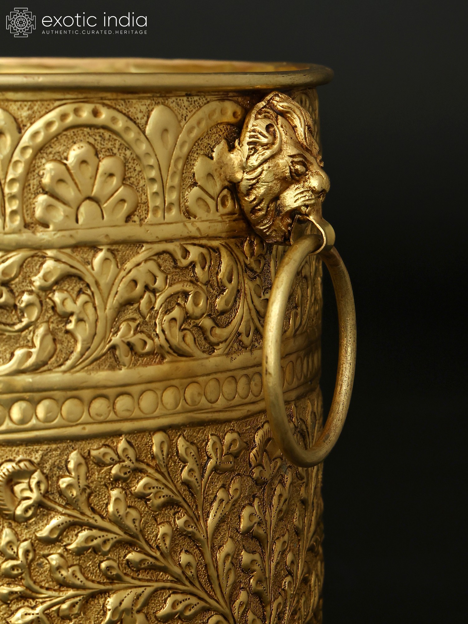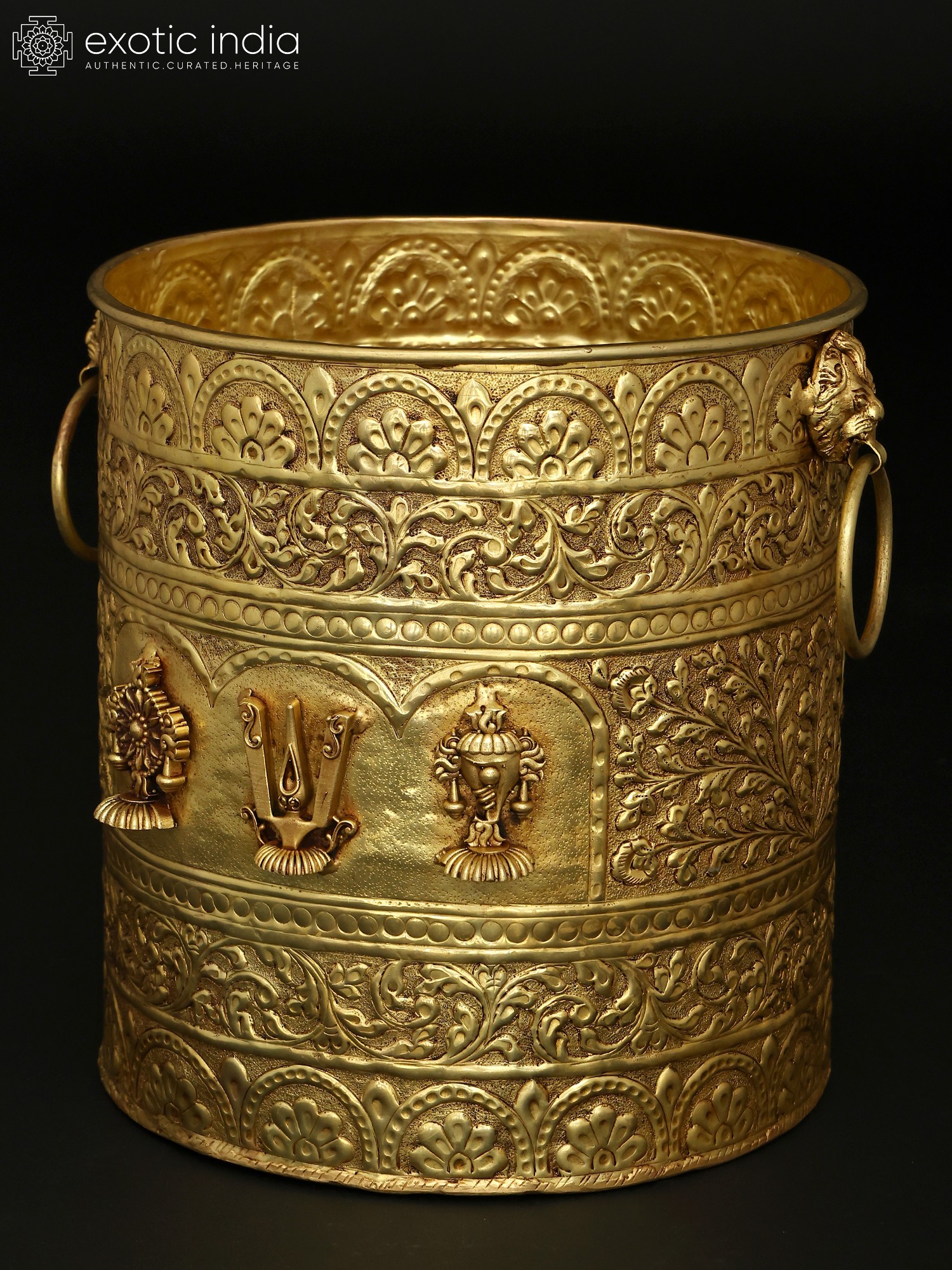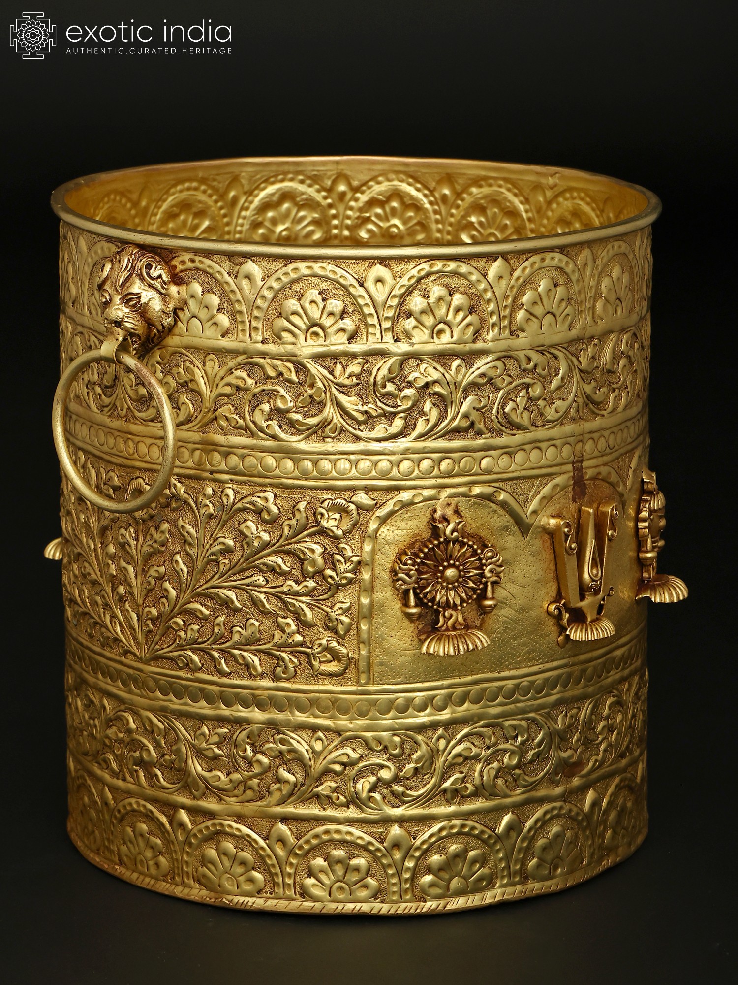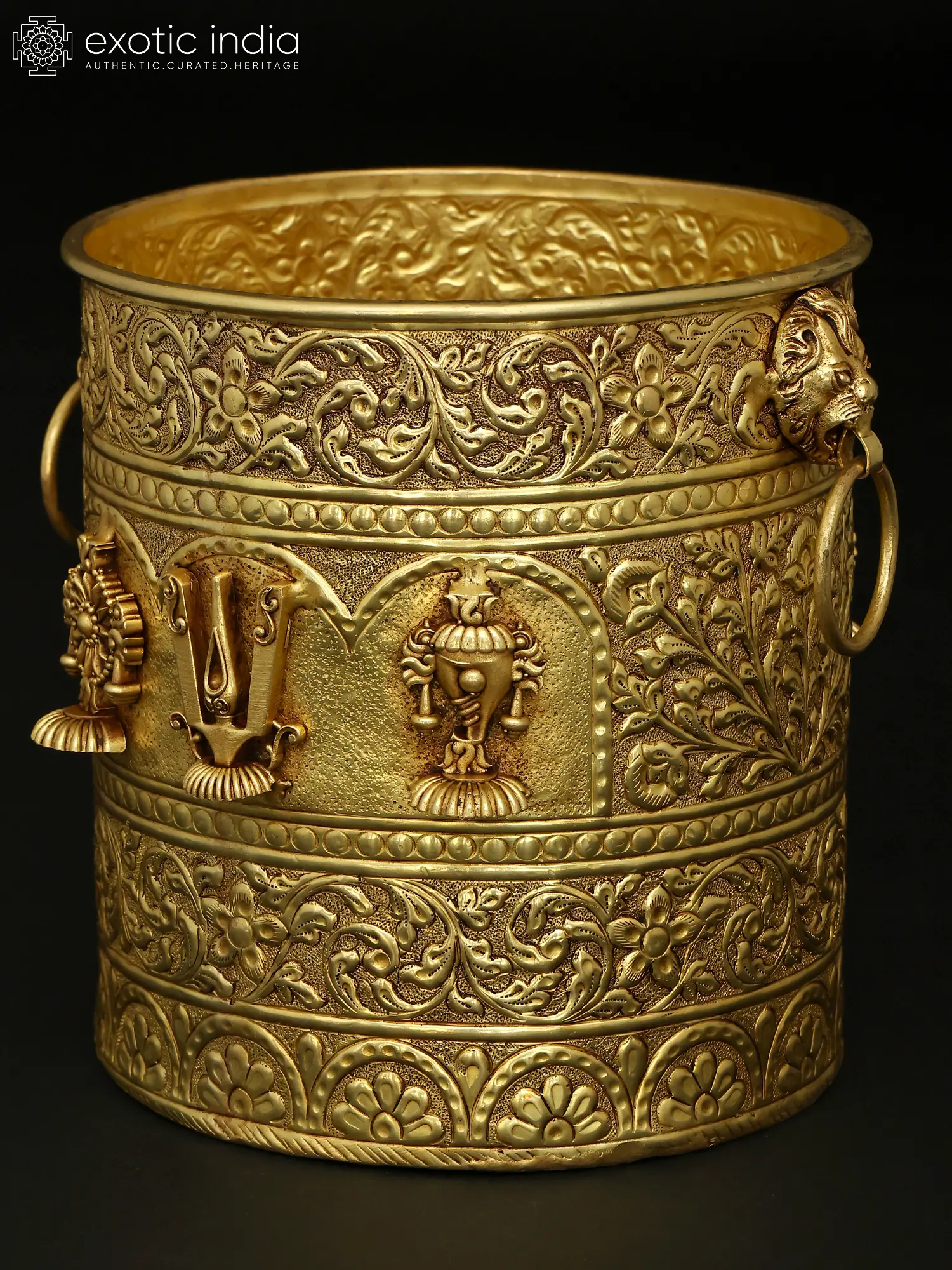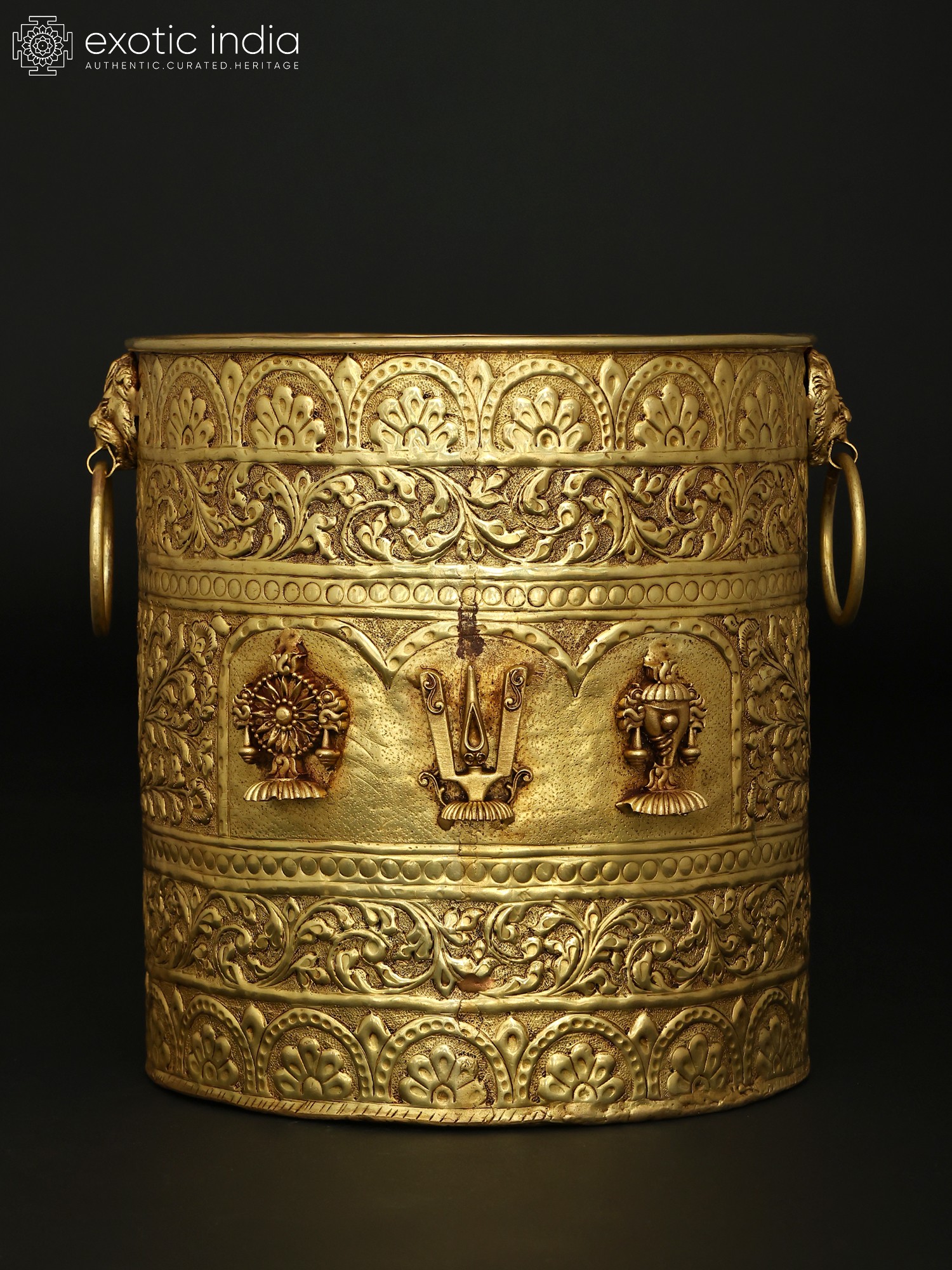 The surface is adorned with a symphony of deeply embossed motifs, creating a mesmerizing interplay of light and shadow that accentuates its sculptural form. The central panel prominently features the Vaishnav Tilak, flanked by the auspicious Shankh (conch shell) and Chakra (discus), symbols deeply revered in Hindu tradition. A decorative band of ornate floral scrollwork encircles the entire piece, with lion heads and rings adorning the upper rim, adding a regal touch. Measuring a commanding 10 inches in height and 10.5 inches in width and length, it offers a generous capacity for your botanical arrangements.