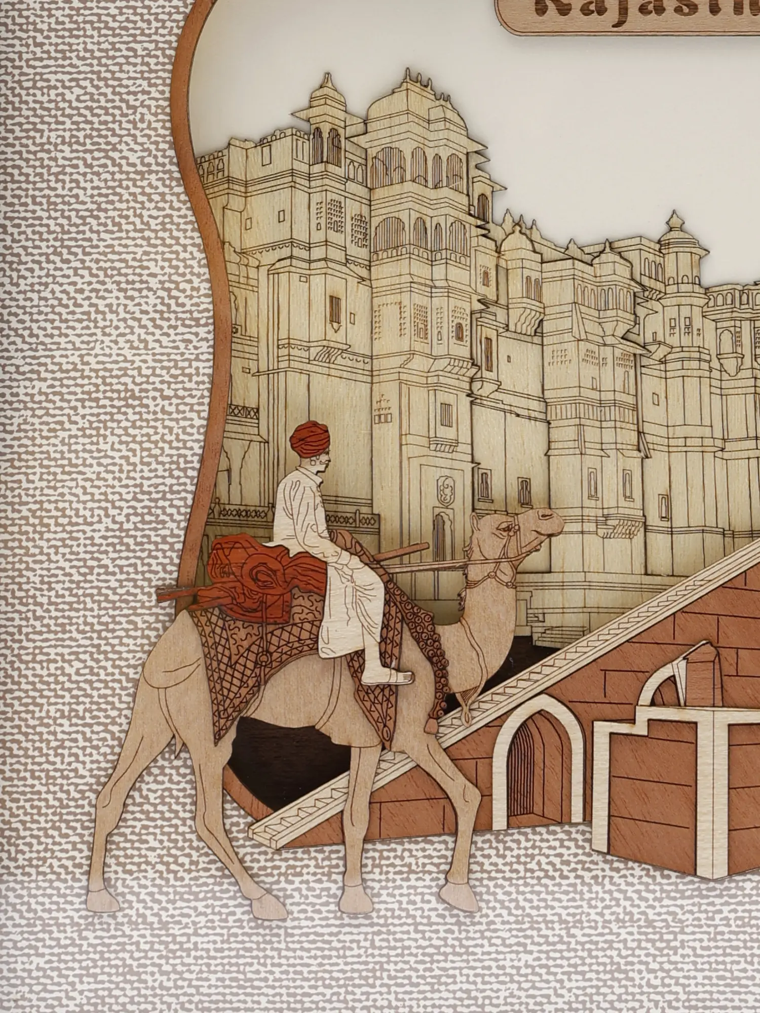 Bring the vibrant culture and breathtaking landscapes of Rajasthan into your home with this exquisite wood-carved wall hanging. This stunning piece of art captures the essence of Rajasthan, showcasing iconic imagery in a beautifully crafted frame. The intricate details and skilled craftsmanship make this more than just a decoration; it's a conversation starter, a piece of history, and a testament to the artistry of Rajasthan. The warm tones of the wood beautifully complement the intricate carvings, creating a piece that is both elegant and captivating. It’s the perfect addition to any room, adding a touch of exotic charm and cultural richness to your space.