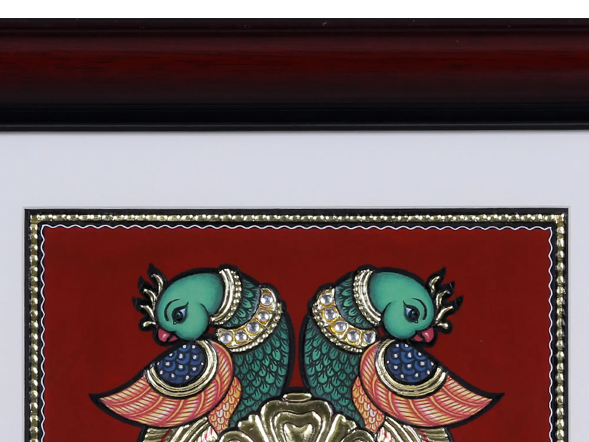 Tanjore painting, originating from the South Indian city of Thanjavur, is renowned for its classic composition, vibrant colors, and the meticulous use of gold leaf. This particular creation masterfully embodies these traditions, showcasing the skilled hand of an artisan who has brought these symbolic birds to life. The parrots, often associated with love, beauty, and communication, are presented here with a lifelike quality, their delicate feathers and expressive eyes drawing the viewer into their story. The gold foil work isn't merely decorative; it's an integral part of the narrative, highlighting the divine and precious nature of the subject matter. The rich, deep red backdrop serves as a perfect contrast, making the golden elements and the parrots' vivid colors pop with an almost three-dimensional effect. ––––––––––––––––––