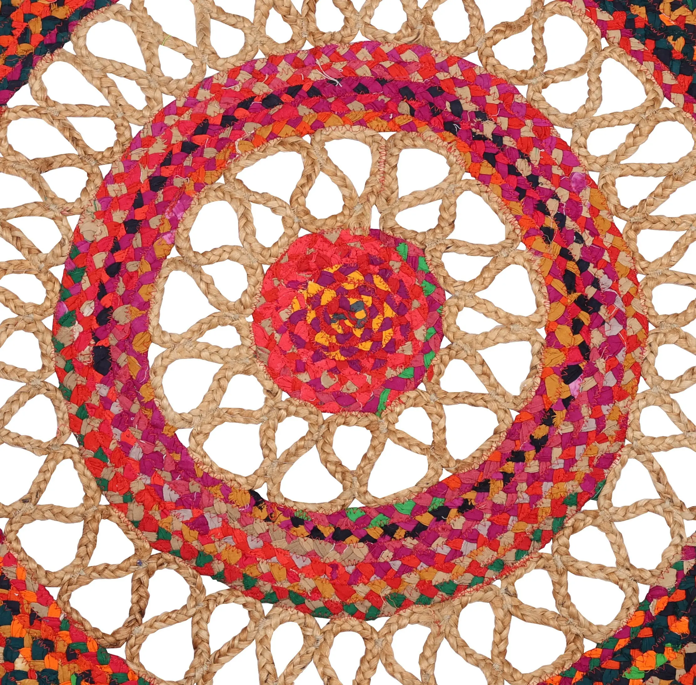 The design is a masterpiece of hand-braiding and knotting. The circular shape is accentuated by the concentric circles of vibrant upcycled cotton, interwoven with sturdy jute to form a rich mandala pattern. The detailed jali (lattice) work provides a beautiful contrast and texture. This level of intricate detail underscores the exceptional skill and dedication of the artisans who created this piece. Each mat is unique, reflecting the individual touch of the craftsperson.