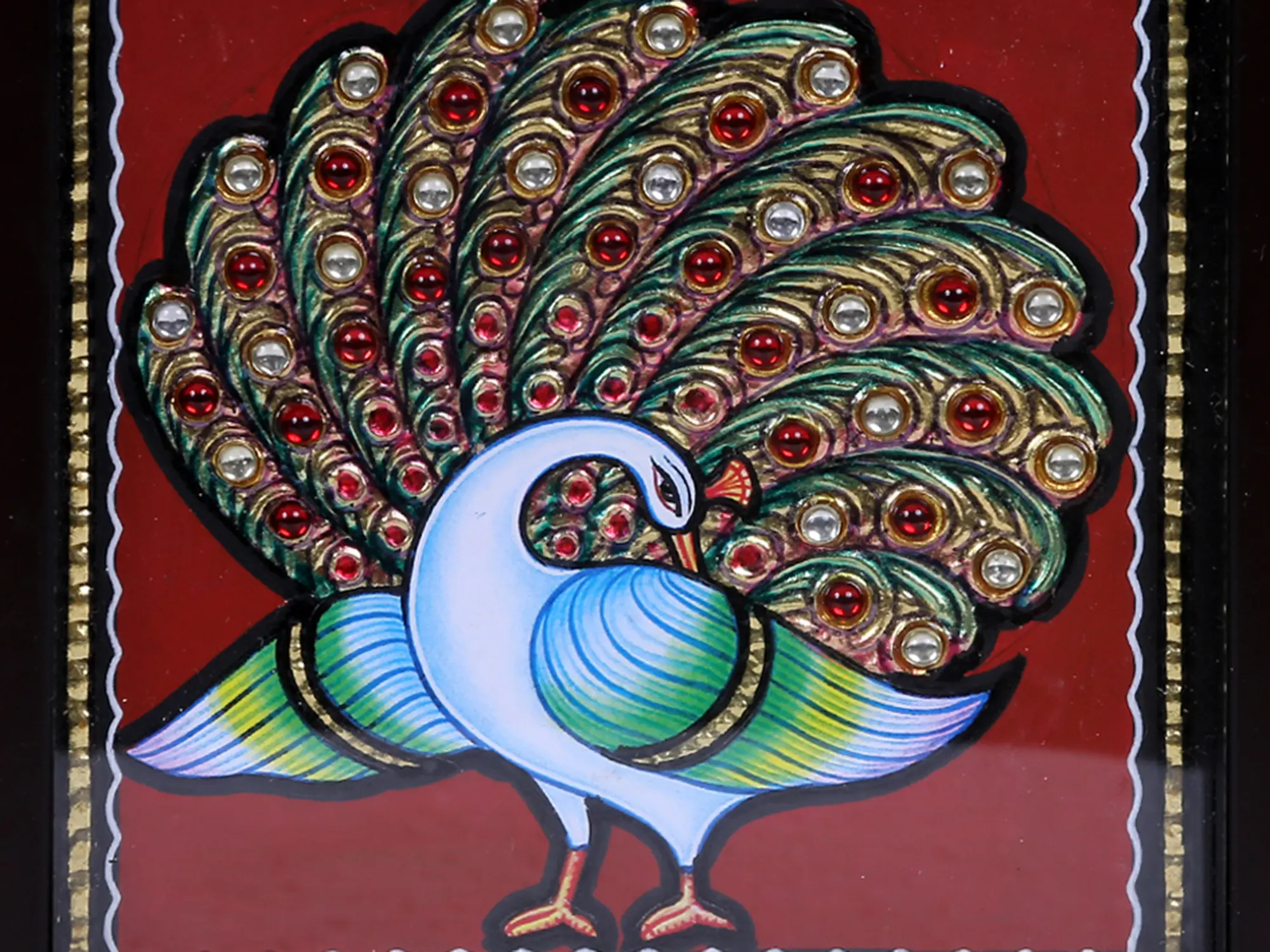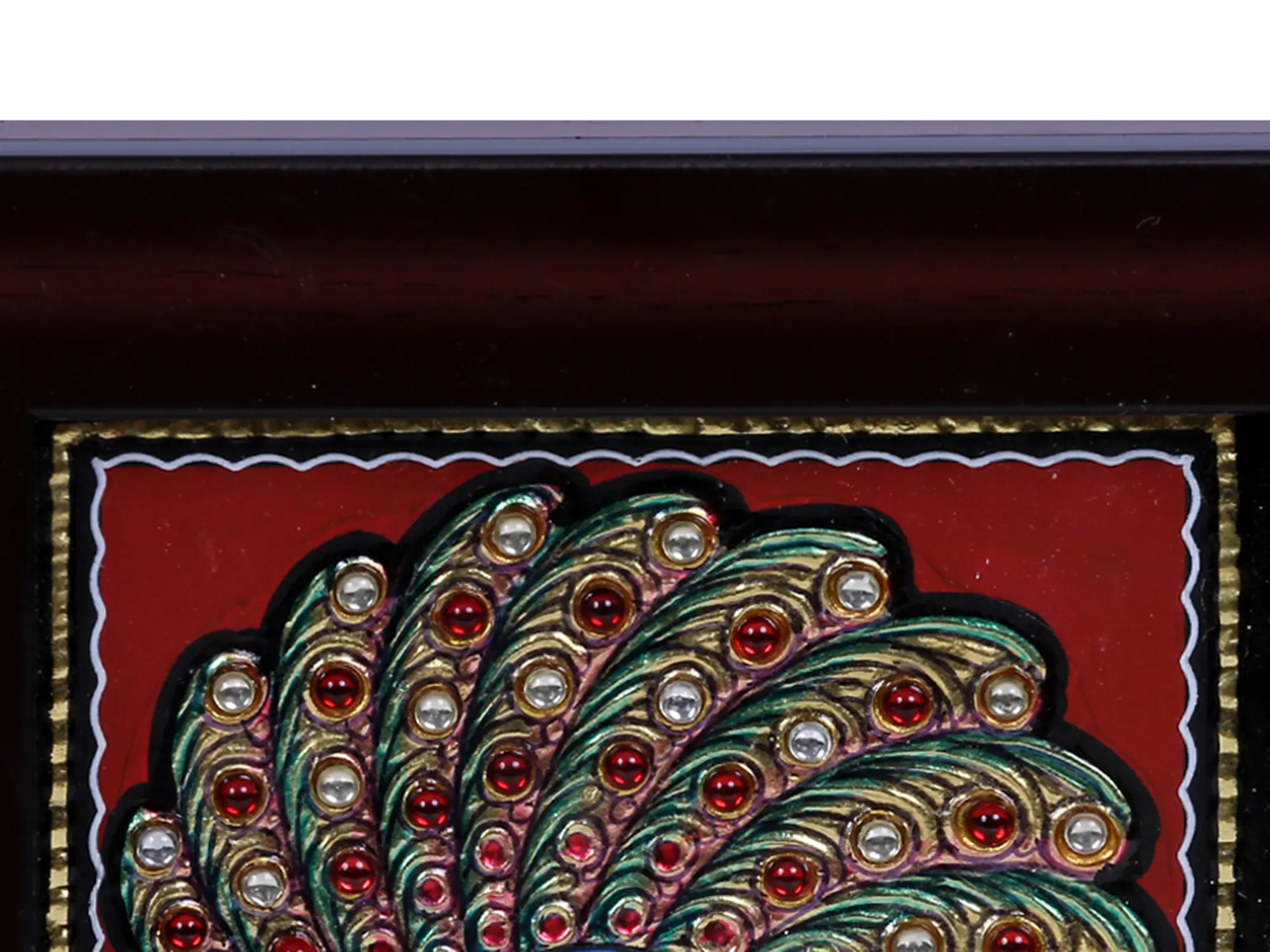 More than just a functional piece, this Tanjore key holder is imbued with philosophical depth. The peacock, is a powerful reminder that true security lies not in material possessions but in inner peace. The vibrant plumage and intricate gold foil details draw the eye, while the practical function of holding keys serves as a gentle nudge to cultivate detachment from worldly belongings.