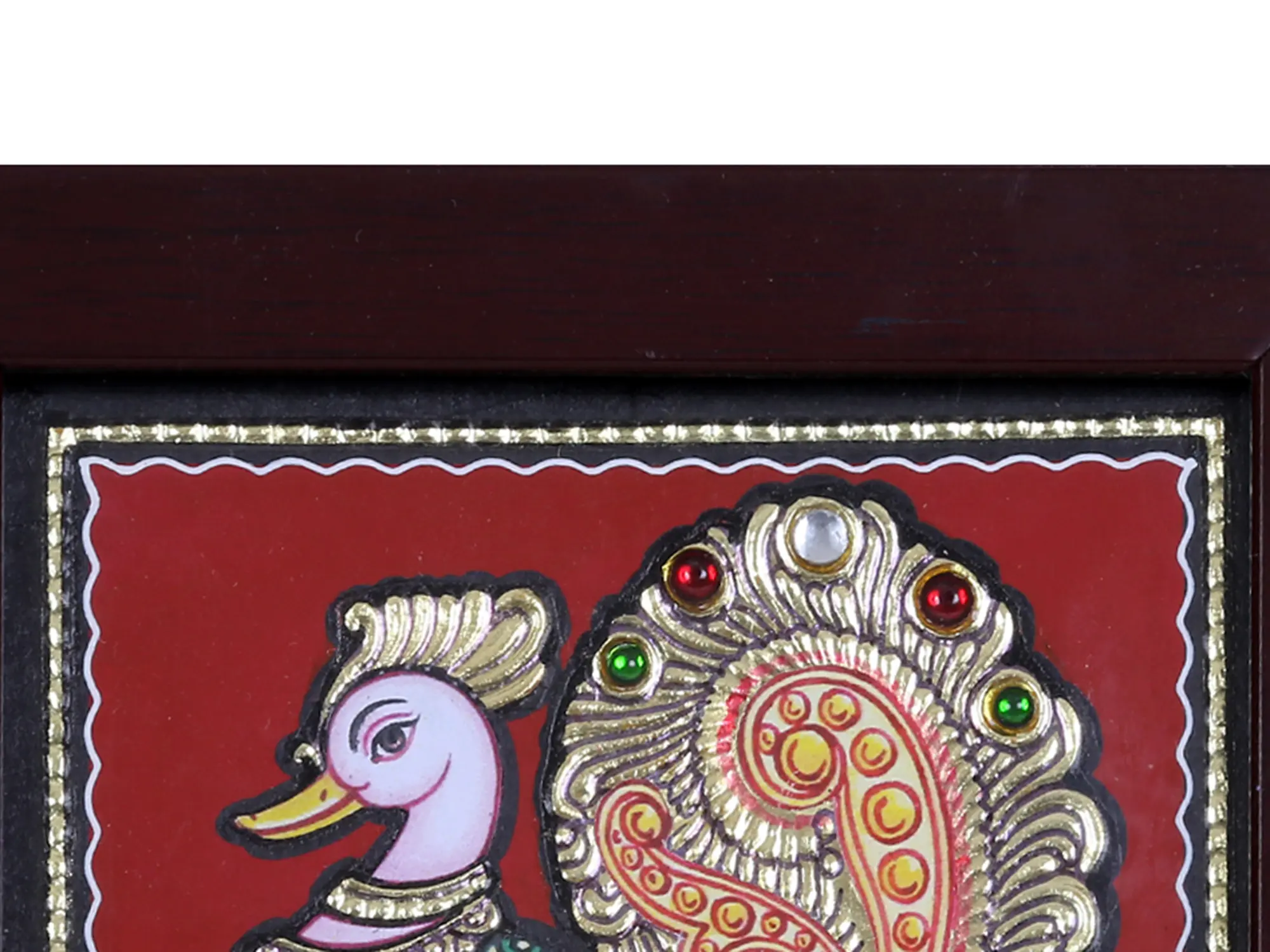 This vibrant Tanjore artwork pulsates with an energy that reflects the concept of "Lila" - divine play. The majestic peacock, its tail feathers rendered as a kaleidoscope of colourful gems, represents the universe itself. Each gem, sparkling with an inner light, symbolises the multifaceted nature of creation. The intricate gold foil accents dance across the canvas, hinting at the underlying order and divine purpose woven into the fabric of existence.