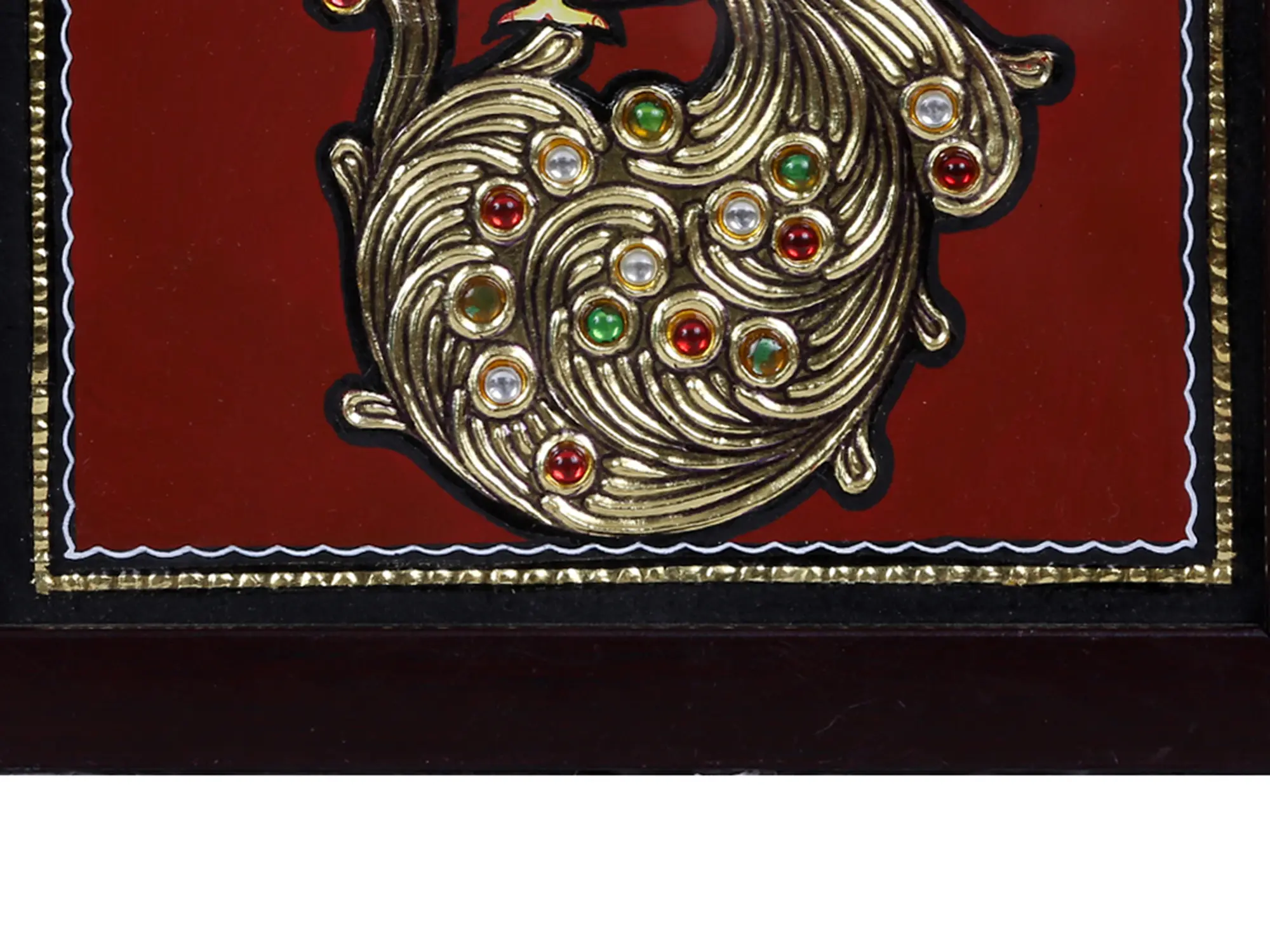 This Tanjore piece celebrates the concept of "Shakti" - the divine feminine power. The peacock, adorned with a tail of meticulously crafted golden curls, represents beauty, grace, and the transformative power of creation. The fine details and swirling gold foil accents hint at the cyclical nature of life, where beauty arises from decay and transformation is the driving force.