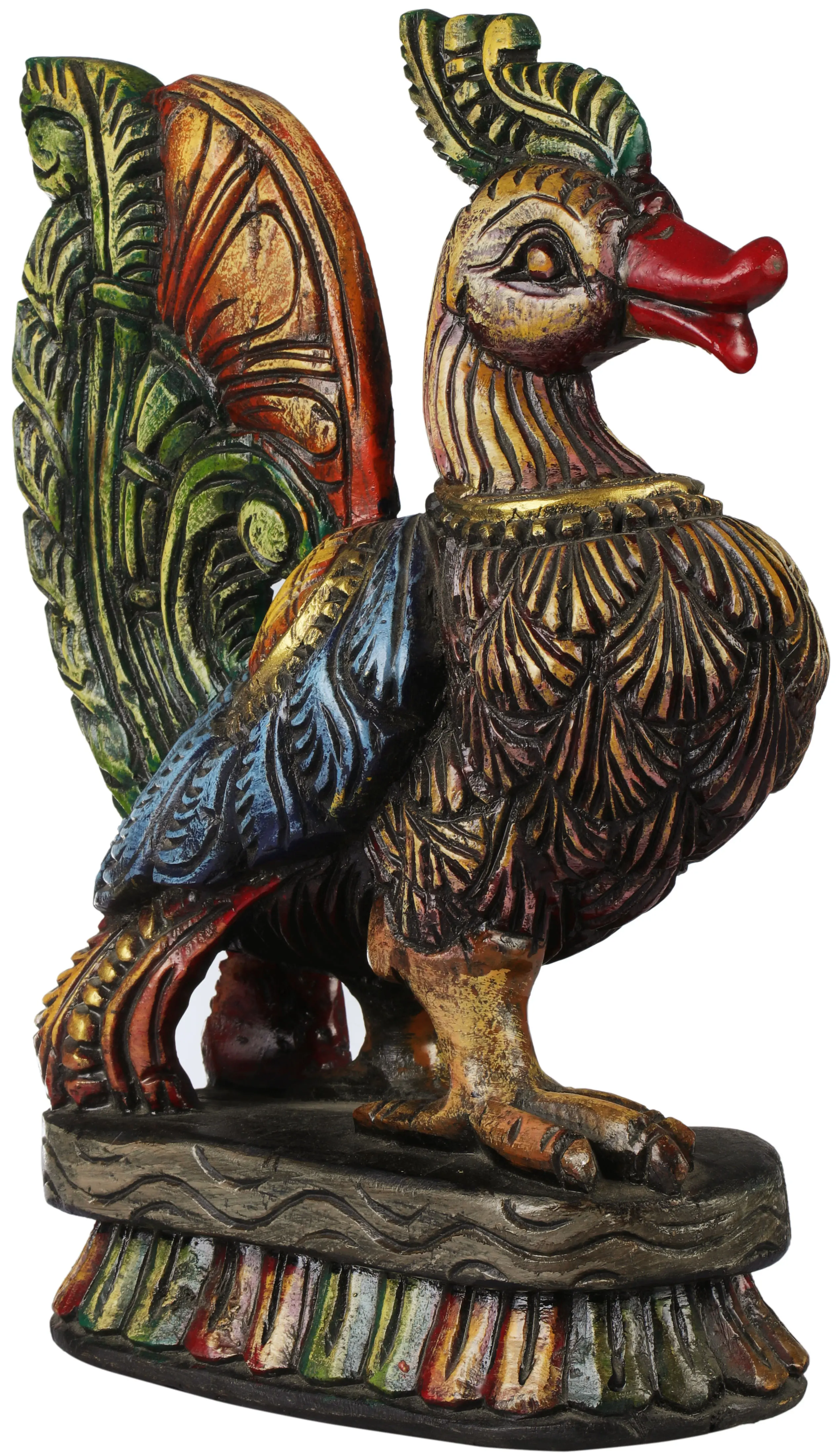 Here, the beauty and craft reaches the next level with our exotic ornamental peacock as the hue of blue and green blend in with the remarkably carved sculpture made of the finest south Indian temple wood not only complimenting your house decorations but soothing your soul.