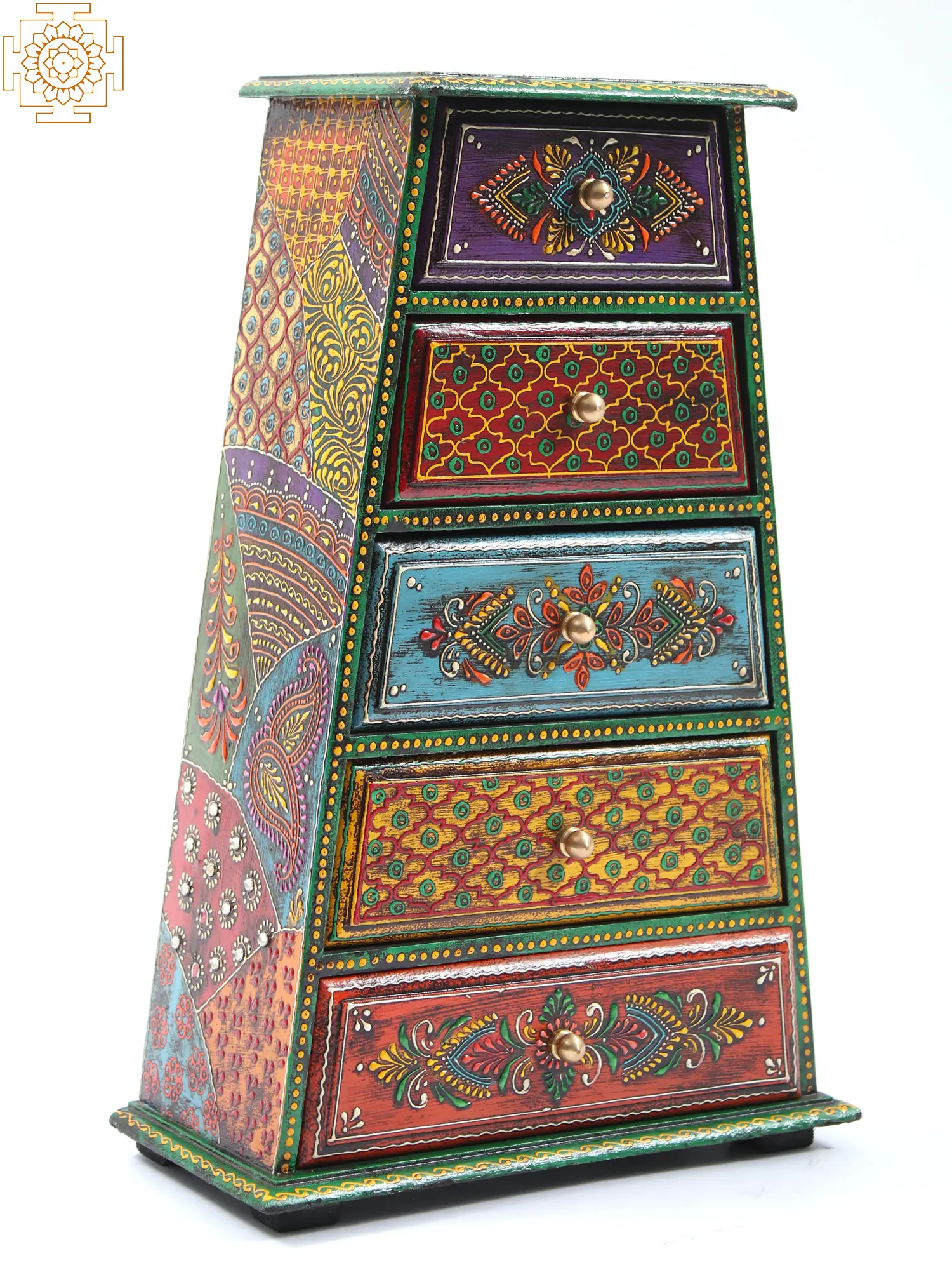 This Pyramid Design Wooden Chest is a rainbow of colours. There is heavy use of vibrant colours such as red, green, and blue, as well as portrayals of Jali and Bael Buta. The material is guaranteed to be of the highest quality. The drawers are piled in an oblong shape, creating a compact construction. The drawer knobs are made of brass and provide an exquisite appearance. This artwork is ideal for a lively space because it adds a splash of colour and instantly lifts the mood.