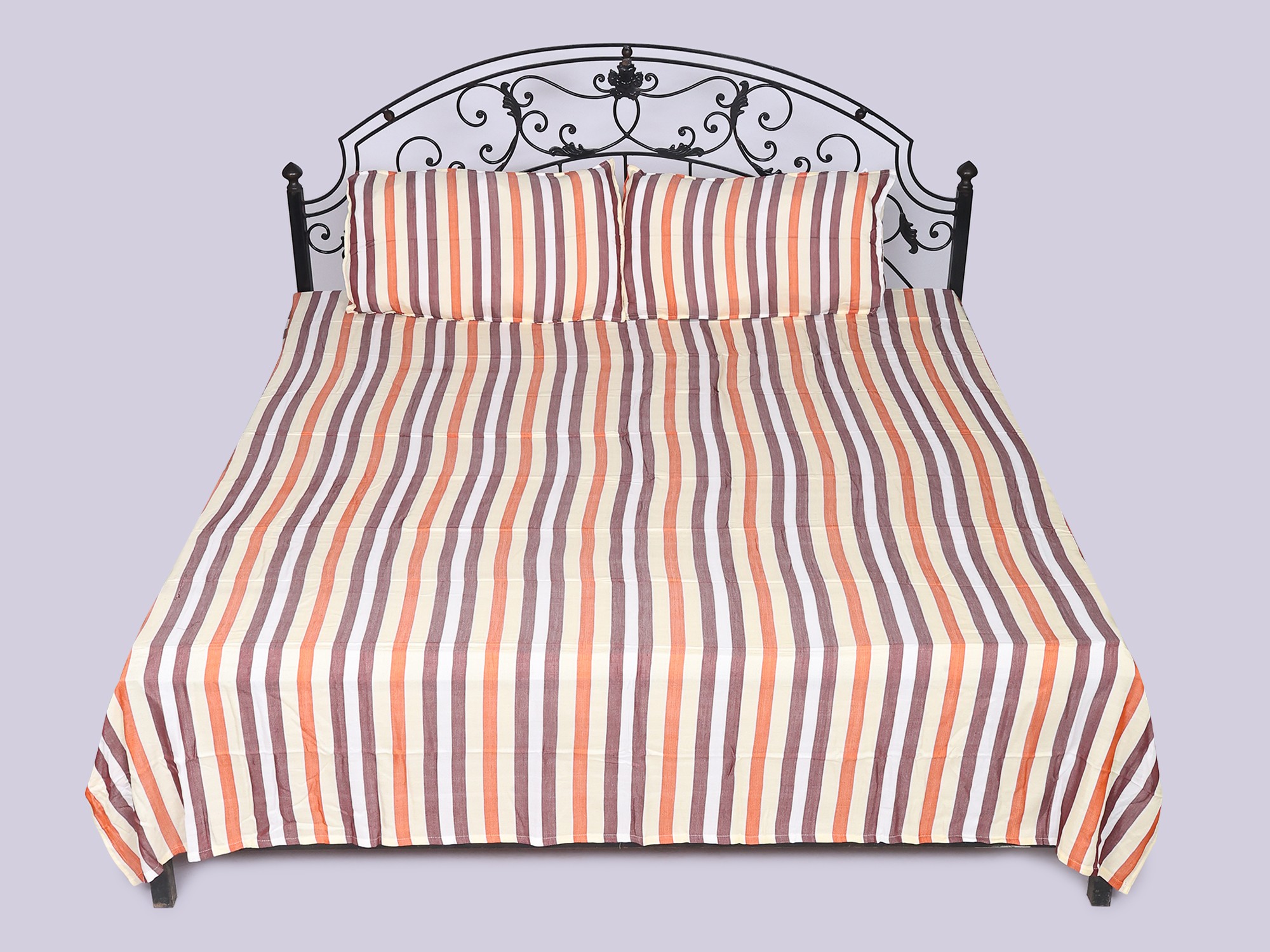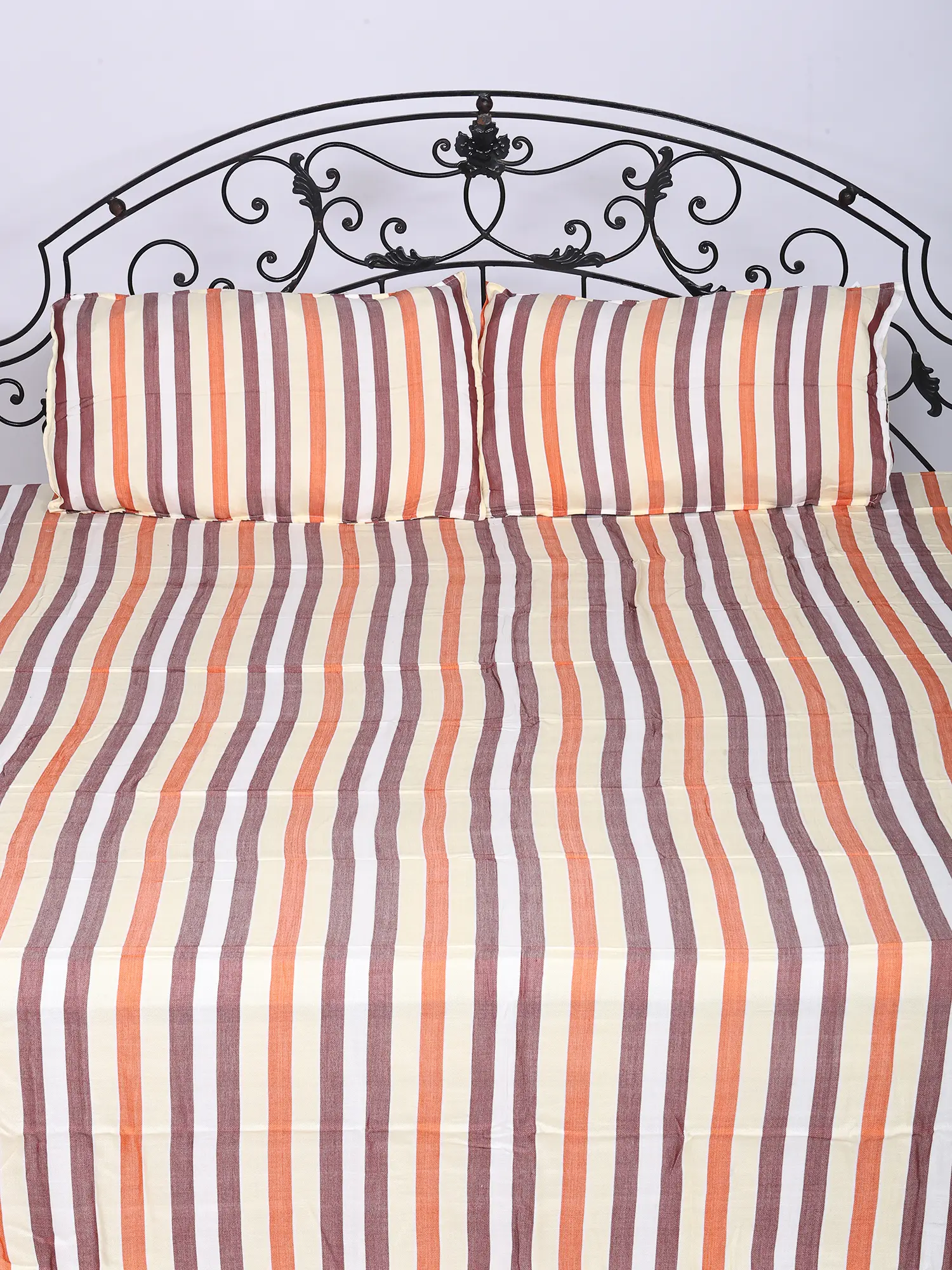 Adorn your bed with a captivating display of multicolor stripes. These dynamic bands of warm hues, ranging from rich earth tones to subtle creams, bring a playful yet sophisticated energy to your bedroom decor. The generous dimensions of the bedspread, extending 108 inches in length and 88 inches in width, promise ample coverage for any queen-sized mattress, creating a graceful, tailored appearance. Complementing this are the coordinating pillow covers, measuring a substantial 27 inches by 18 inches, ensuring a harmonious and inviting aesthetic.