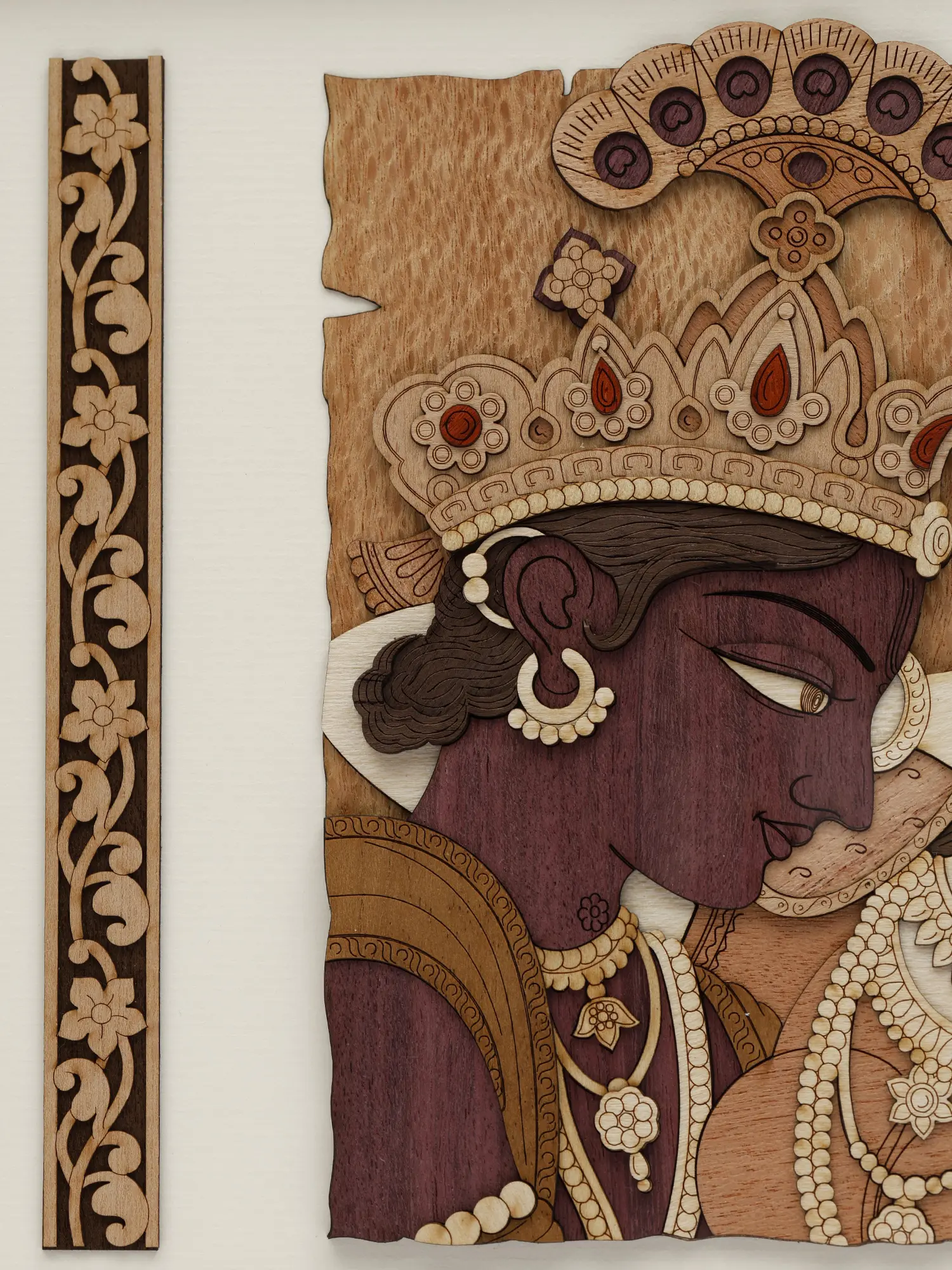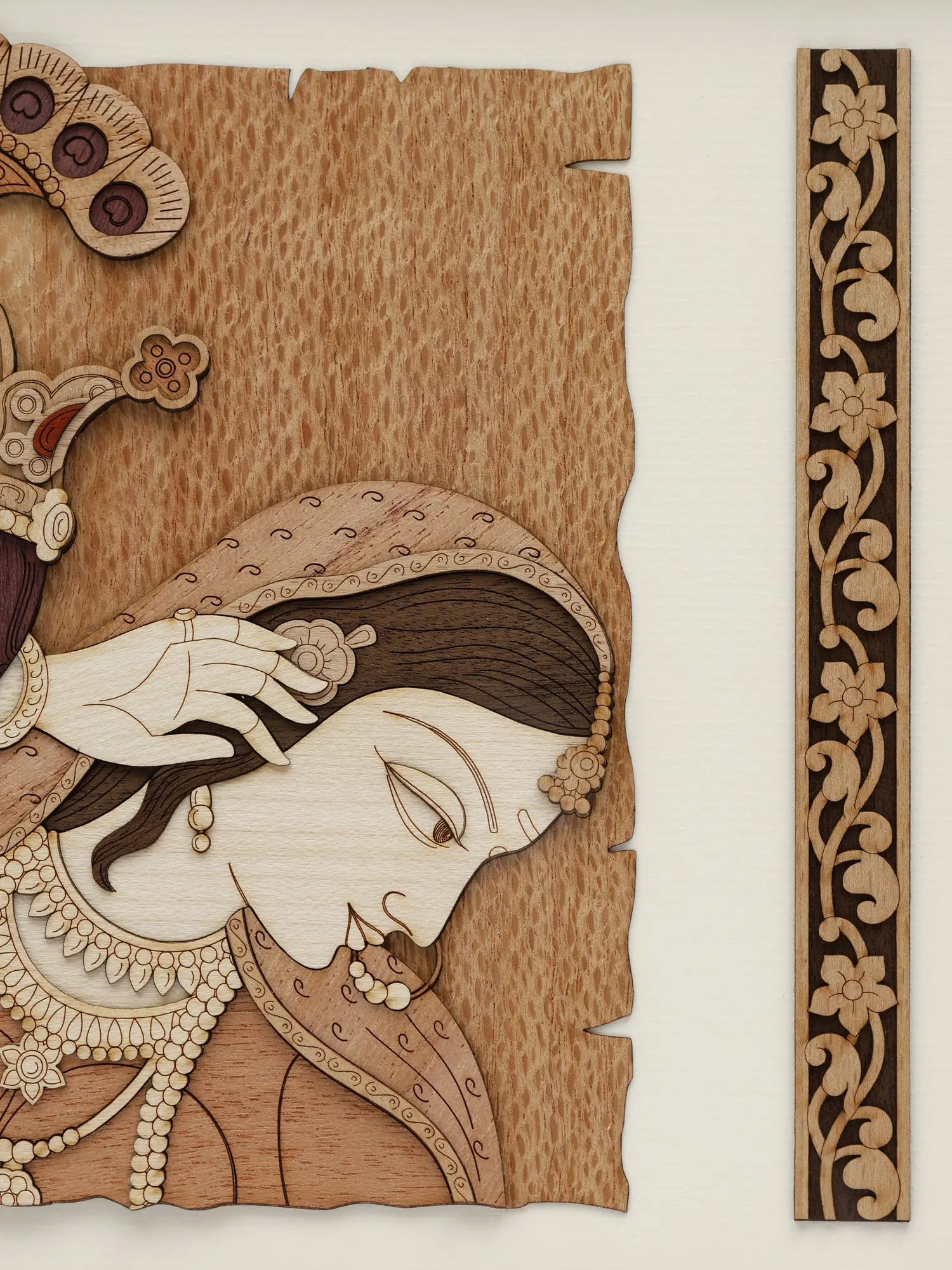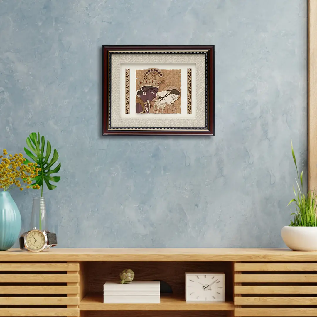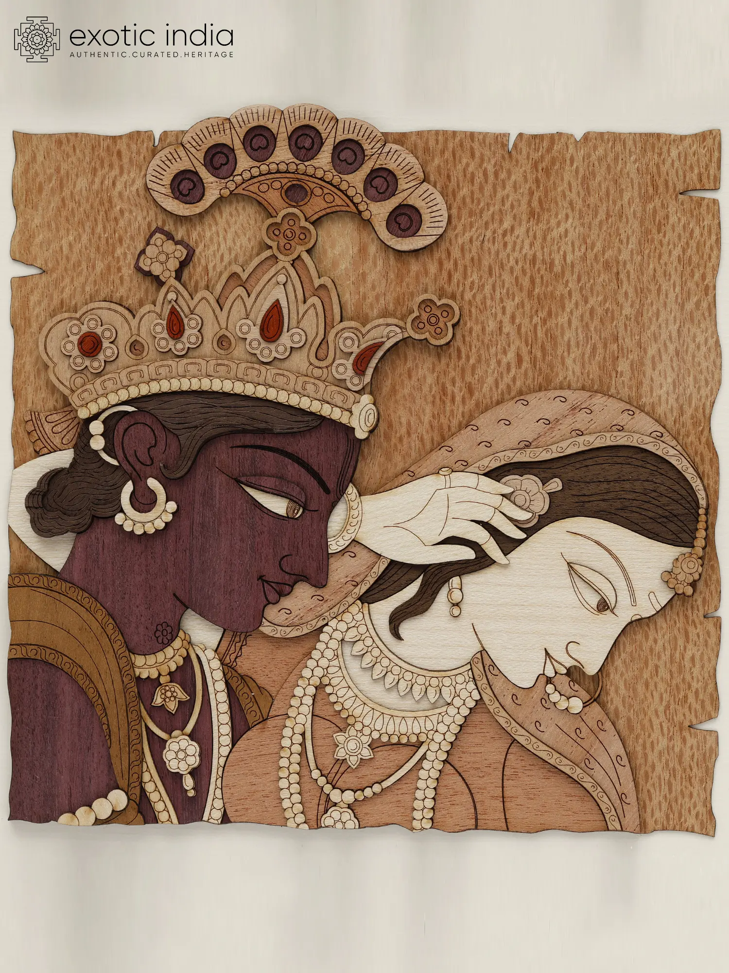 A window to the divine romance of Radha-Krishna, this wooden wall hanging is a unique recreation of the aesthetics of classic Rajput paintings in a modern material.