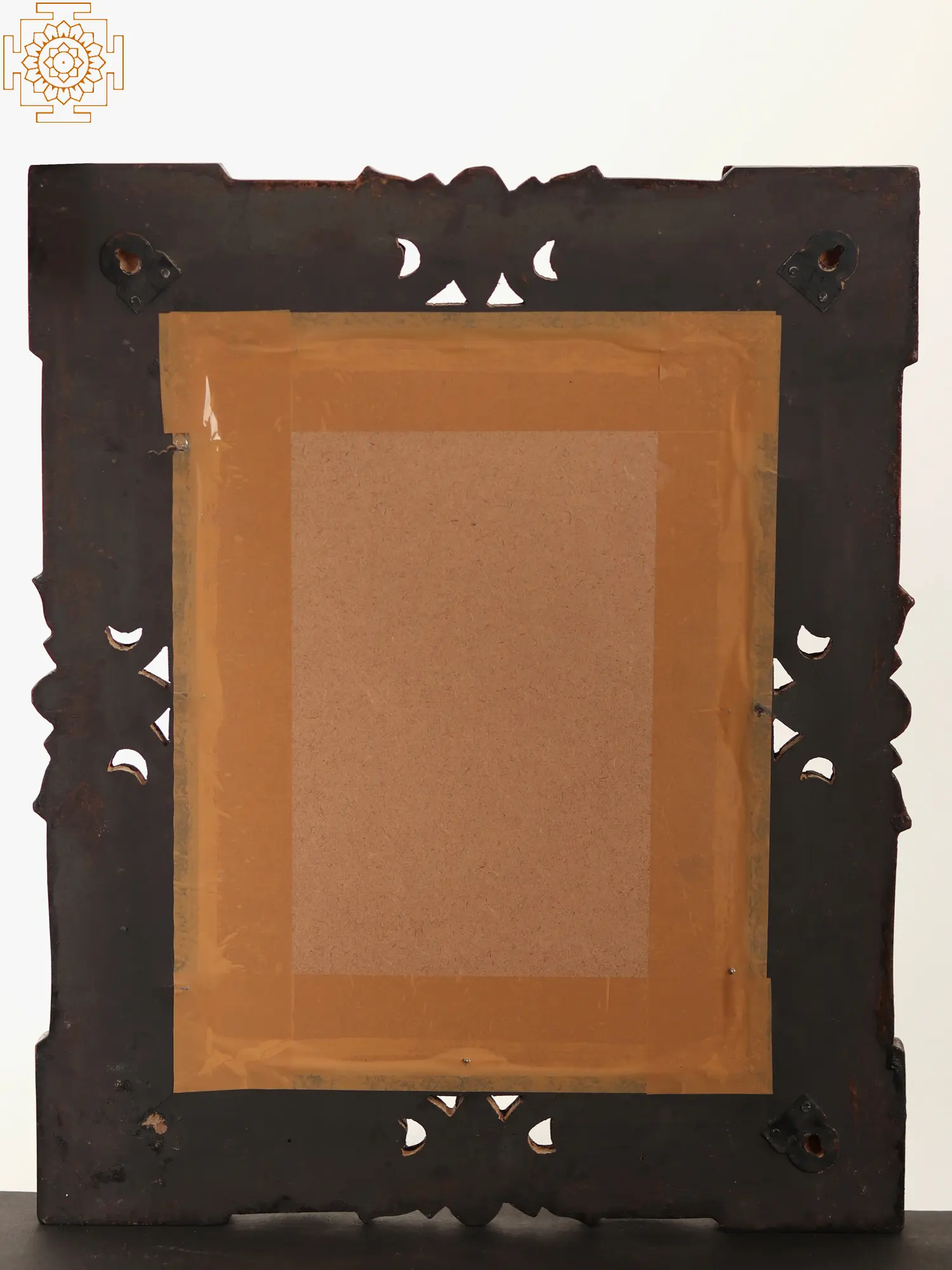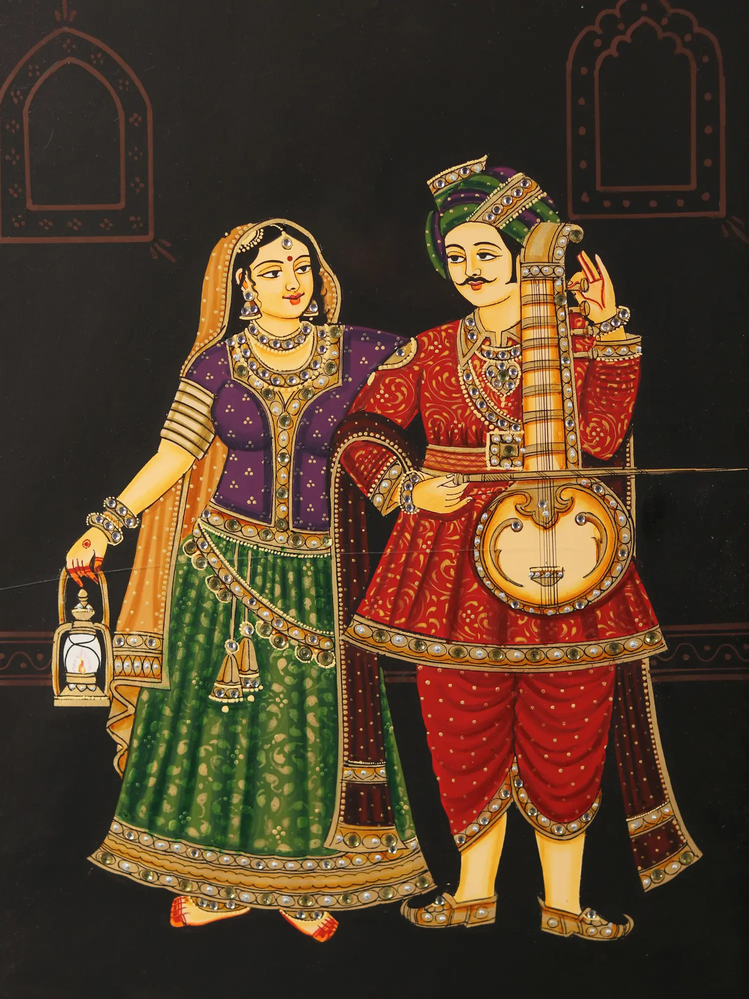 This painting captures the lovely mood of a lover expressing his love for his spouse through music. The background is maintained black to give the picture a regal appearance, while the primary characters are painted in traditional colors such as red and green. With all of these attributes and framed in an unusual wood frame, this painting is a fantastic piece of home decor.