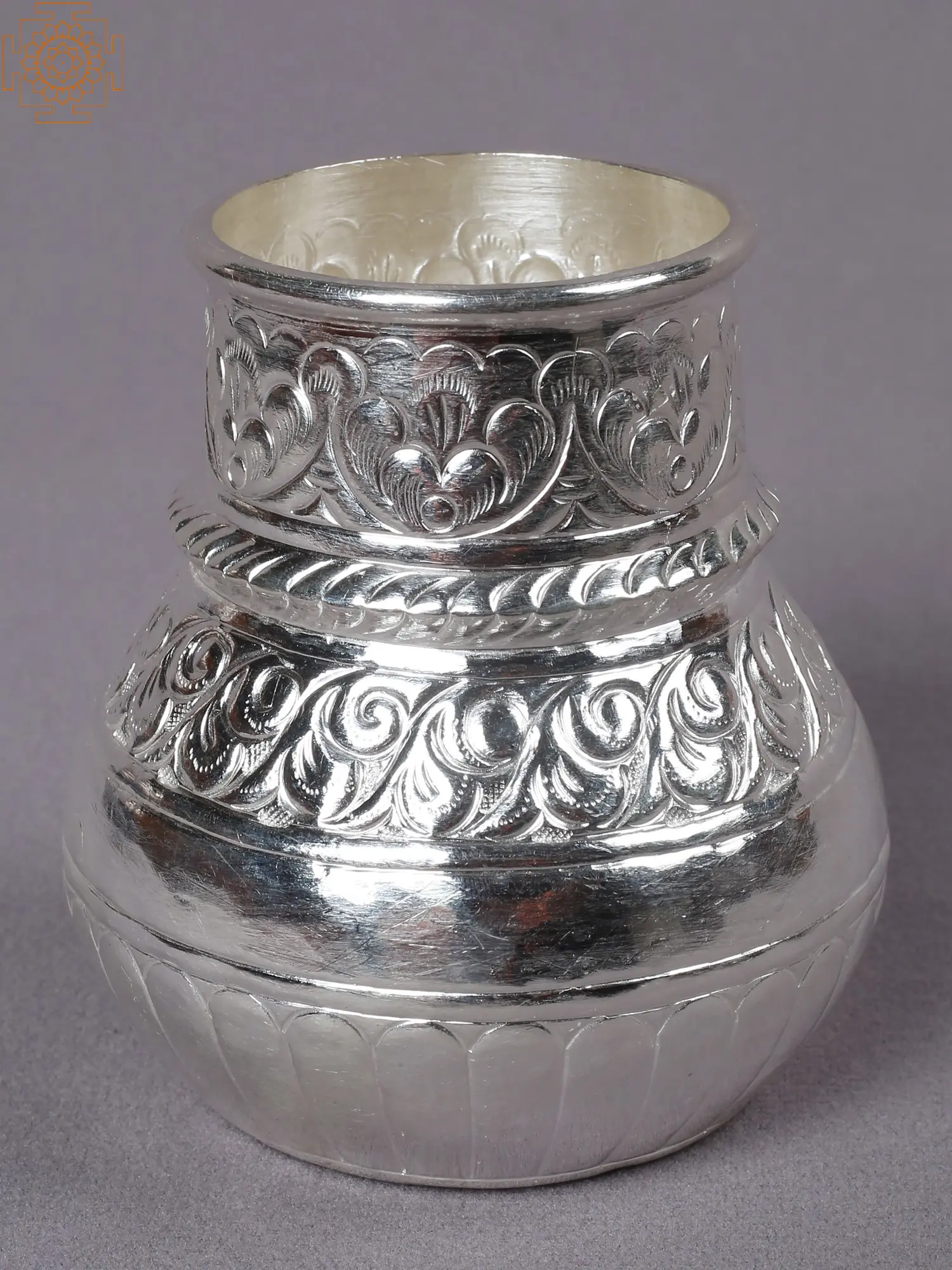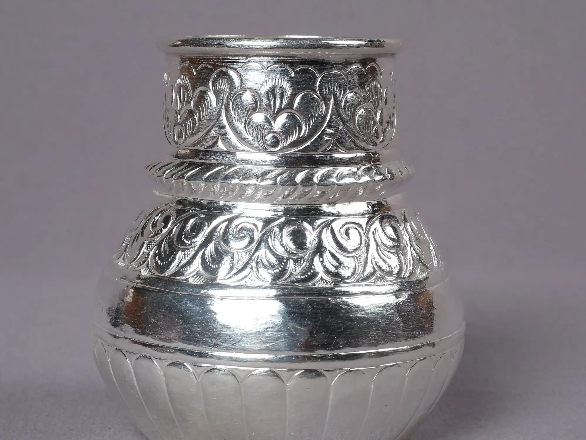 The Silver Mana from Nepal is a sacred and intricately crafted ritual object, revered for its spiritual significance and exquisite craftsmanship. Made from fine-quality silver, this Mana is adorned with traditional Nepali engravings and Asthamangala symbols, symbolizing auspiciousness and divine blessings. The Mana holds profound spiritual significance in Nepali culture and religious rituals.