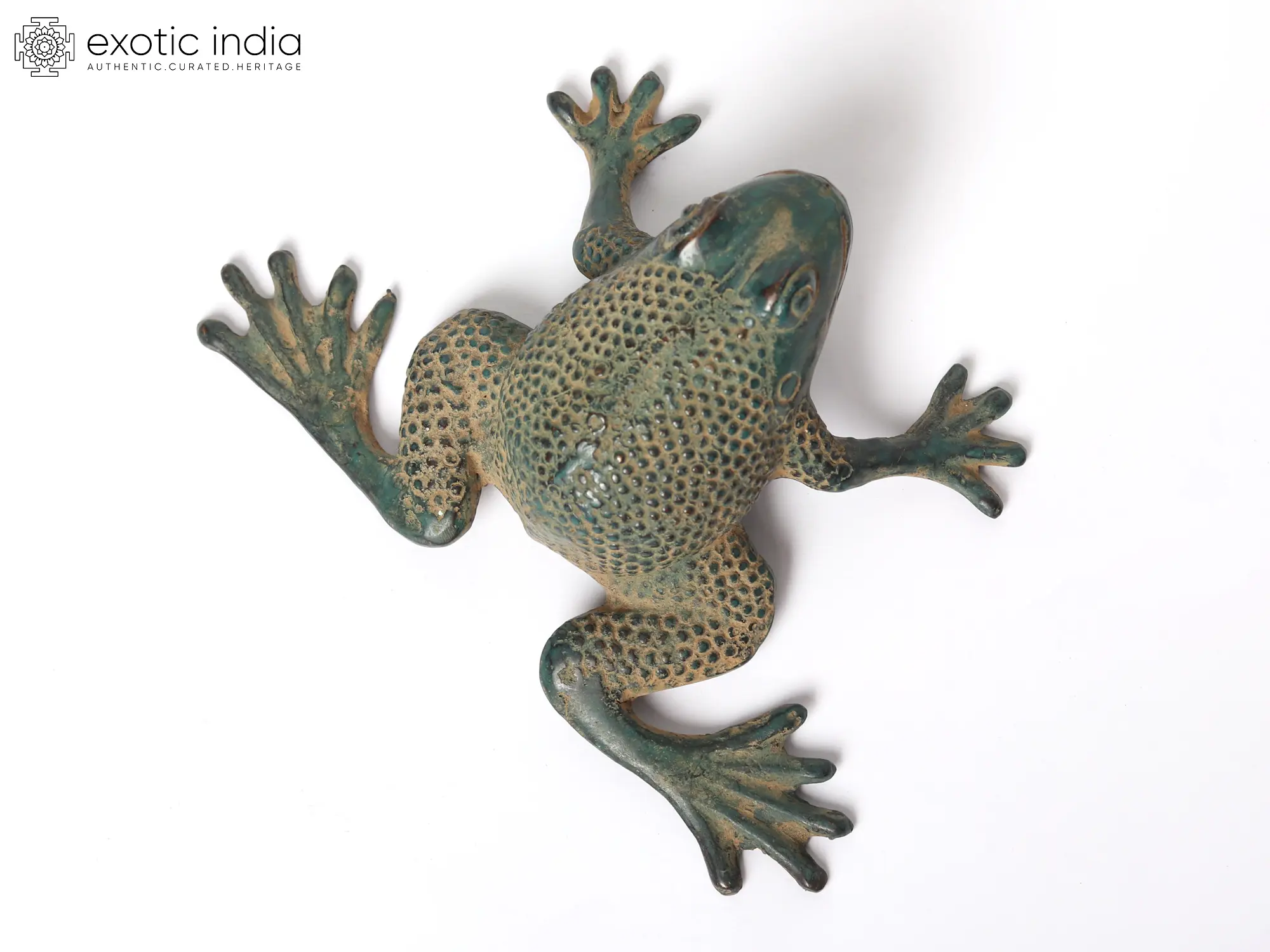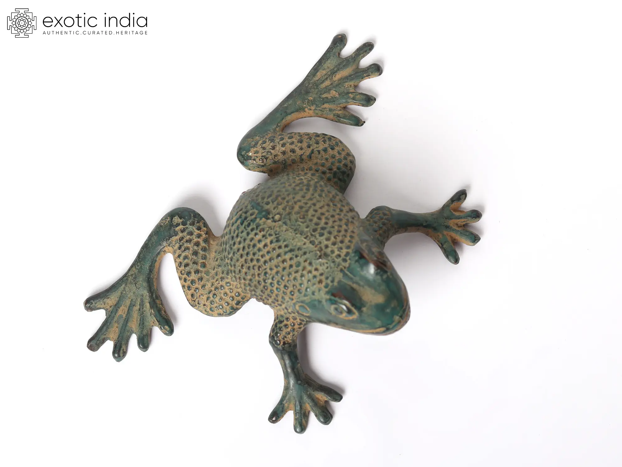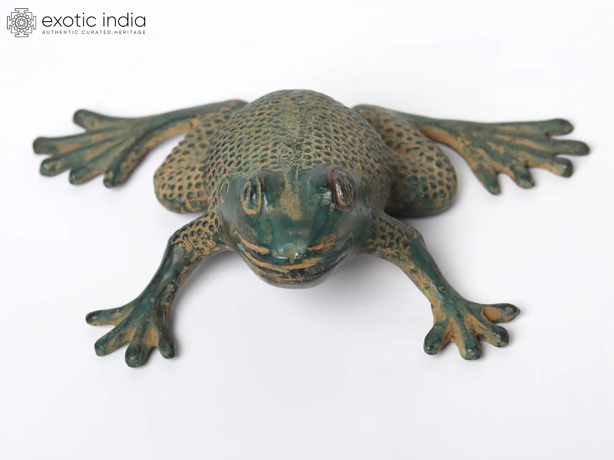 This Small Brass Frog Home Décor symbolizes metamorphosis and renewal. The frog plays a vital role in Indian folklore as it stands for transformation and regeneration. The frog, made of brass with a beautiful natural green patina tint and life-like appearance, arouses curiosity. Positioned in mid-leap, the front legs are held at attention while the back legs spring into action. The frog has a fine dot on its body and looks like a real toad. This brass frog exudes the magic of transformation, for it would be an exceptional addition to the decoration.