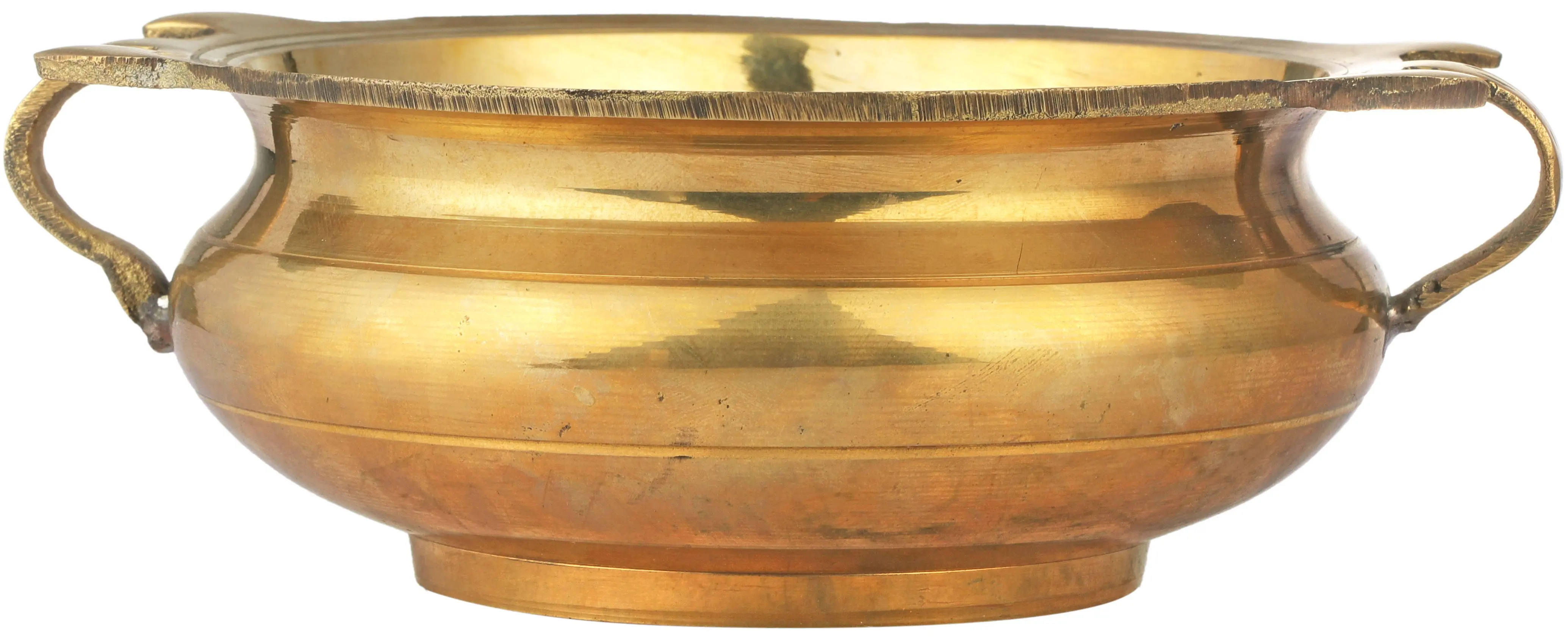 This urli is crafted from quality brass, ensuring durability and longevity. The metal’s inherent shine is enhanced with a distinct green patina, giving it an antique aesthetic. The patina adds depth and character, accentuating the smooth curves and form of the piece. This artistic application makes each piece a unique work of art, no two are ever exactly alike. The two handles are designed with a touch of Indian artistry and provide additional grip.