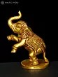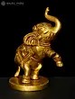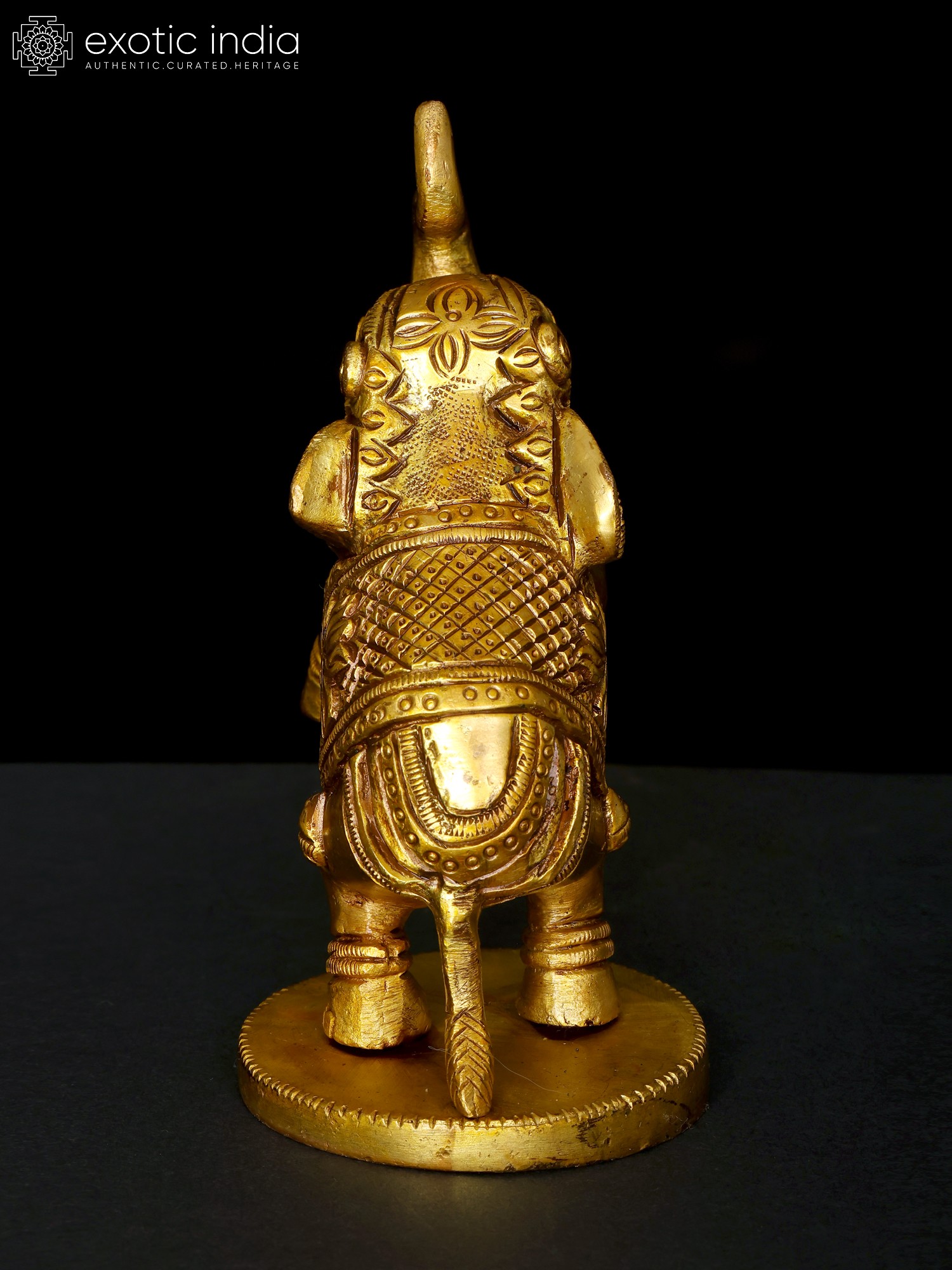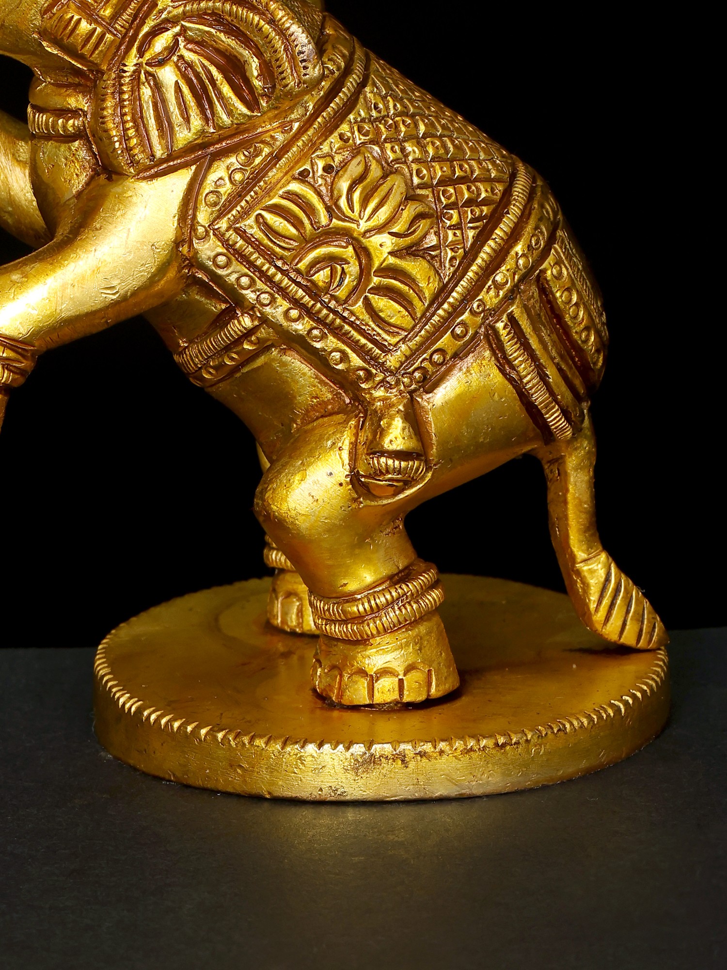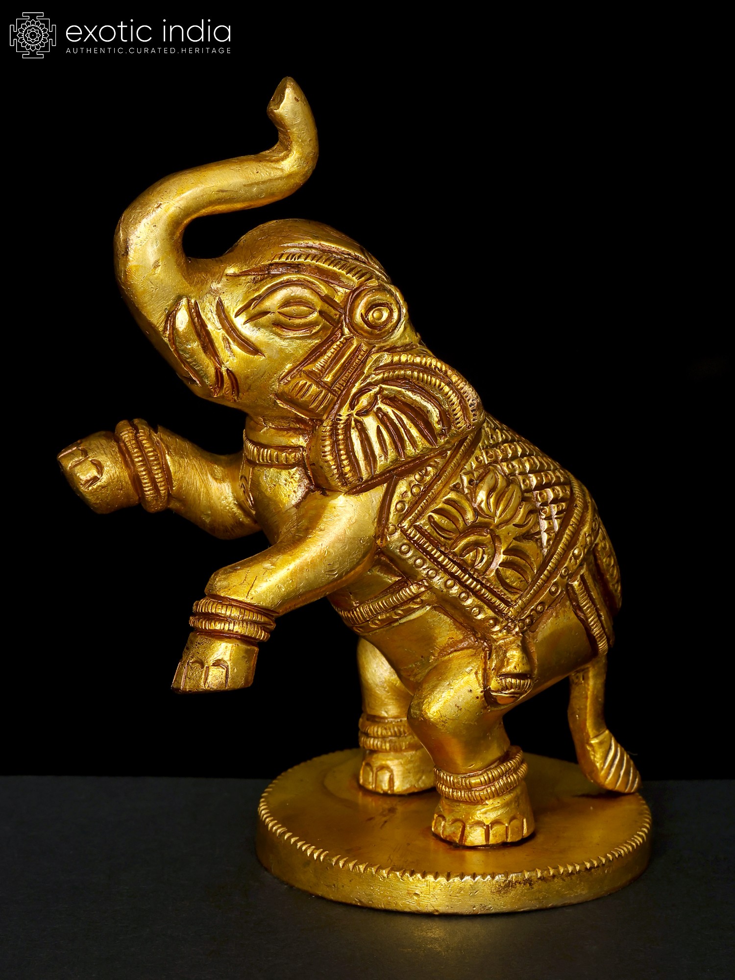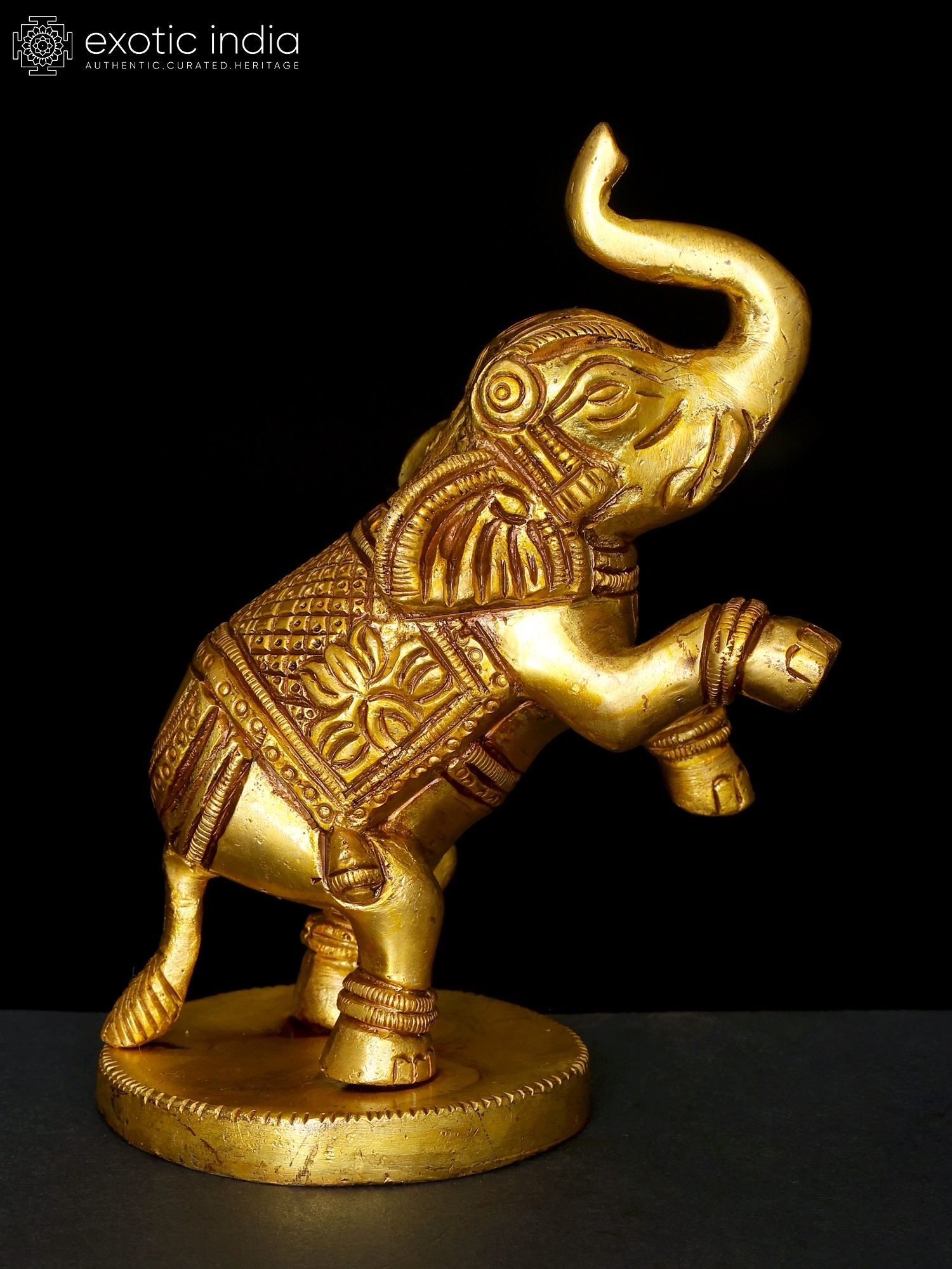 Lunging towards the sky, this small brass elephant embodies growth and infinitude in the virtues of regalia and strength, which are symbolized by the gentle beast in Indian culture. Balancing its body on its hind legs on the circular platform, the elephant is caught in a moment of unimaginable dynamism, which makes this small statue a piece of aesthetic marvel and a source of liveliness in your space.