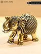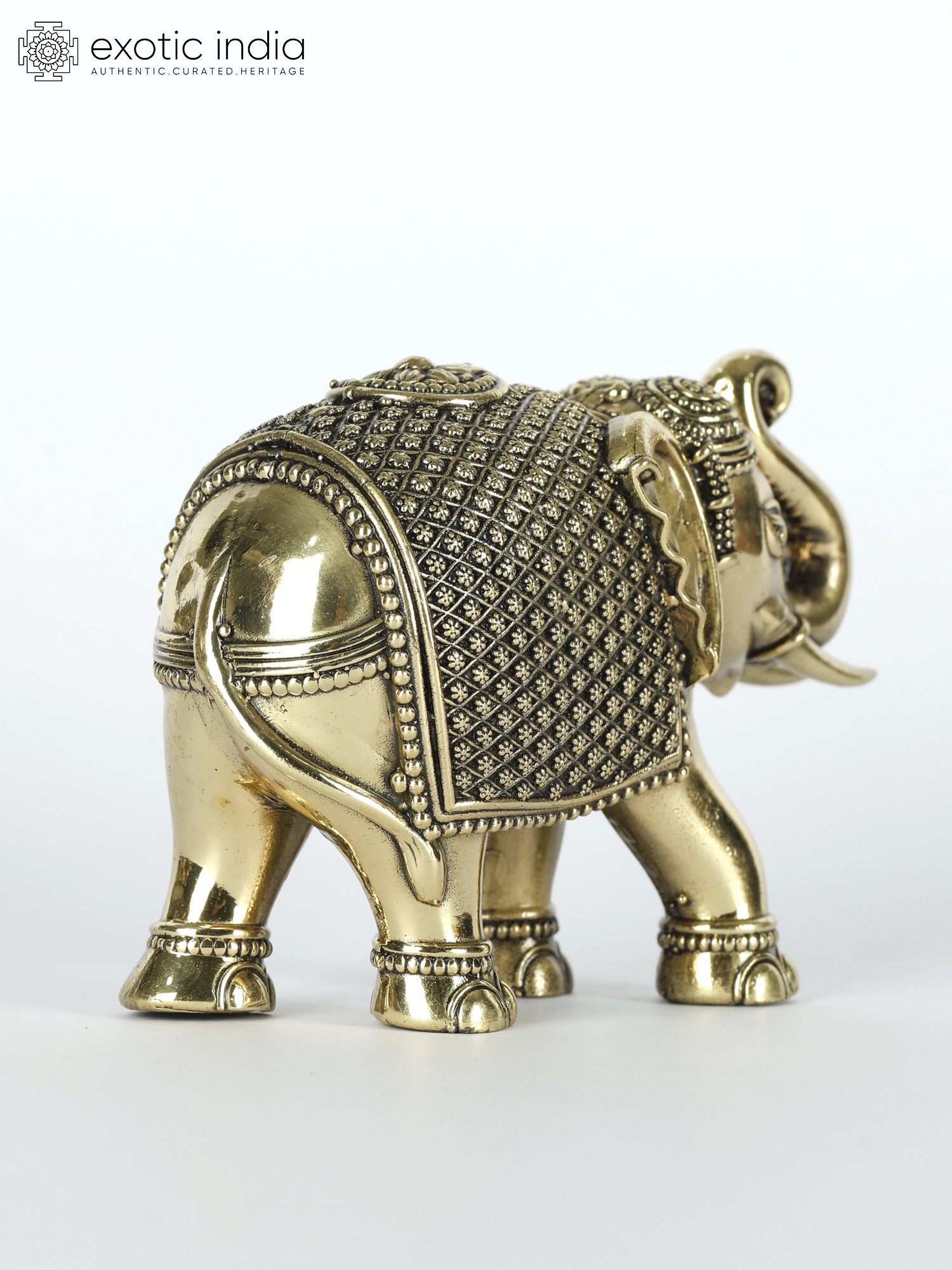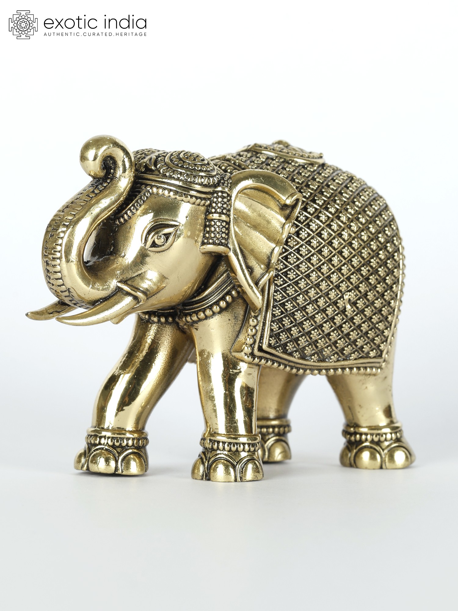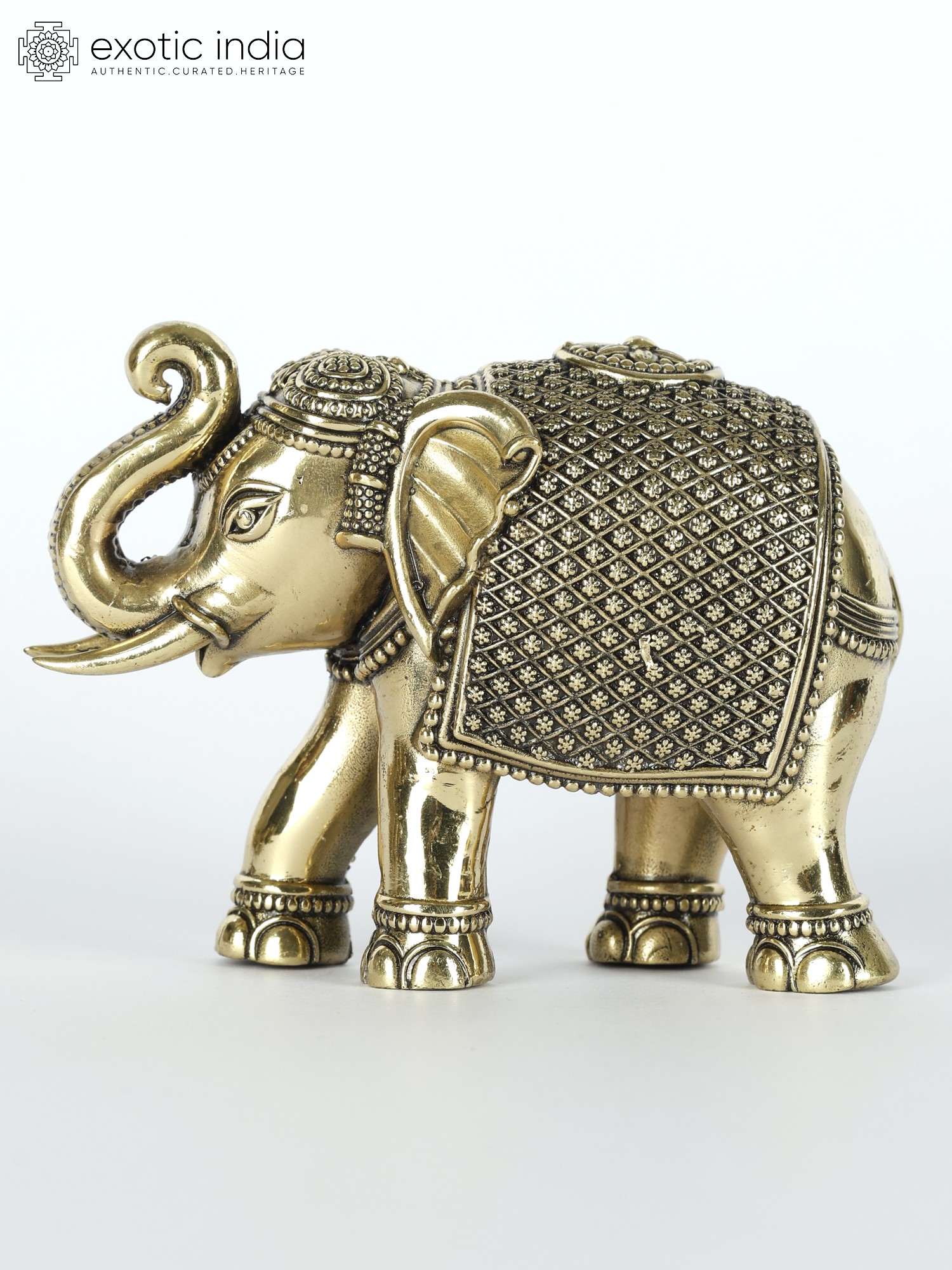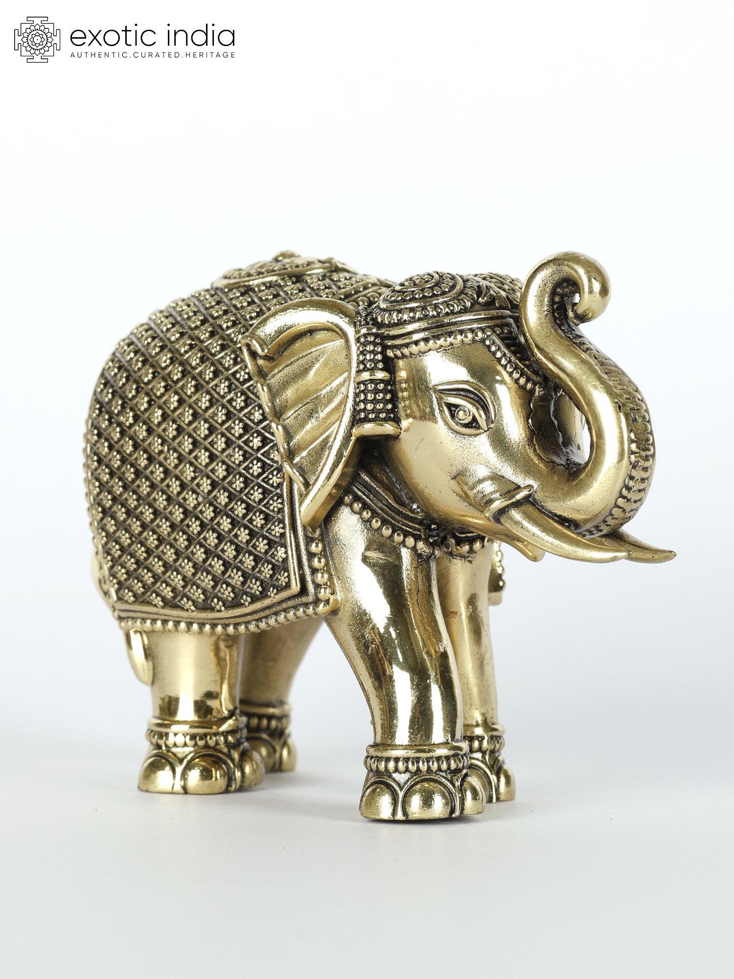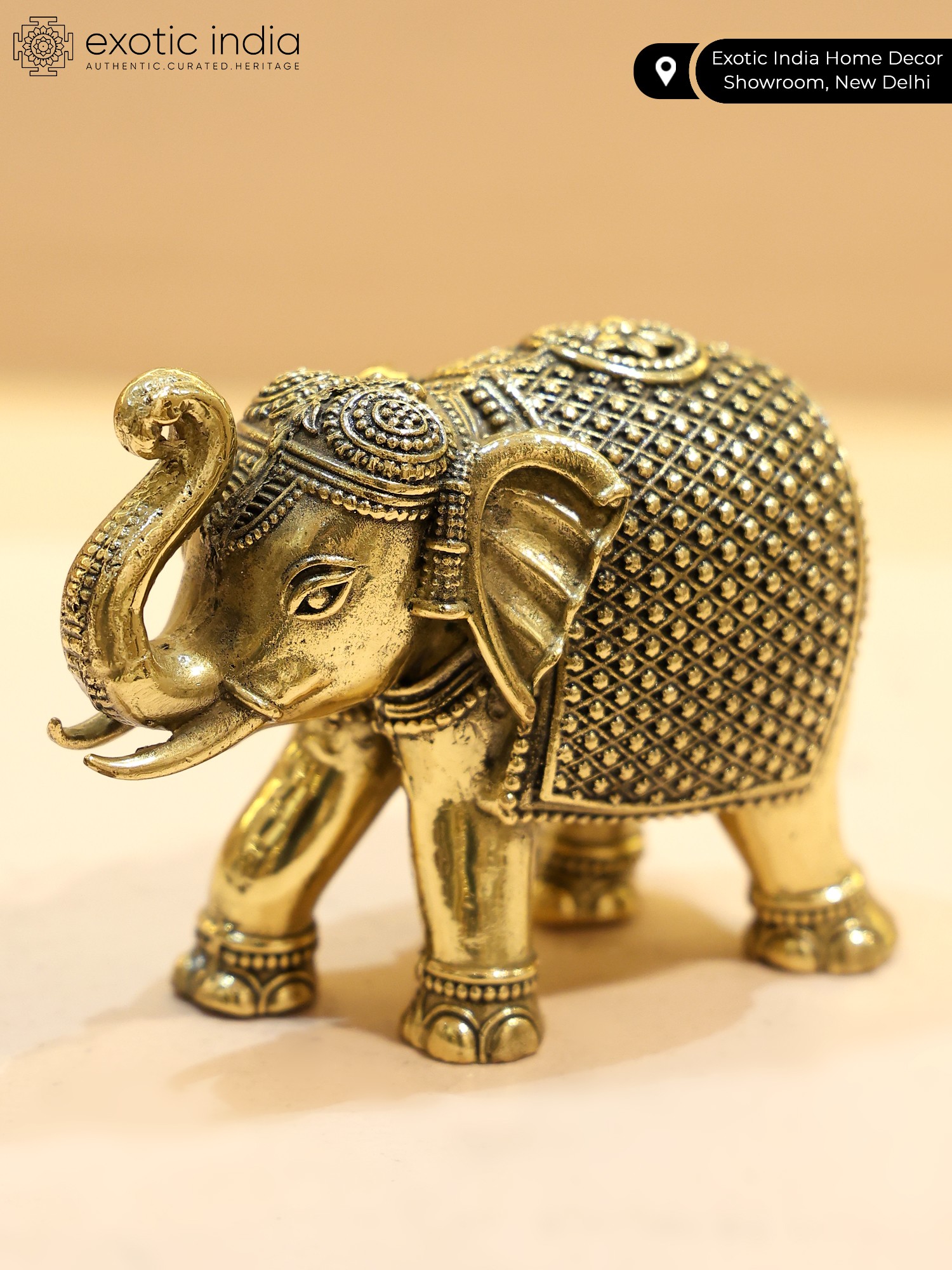 This superfine brass elephant takes a powerful stance, with legs placed in a lively pose, and his trunk in the air, as if offering salutation to a guest, creating an atmosphere of positivity.