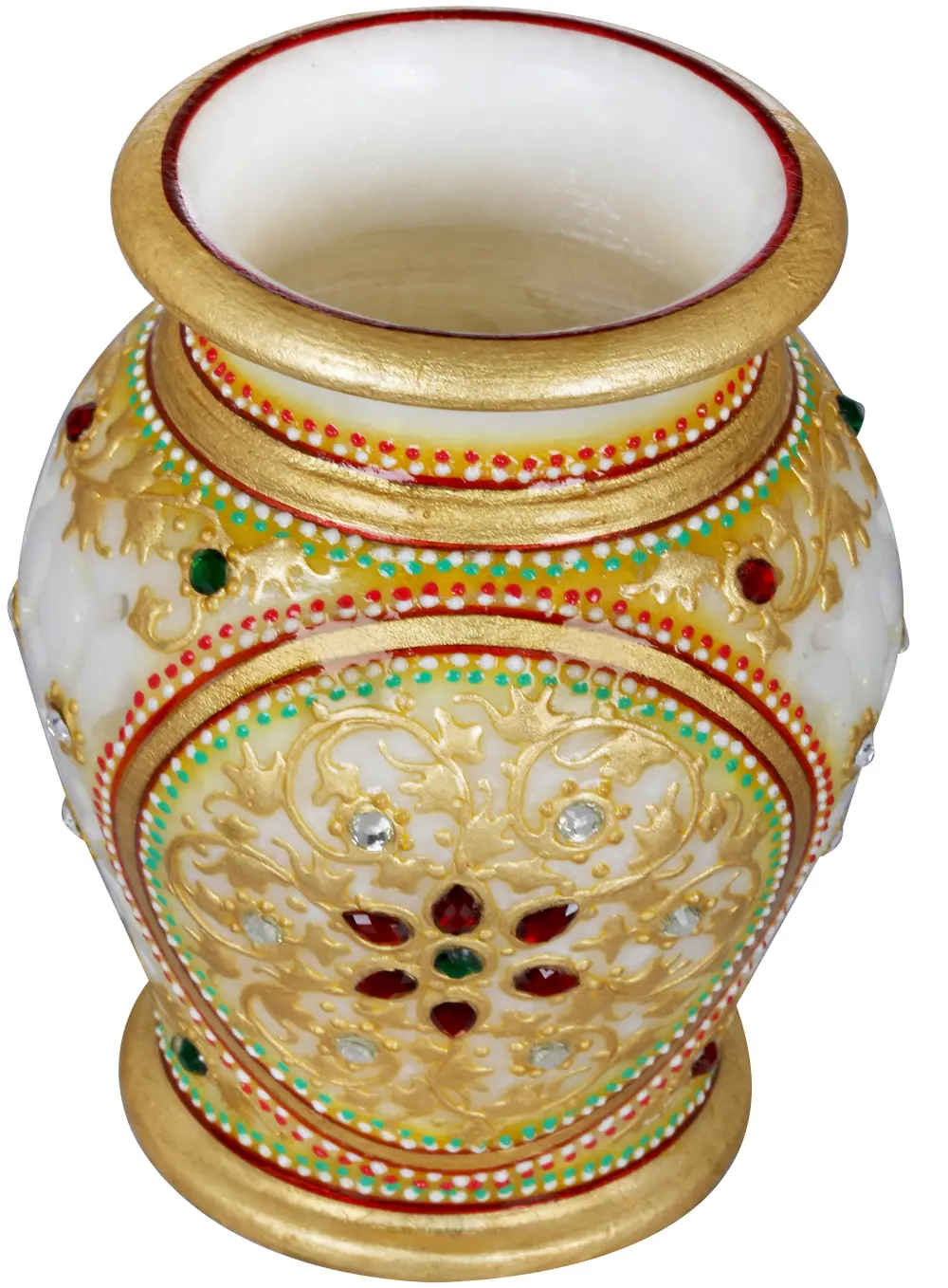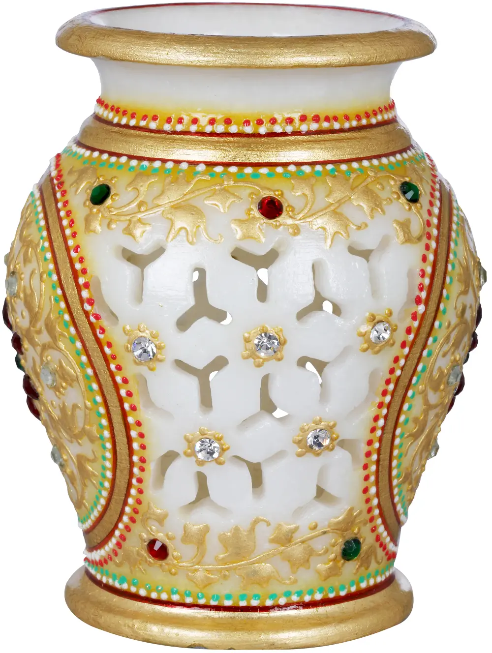 Meenakari work, characterized by intricate golden painted decorations, embellishes this Small Marble Vase with Cut Work, elevating it to an exquisite home decor item. The marriage of delicate Meenakari detailing with the elegant marble base creates a stunning visual contrast, capturing attention and adding sophistication to any space.