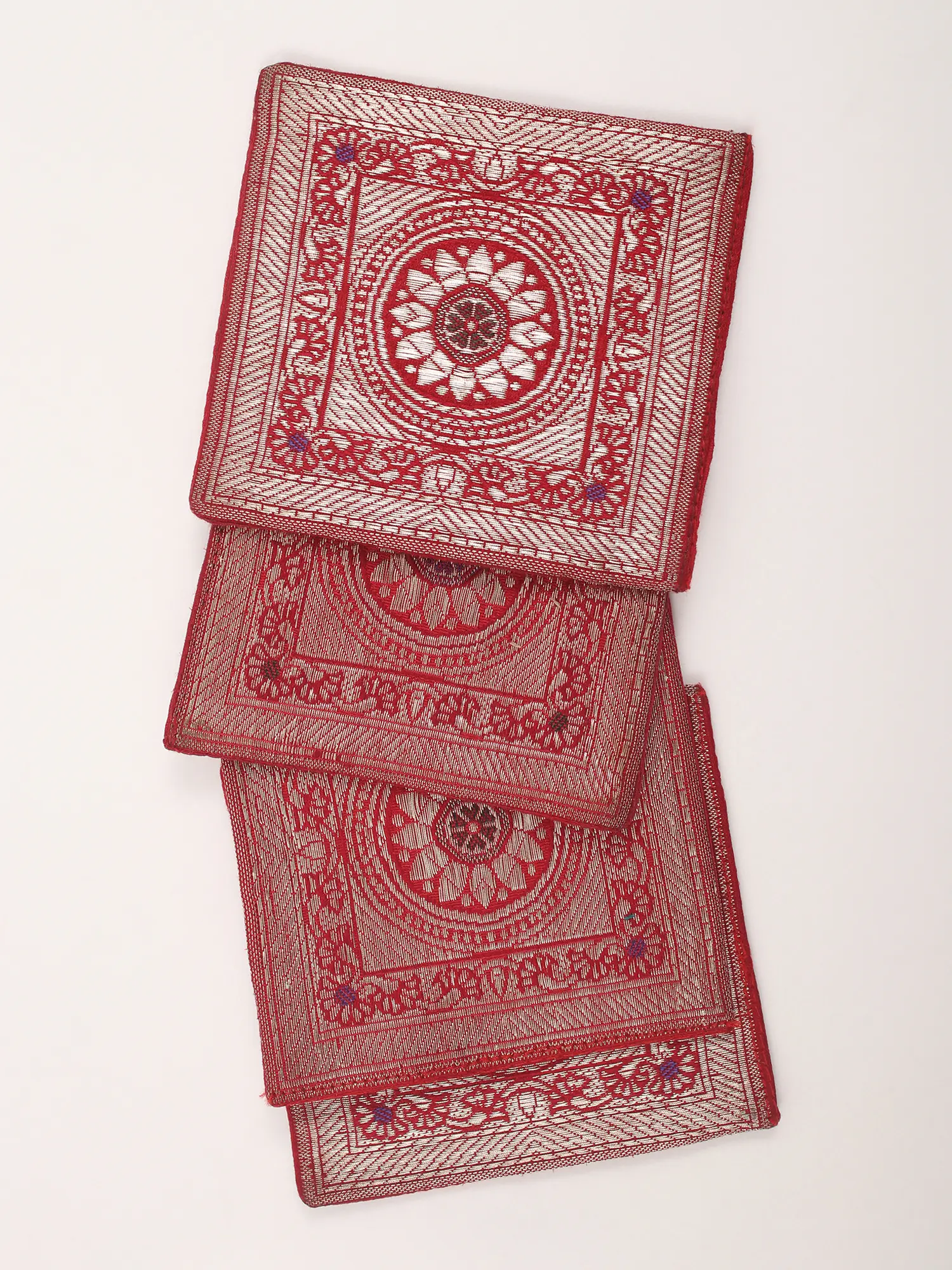 The choice of vibrant colors and meticulous detailing showcases the artistry inherent in the craft. Functionality meets aesthetics, as these coasters not only protect surfaces but also serve as beautiful pieces of traditional art. Perfect for adding a touch of Banarasi heritage to any table setting, these coasters are both practical and aesthetically pleasing.