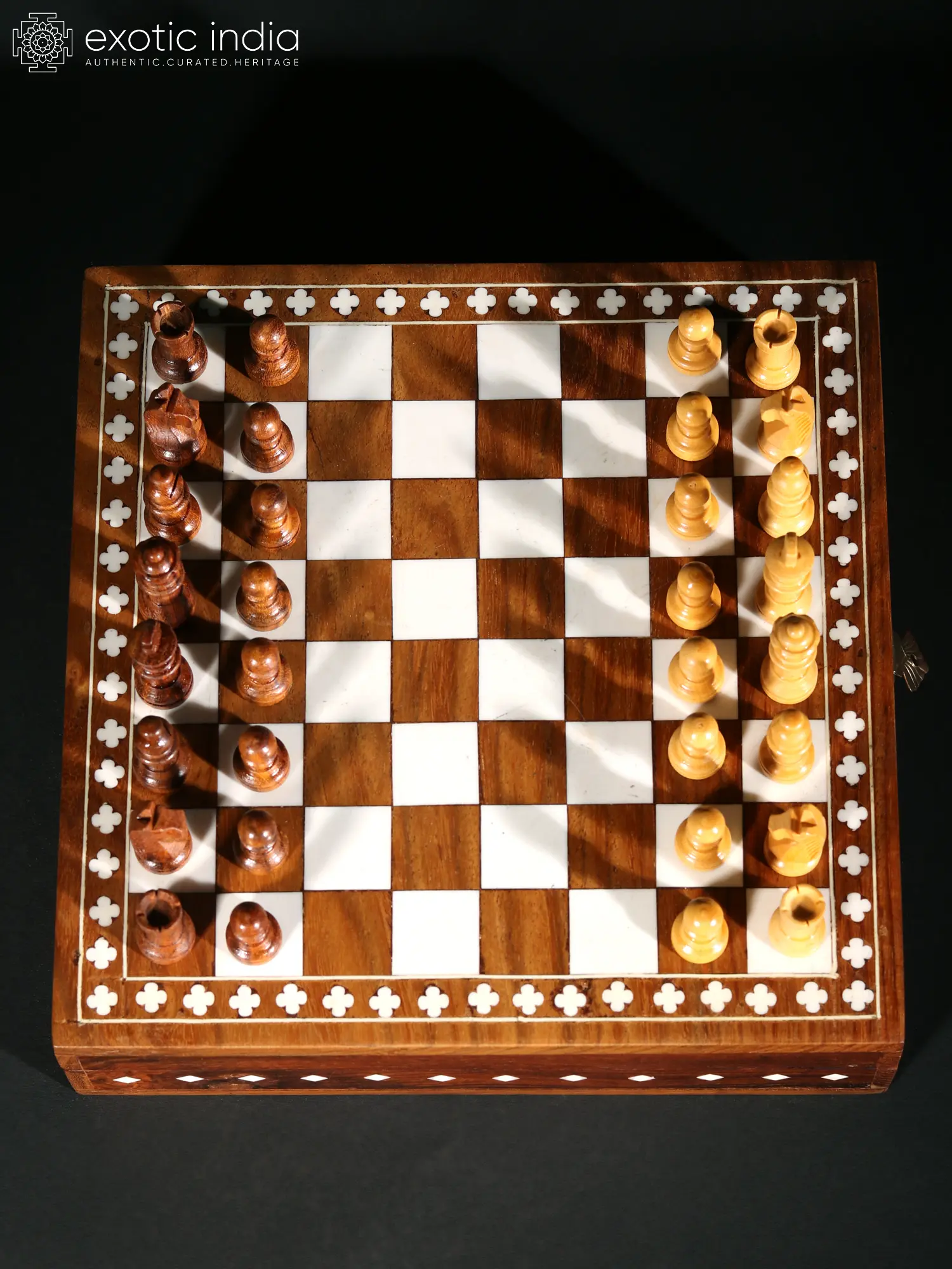 The meticulous inlay work adorning the box showcases the dedication and skill of the artisans who created it. The subtle detailing enhances the rich tones of the teakwood, creating a visually stunning piece that will grace any home. Every piece is carefully positioned, reflecting a commitment to quality that is evident in every aspect of this handcrafted game. The rich brown tones of the teakwood are beautifully contrasted by the creamy white inlay, adding depth and visual interest. The square shape provides a classic and uncluttered aesthetic, allowing the intricate design to take center stage. The compact size is also ideal for travel or for those with limited space.