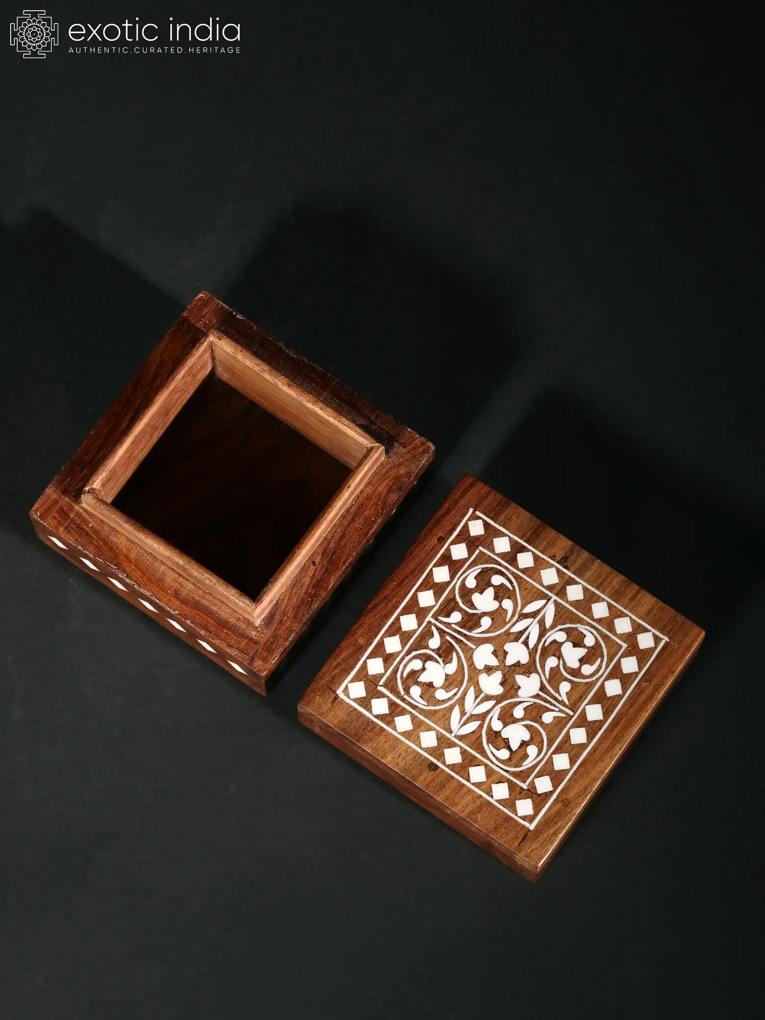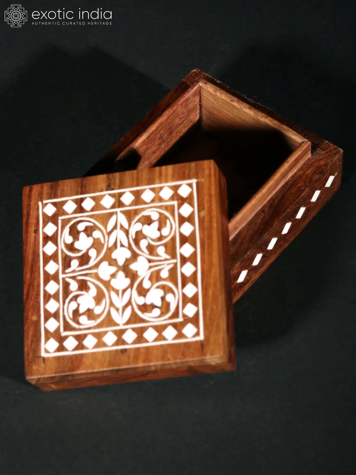 Teakwood with inlay work in India dates back centuries, representing a rich history of craftsmanship. Traditionally used in royal palaces and temples, this artistry involves embedding contrasting materials into teakwood to create intricate patterns. This Square Shaped Jewelry Box seamlessly combines utility and beauty, showcasing this historical craft.