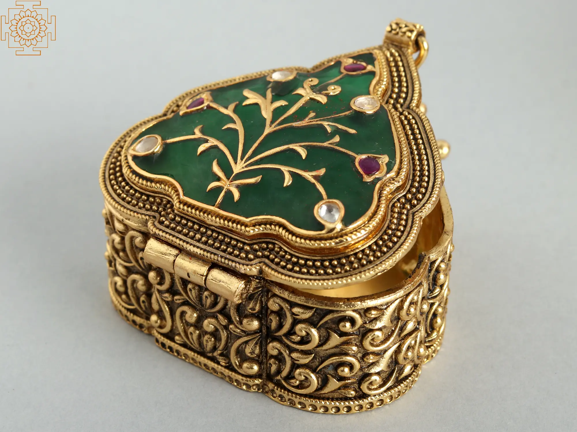 Introducing the Designer Green Leaf Sindoor Box, where artistry meets functionality. Delicately crafted with precision, this enchanting piece captivates with its intricate leaf design, reminiscent of nature's beauty. The vibrant green hue exudes freshness and vitality, infusing your sacred rituals with a rejuvenating aura. Compact yet stylish, it serves as a statement piece for your dressing table or puja room. Embrace tradition with a contemporary twist as you adorn your marital rituals with this exquisite sindoor box.