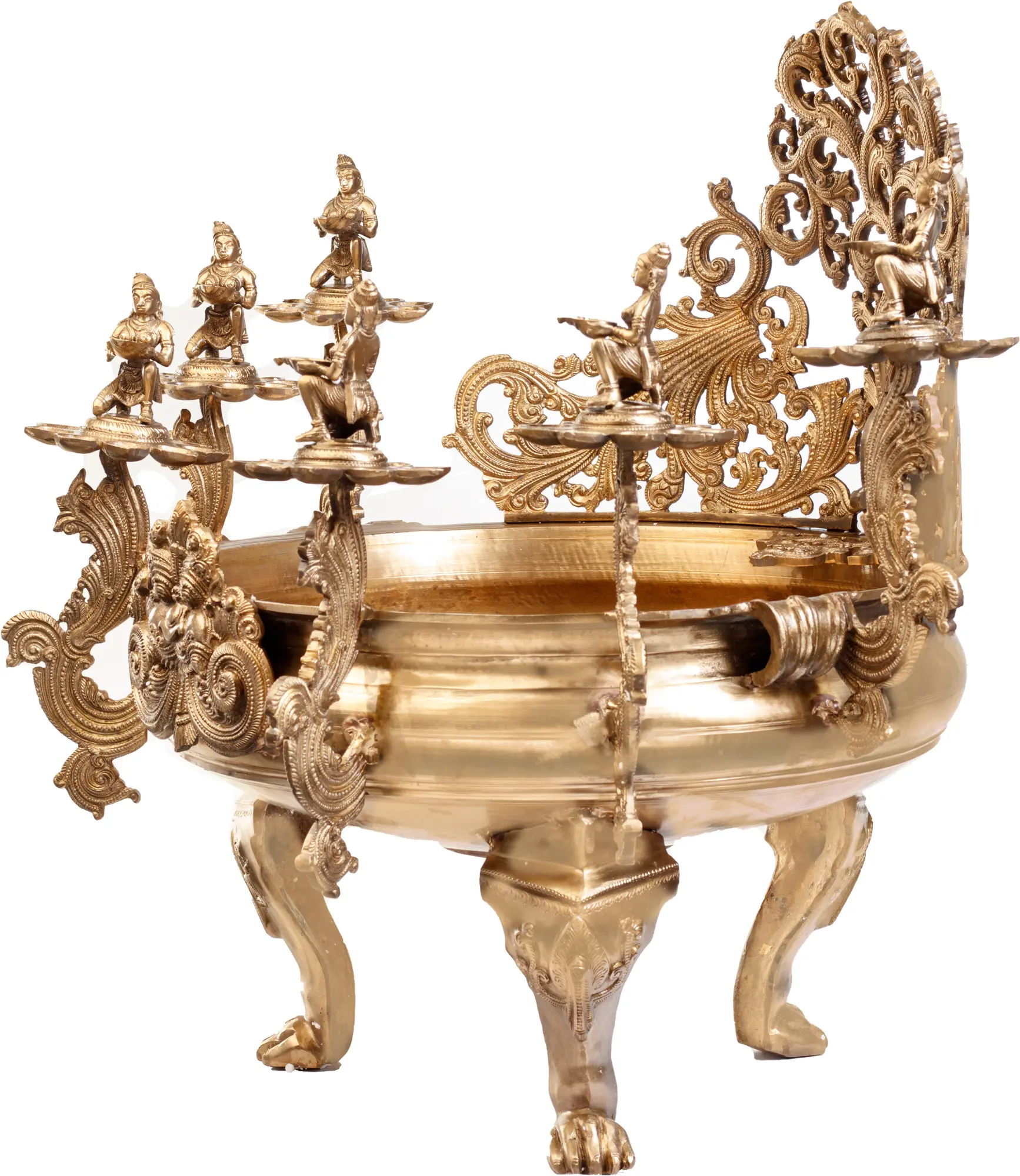 There is a divine figure of Kirtimukha on the chest of the Urli making it a perfect fit for placing idols which is further confirmed by the presence of a small throne inside the Urli. Looking magnificent from all angles and exuding divine grace, the Urli attached with lamps also comes with stands resembling lion paws. The piece has been constructed for a house that carries regal status, inspired by the Mysorian Royalty.
