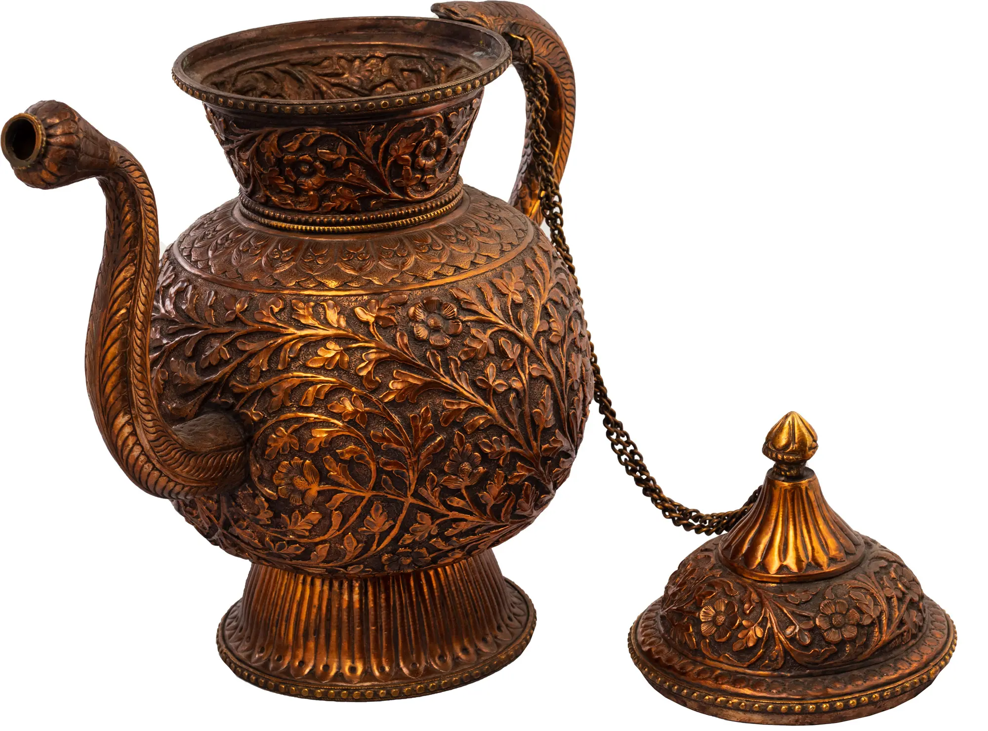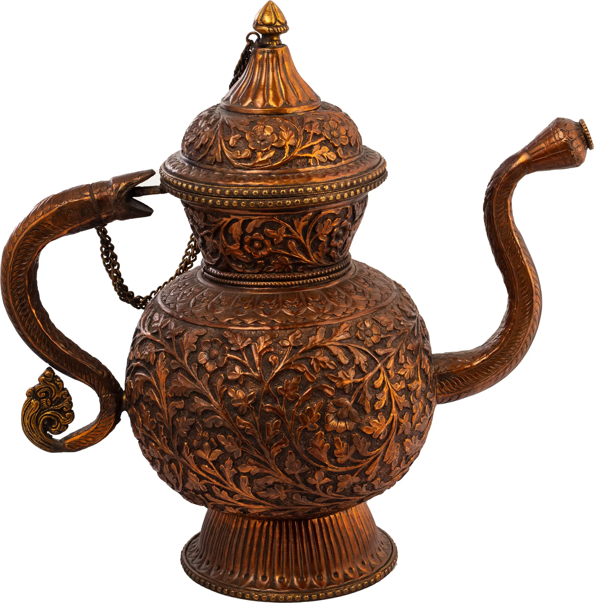 The attention to detail is immediately evident. From the delicate floral patterns adorning the body to the ornate lid, every aspect exudes quality. The lid, secured by a graceful chain, adds an element of practicality while enhancing the overall aesthetic appeal. The handle is meticulously fashioned to resemble a serpent, its scales intricately detailed, and lends a touch of mystique to the piece. The spout mirrors this artistic expression. The base provides a stable foundation, featuring vertical lines. This piece offers a visual treat from every angle. It will easily make any space feel just a little more special.