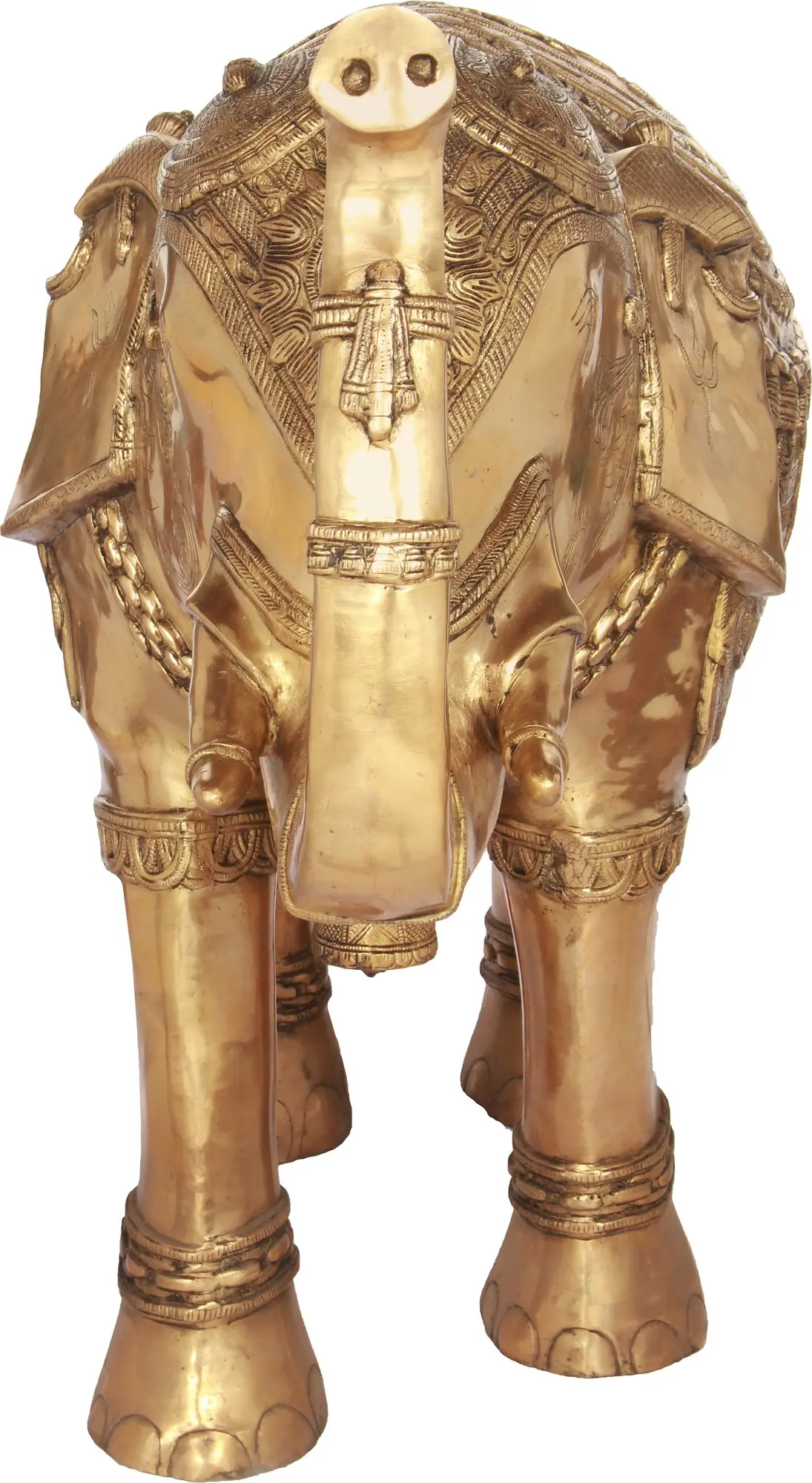 This statue of elephant has a beautifully carved back. It appears to be having an oval shaped wondrous looking carpet laid on its back. Marvelous circular embellishments are adding to its charm. It is wearing thick and phenomenal anklets in all four legs. A bell is hanging in the front. The two big floppy ears at the sides are shown as wearing a ring like structure. The trunk, which is raised upwards, is magnificently decorated with three bands, wrapped at a distance highlighting its uniqueness. Mouth of the elephant is open and it seems as if it is giving a smiling expression or enjoying its beauty by singing a sweet song. The carvings cover the forehead in a neat triangular pattern. The small tail at the back is slightly tilted towards the left leg. Two teeth peeping out from sides are very valuable. Many ornaments and decorative items are made from them.