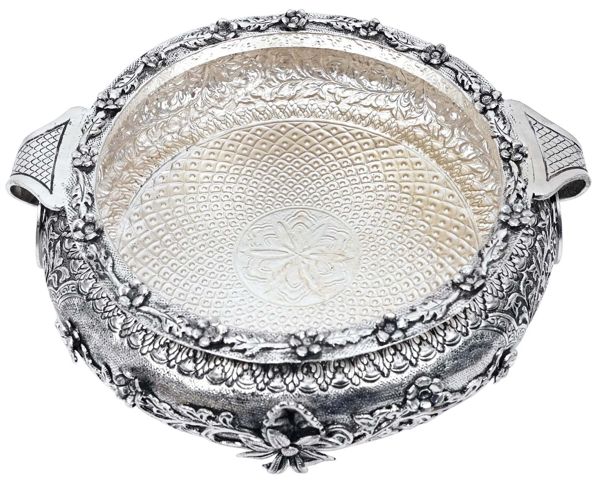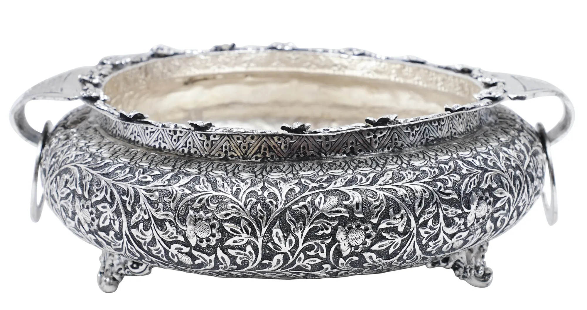 This traditionally gracious urli shown on this page is coated in a vibrant silver color with the extensive three dimensional carvings of flowers laid at the brim and the small legs tilted outwards give it an authentic vision. When you zoom in you will see major floral carvings of all kinds and manners distributed in amazing parallel layers on the circumference with mini outstretched semicircular handles on both sides having solid rings entangled in them respectively.