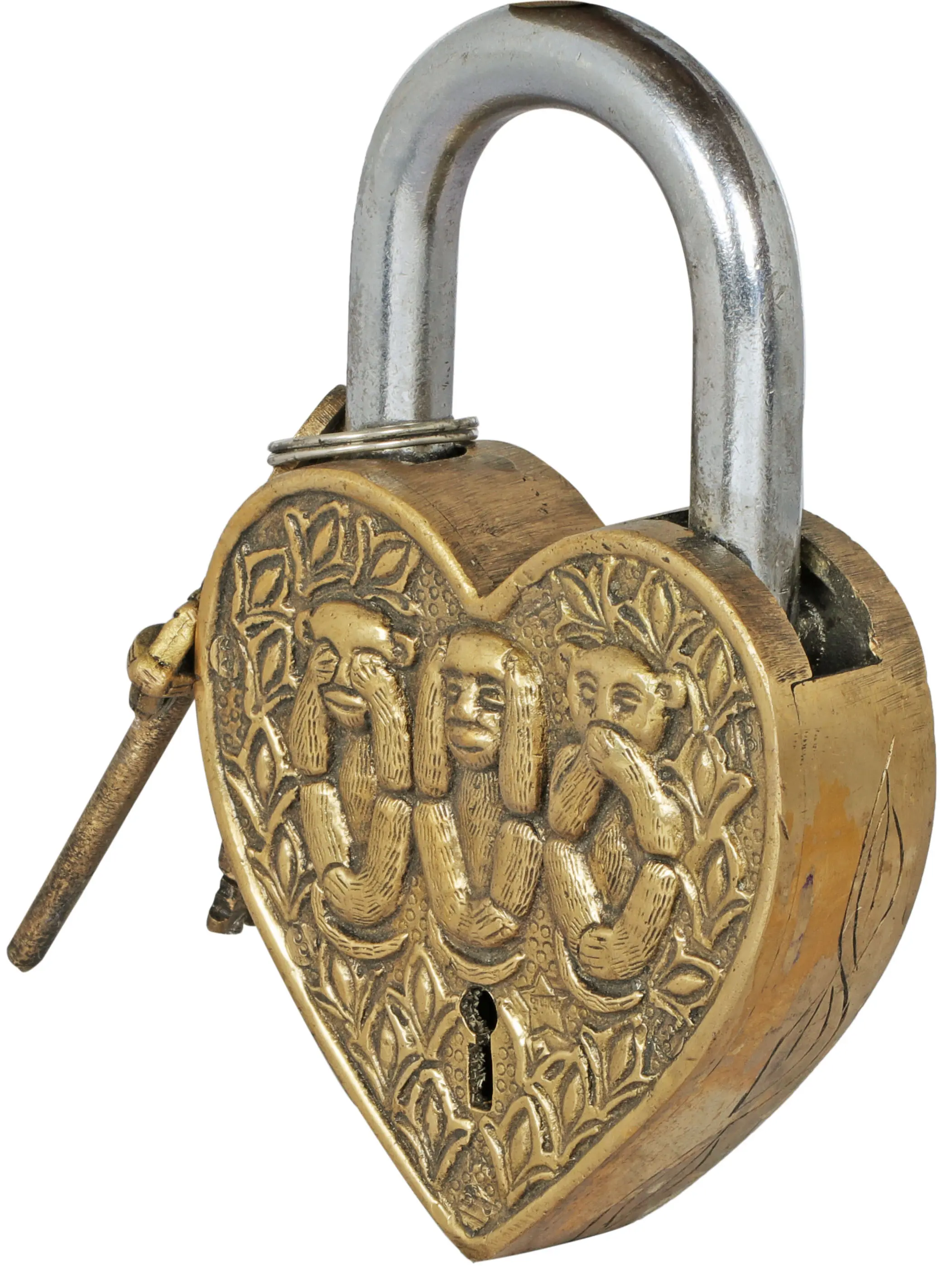 This is more than just a lock; it's a statement piece. Crafted from solid brass, this uniquely designed lock brings a touch of ancient wisdom to your everyday security. The heart-shaped form is adorned with a detailed rendering of the Three Wise Monkeys, embodying the age-old proverb "See no evil, hear no evil, speak no evil." It's a beautiful object with profound meaning.