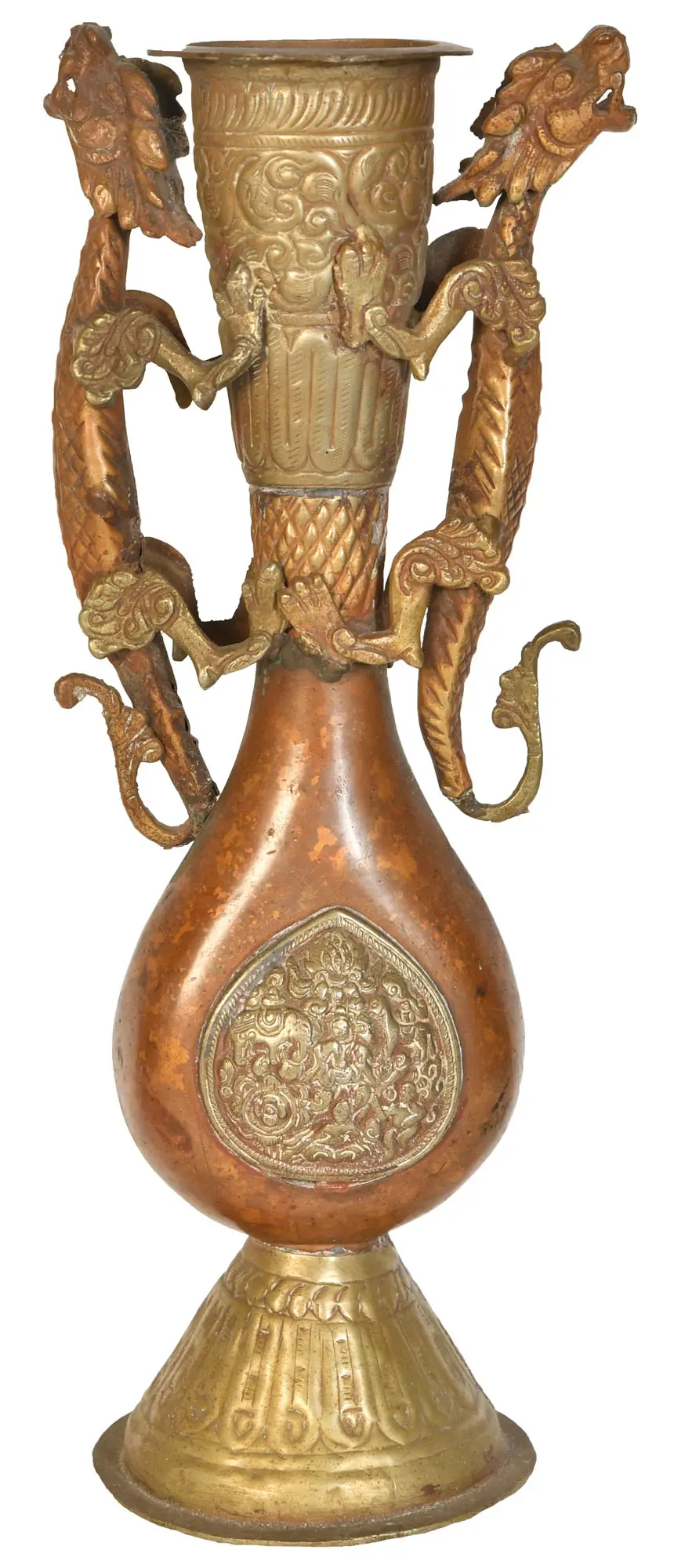This unique vase showcases meticulous workmanship. Two intricately carved dragons coil sinuously around the main body, their fierce yet elegant forms lending an aura of strength and protection. Their scales and facial features are rendered with remarkable precision, demonstrating the artisan's skill and dedication. At the center of the vase, an embossed medallion tells a silent story, showcasing traditional motifs in exquisite detail. The subtle contrast between the medallion and the copper background provides visual depth and complexity. The textures, from the smooth body to the meticulously detailed dragons, invite both visual and tactile appreciation.