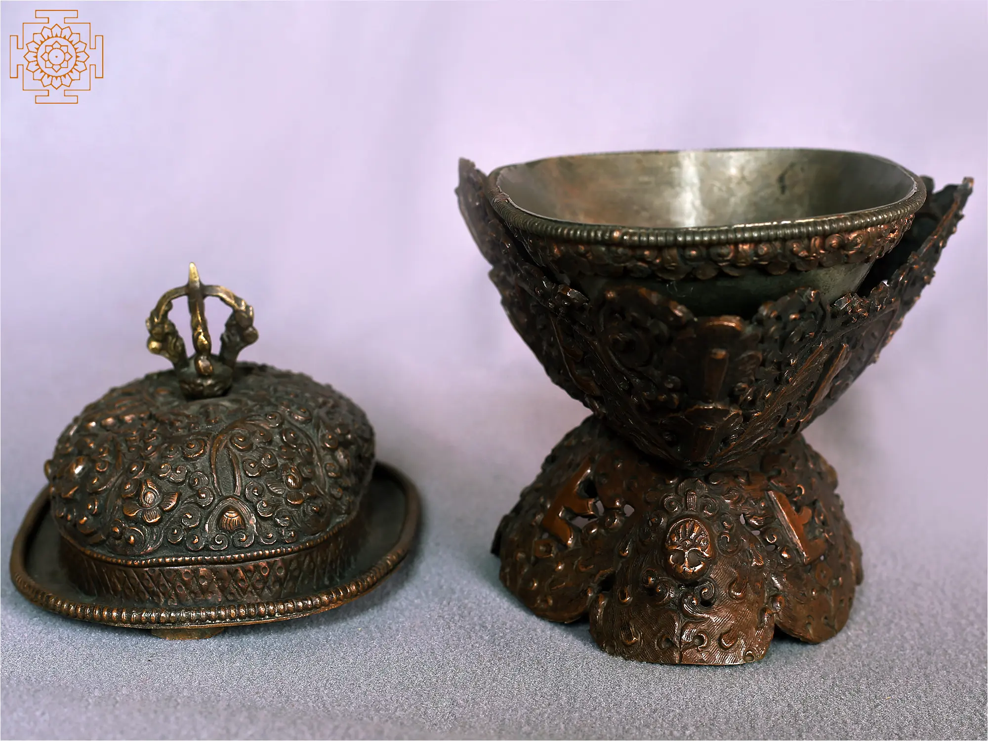 The entire surface of this vessel is adorned with a mesmerizing array of traditional Tibetan motifs. Swirling floral patterns interlace with geometric designs, creating a visually complex and engaging texture. The dome-shaped lid is crowned with a delicate, multi-tiered finial that adds an element of regal elegance. The base is equally ornate, featuring sculpted elements that evoke a sense of ancient artistry and reverence. Each detail has been meticulously rendered, showcasing the artisan's dedication to their craft. The subtle patina across the sterling silver enhances the depth of the carvings, giving the piece a timeless quality. ––––––––––––––––––