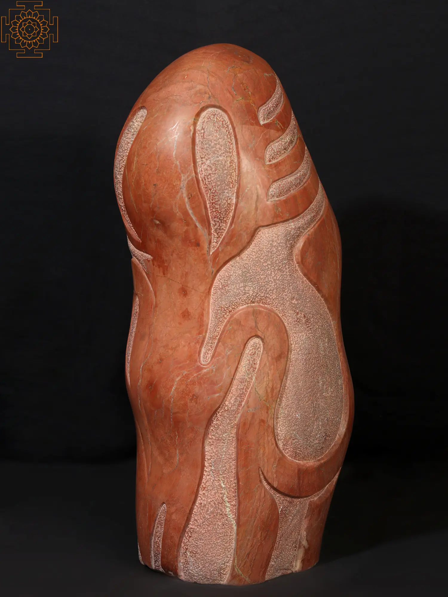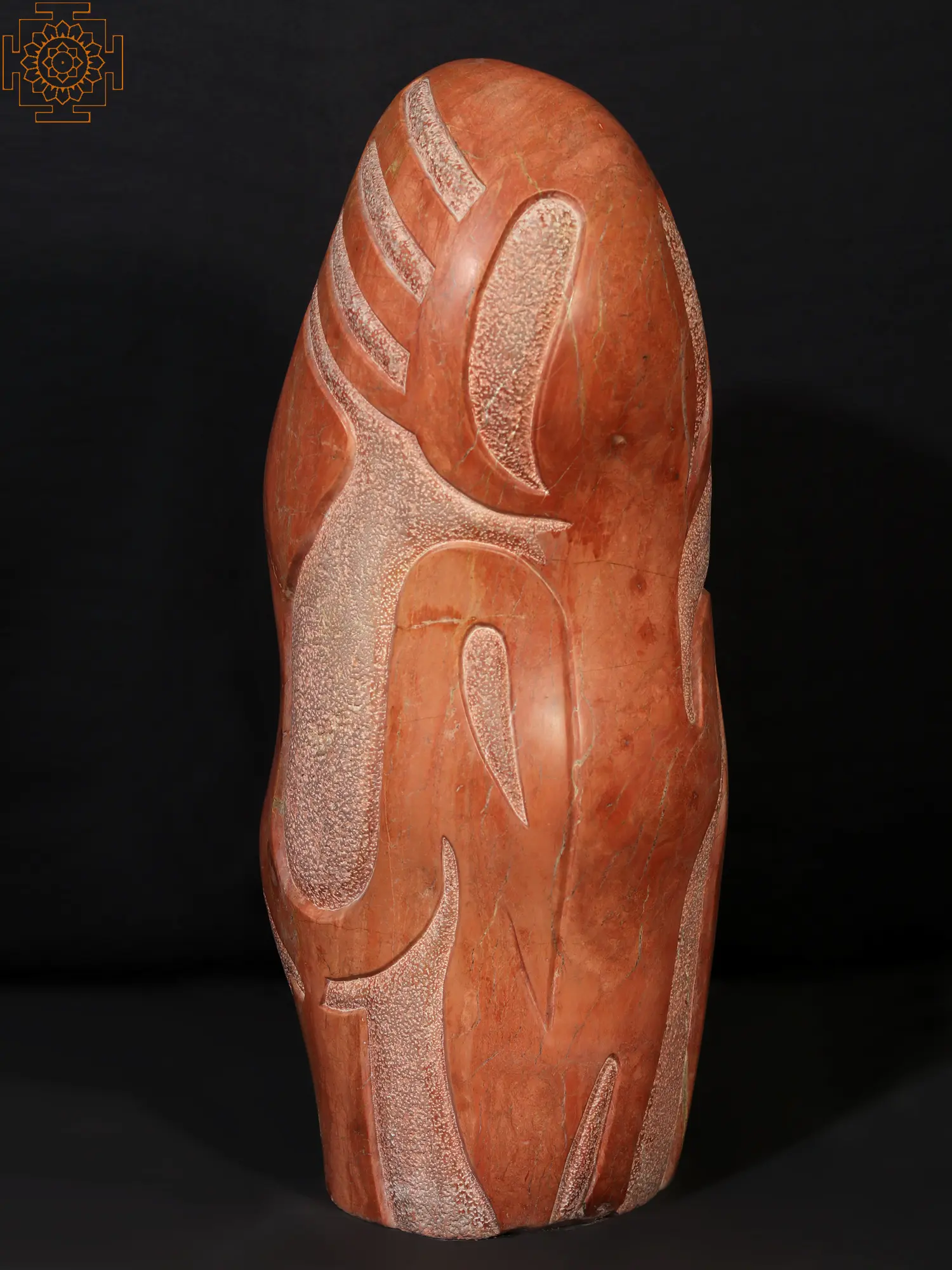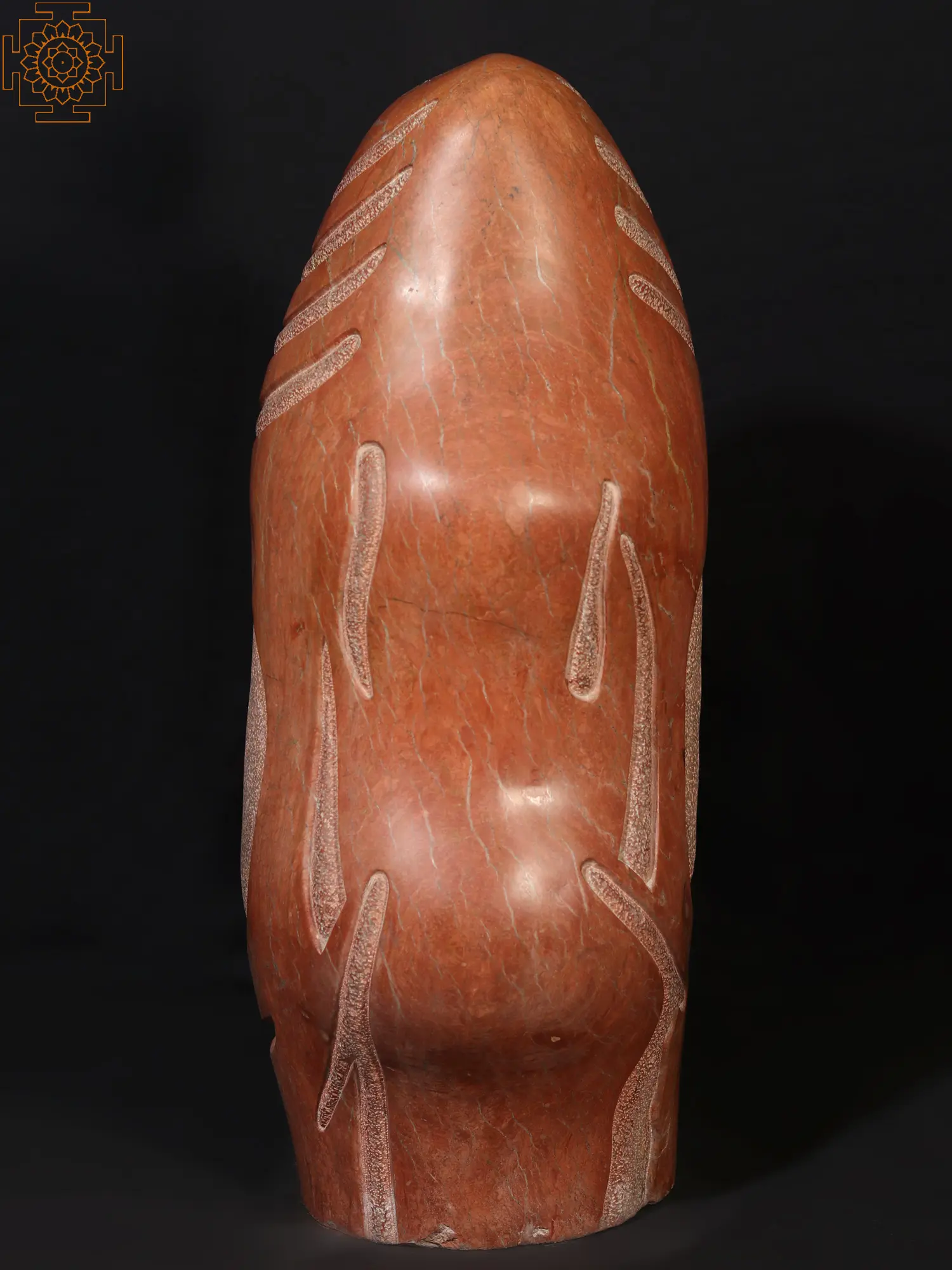 This Pink Saffron Stone sculpture, titled Towards the Linga, is a contemporary interpretation of the phallus or Lingam. The Linga is an auspicious sign that is revered throughout India. This sculpture displays the lingam in an unusual manner while retaining traditional iconography. The chiselling technique is used to etch the three markings that symbolize Shiva's threefold strength of will (icchashakti), knowledge (gyanashakti), and action (kriyashakti). This work of art is ideal for a room dedicated to spiritual enlightenment.