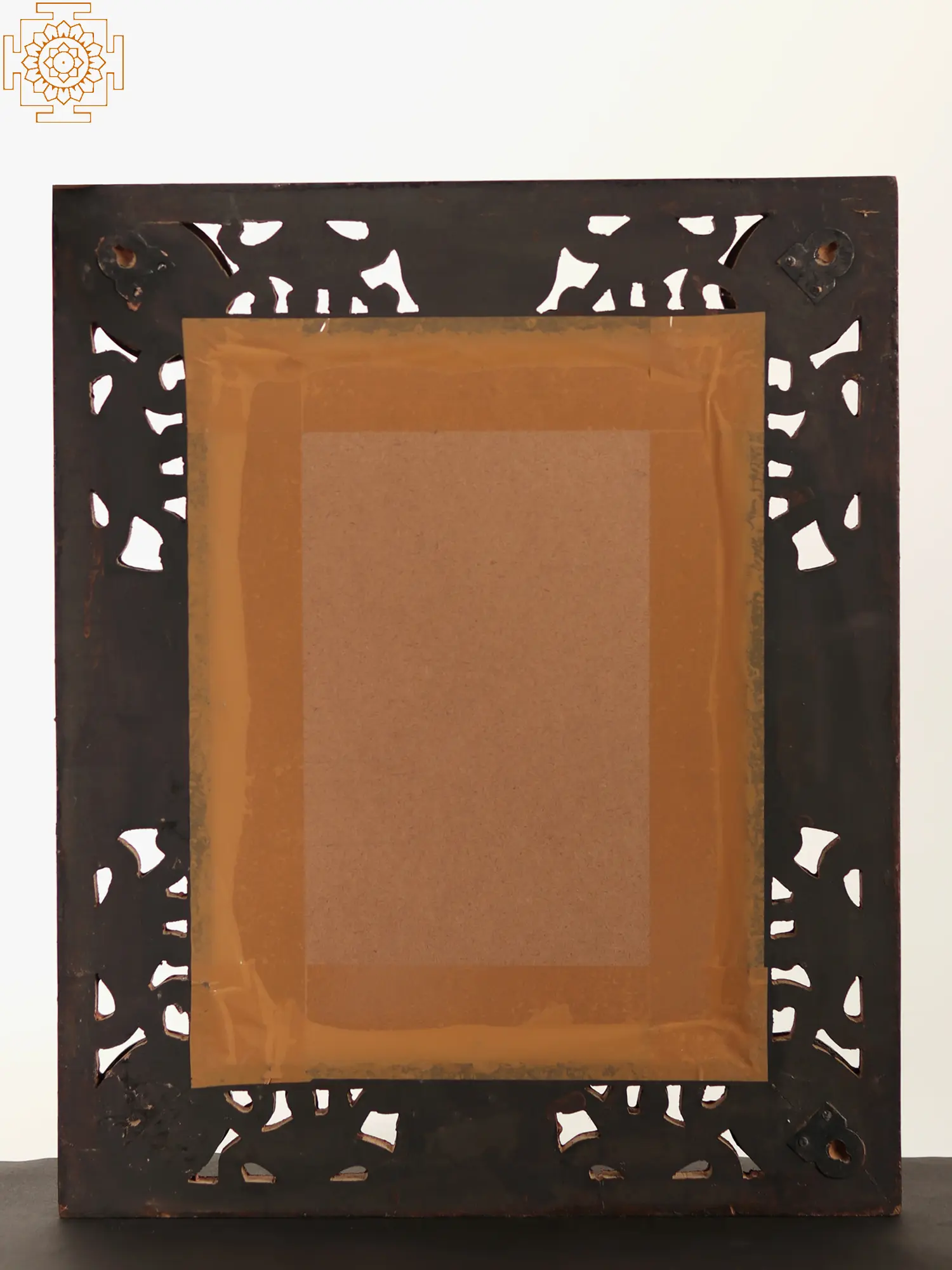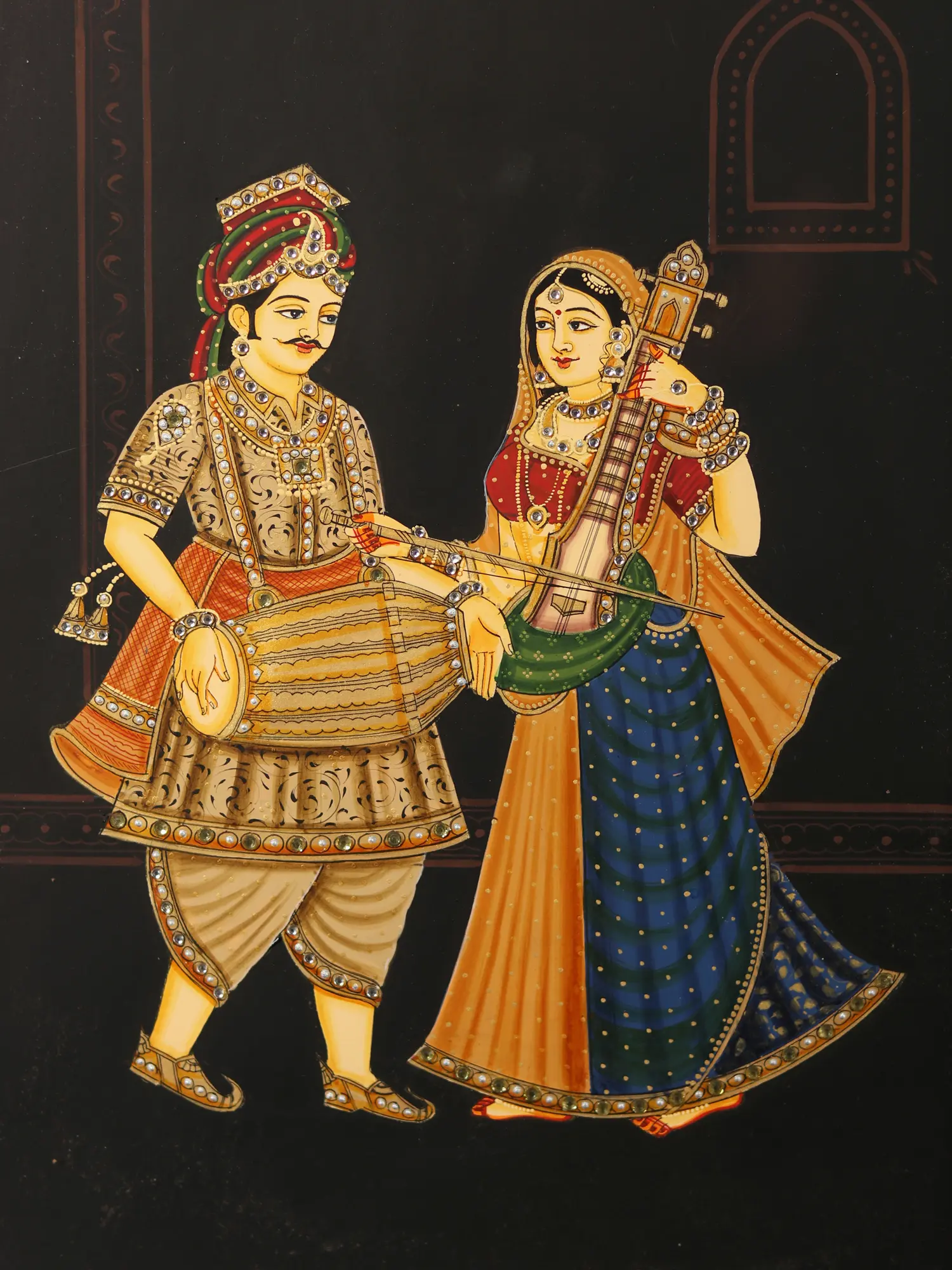 This lovely artwork, housed in an elegant wood frame, is from the Raga Mala school of Rajasthani painting. It is an acrylic painting on canvas with a regal black backdrop and bright and royal figures as the focal point. A Rajasthani couple is pictured here playing musical instruments, the women playing a traditional instrument known as the Chikara. The artist has taken great effort to paint the minute details. This painting with all the heightened features would look great as a living room decor.