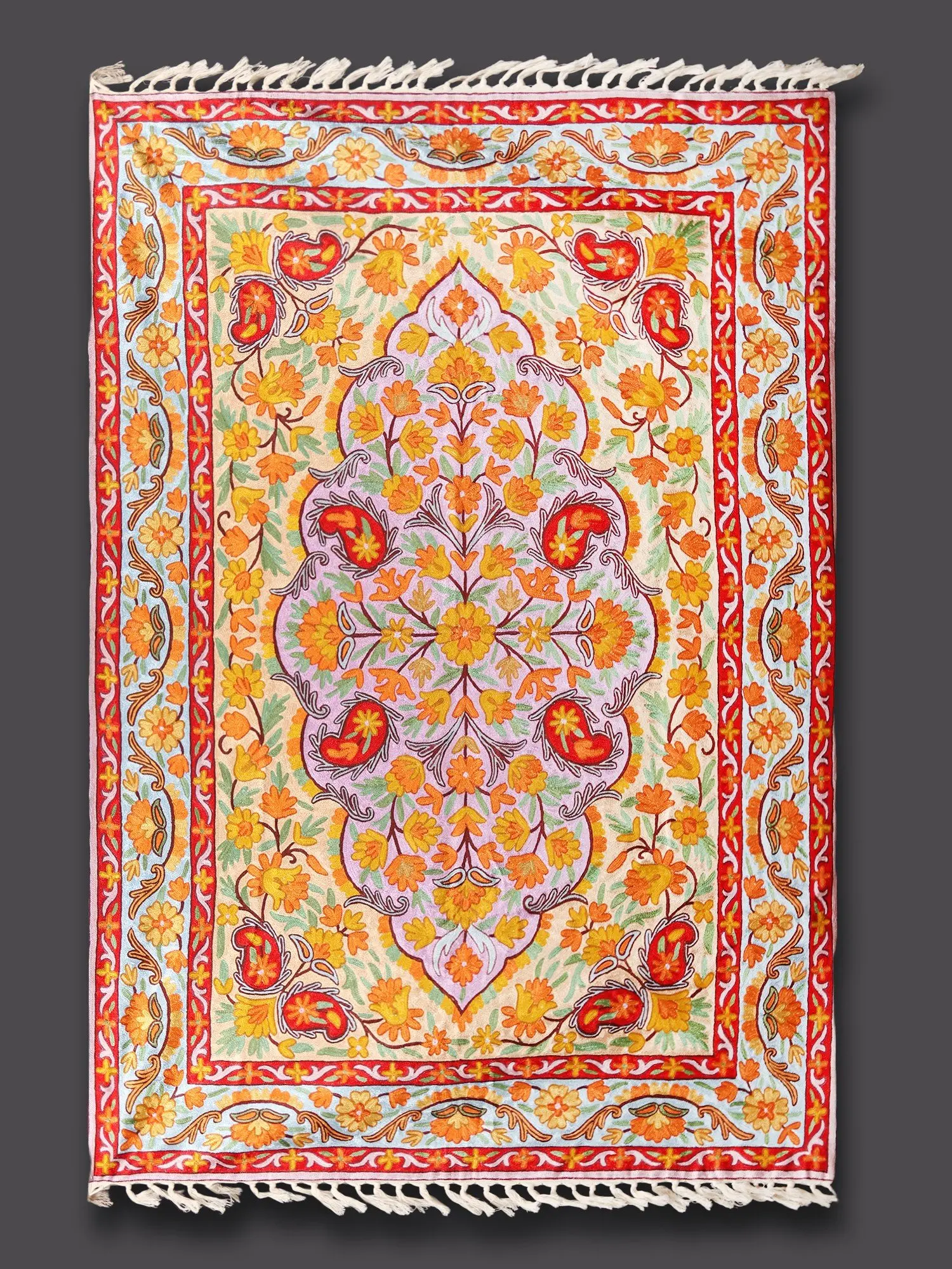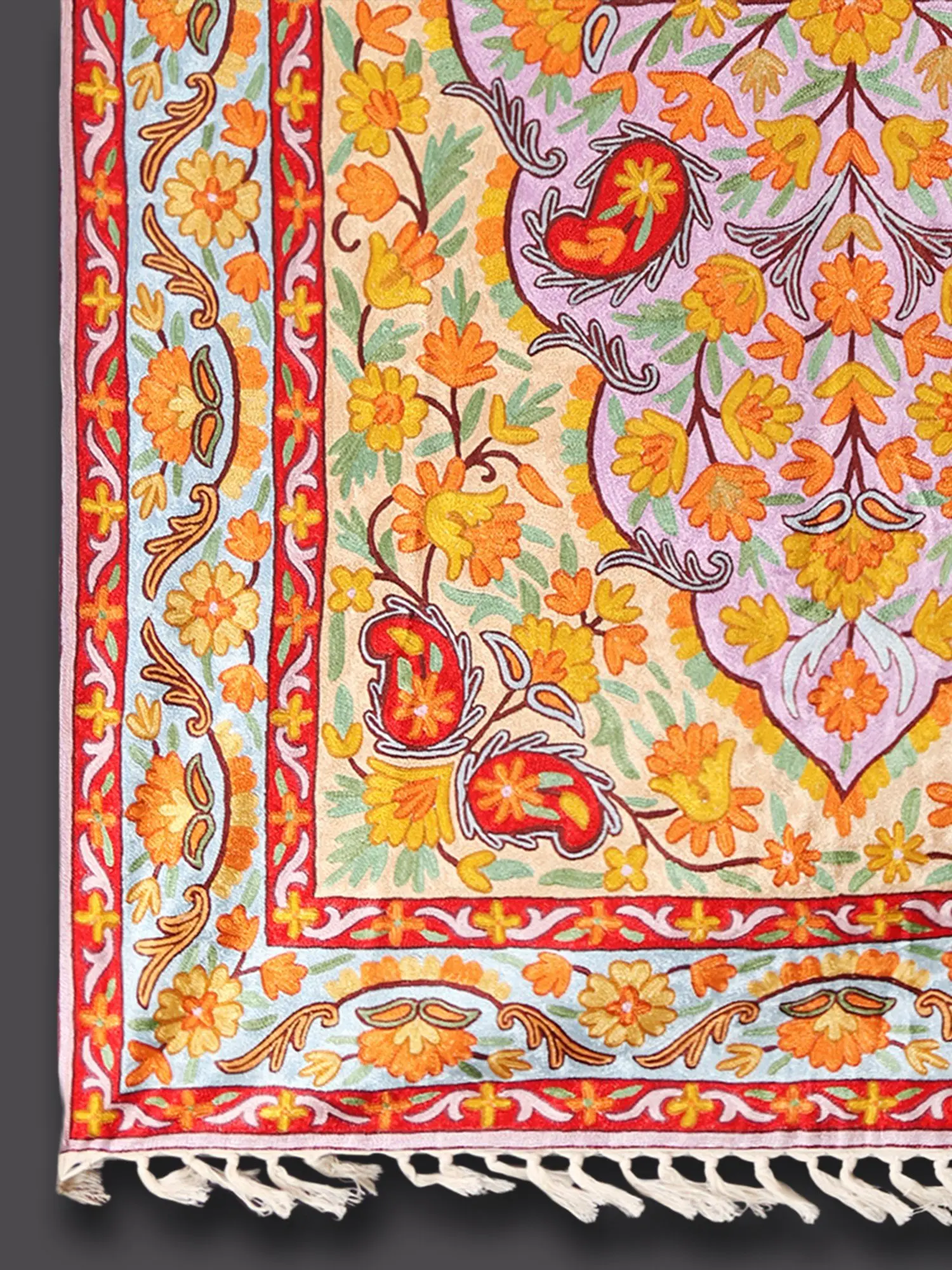 The use of tri-colors adds a dynamic touch, while the tassels provide a finishing flourish. This carpet not only brings glamour to any space but also serves as a testament to the intricate artistry of Kashmiri chain-stitching, transforming floors into a resplendent tapestry of nature's beauty.