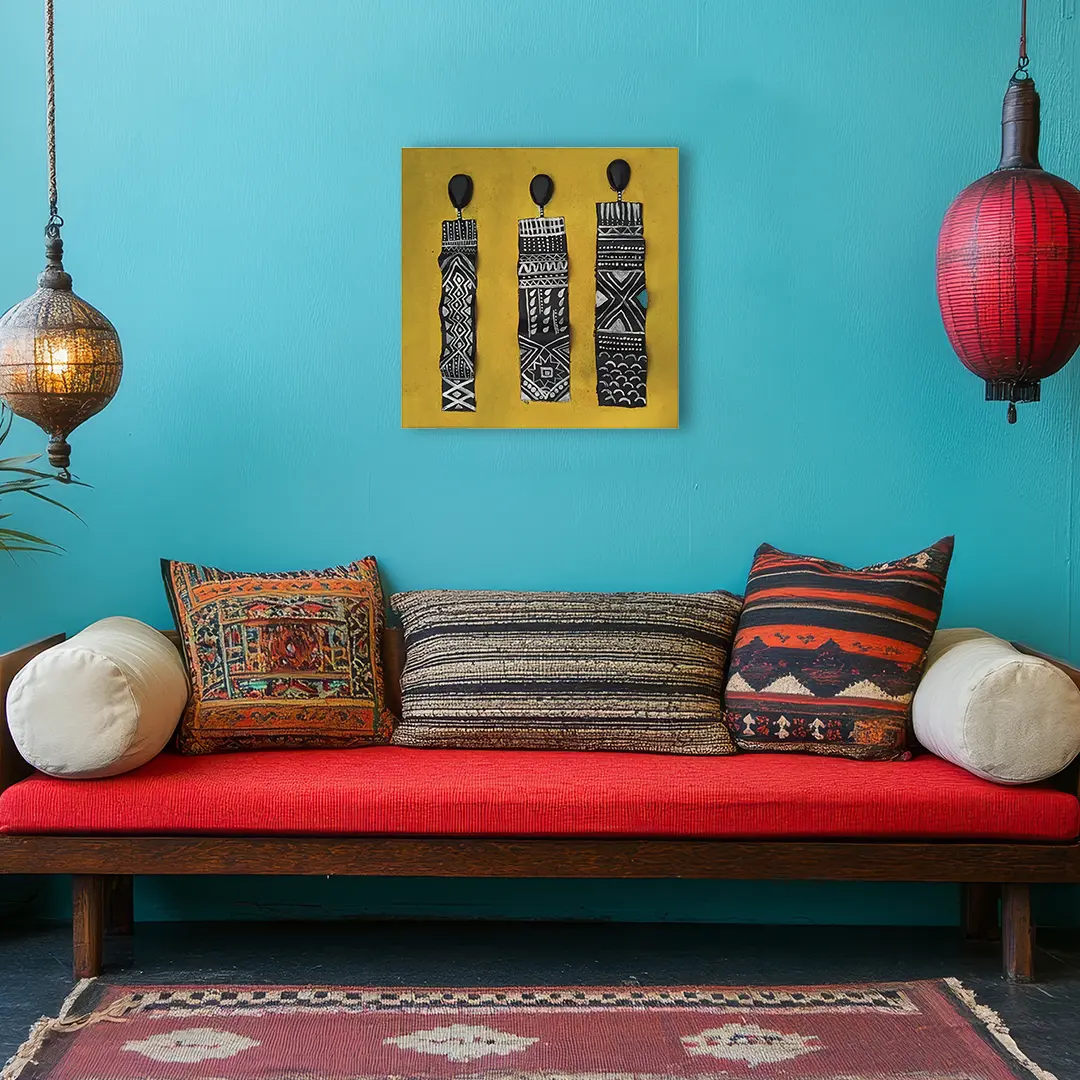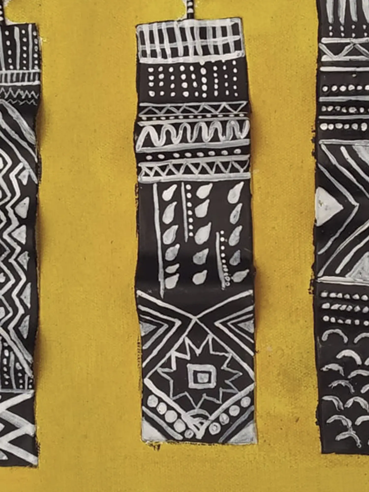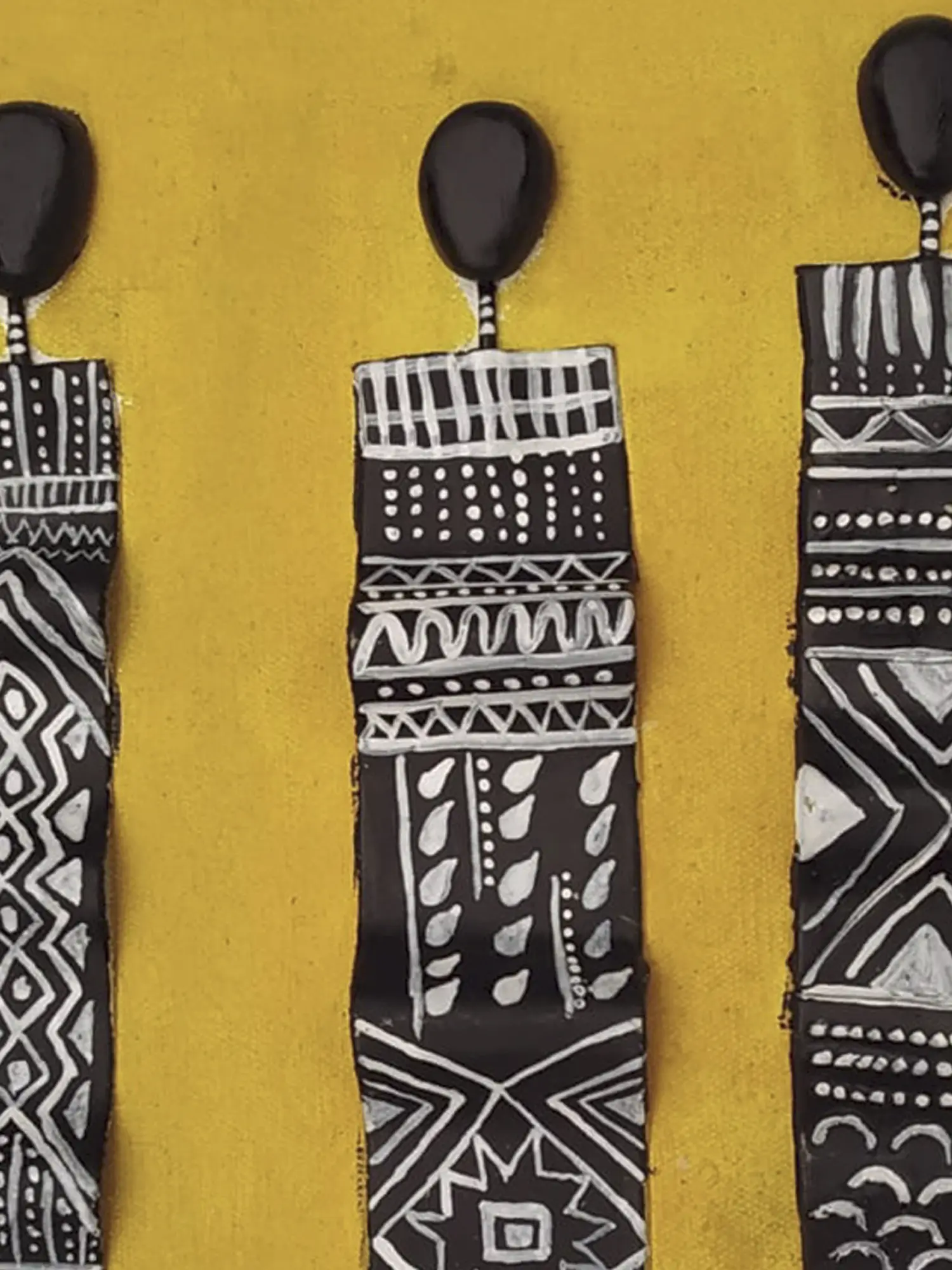 Abhishek Kumar's Mouldit Clay on Canvas, featuring Tribal Human Figures, transcends conventional artistic boundaries, delivering a unique emotional resonance. Inspired by the iconic 1985 artwork "Aisha" by Frank Frazier, this piece innovatively employs abstraction reminiscent of Renaissance art. The intentional omission of defined human features, with heads symbolized as dots and attires crafted from clay exudes a captivating mystery.