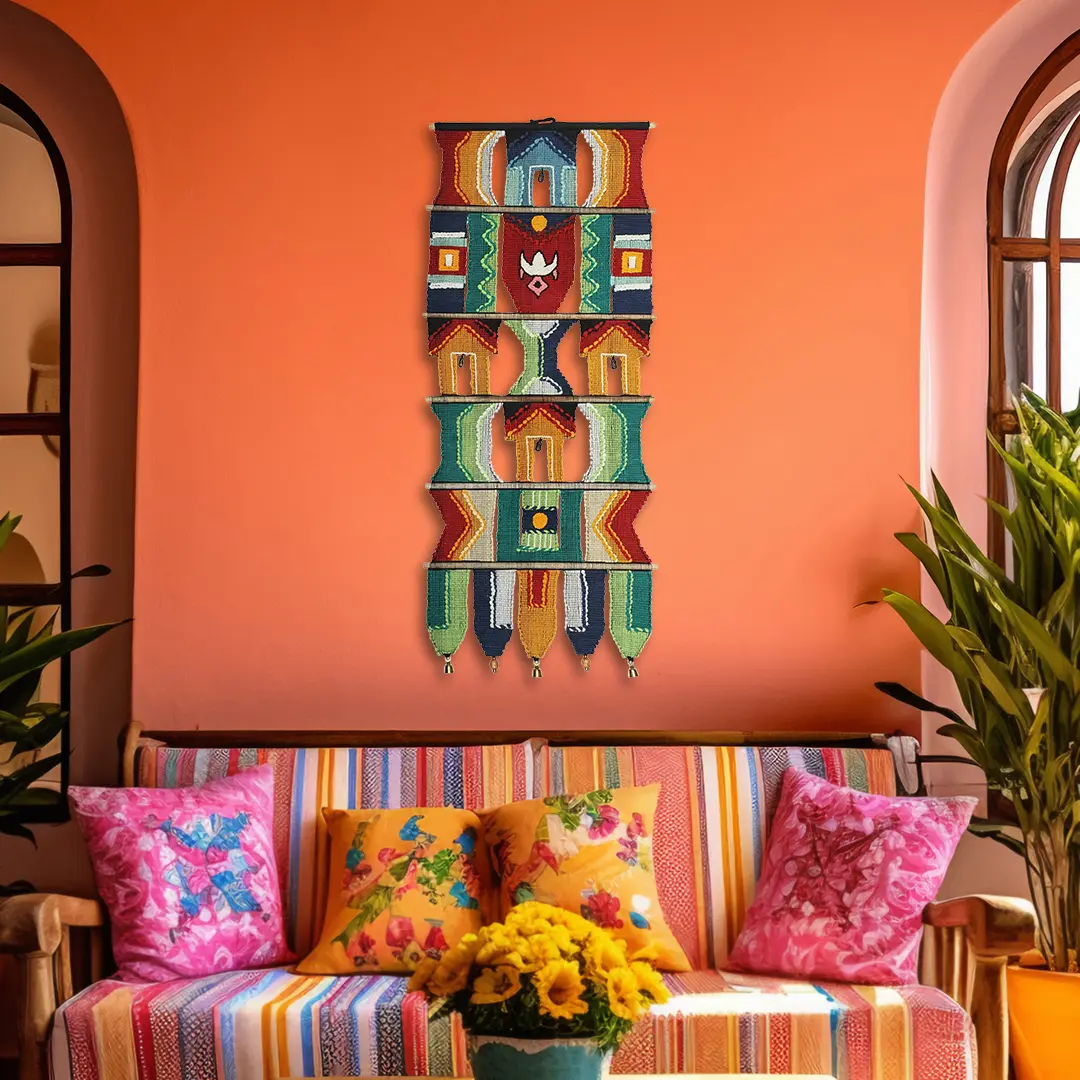 Adorn your space into a vibrant haven with this spectacular creation. Skillfully crafted with love, this masterpiece features elaborate details and brass bells that enchant with every sway. Decorate your walls with the vivid colours of tropical bliss, creating a mesmerising atmosphere that soothes the soul. Handmade from premium cotton and wood, this wall-hanging radiates warmth and authenticity. Use it to enrich your home decor or as a unique gift to captivate loved ones. Symbolising the rich cultural heritage of Maharashtra, this art piece tells a story of tradition and artistry. Immerse yourself in the spirit of craftsmanship and let this artwork weave its magic in your space.